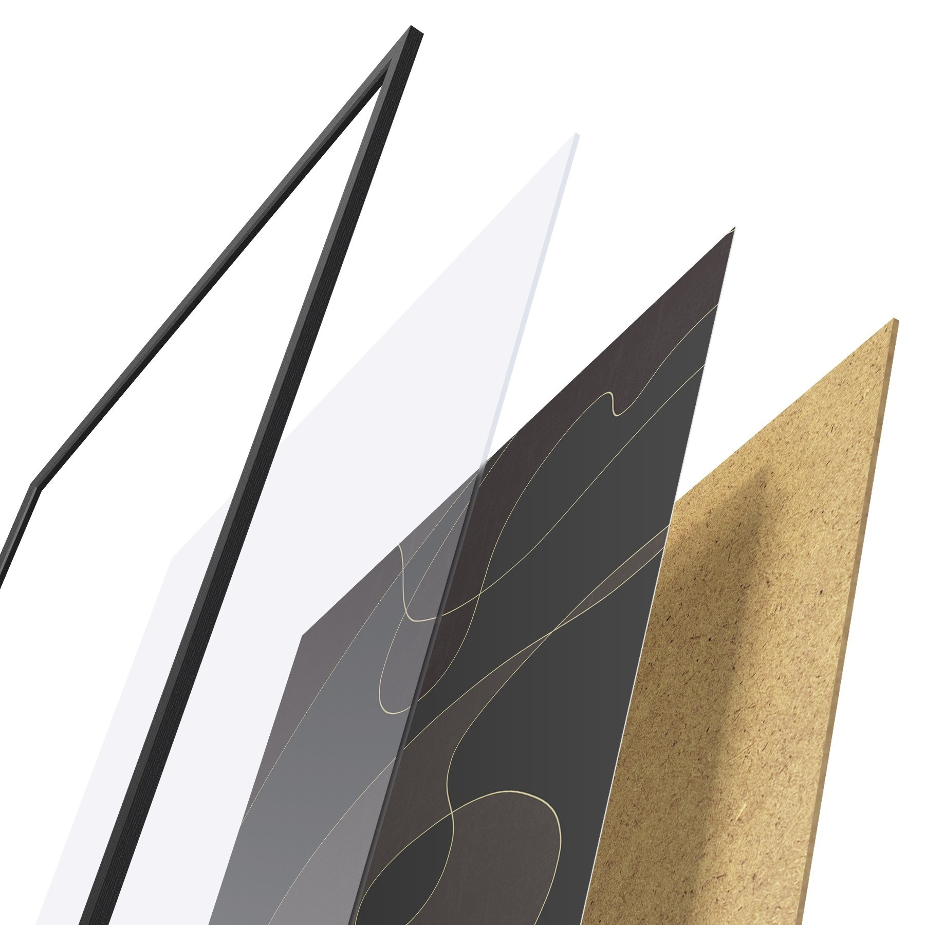 Das Poster besteht aus einem Rahmen, Plexiglas, einem gedruckten Bild und einer Rückwand aus Spanplatten. Dank der Halterungen auf der Rückseite kann das Poster sofort an die Wand gehängt werden.