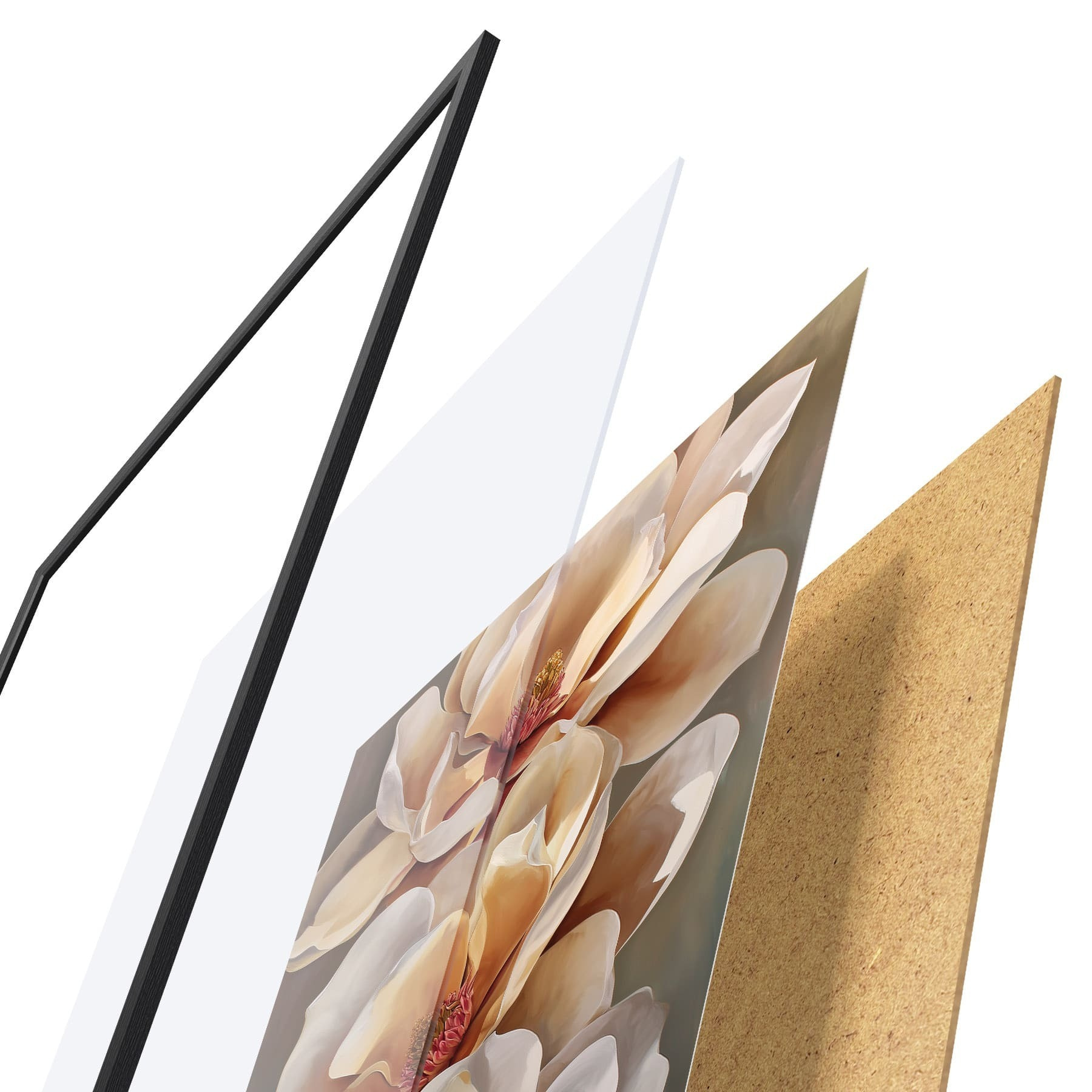 Das Poster besteht aus einem Rahmen, Plexiglas, einem gedruckten Bild und einer Rückwand aus Spanplatten. Dank der Halterungen auf der Rückseite kann das Poster sofort an die Wand gehängt werden.