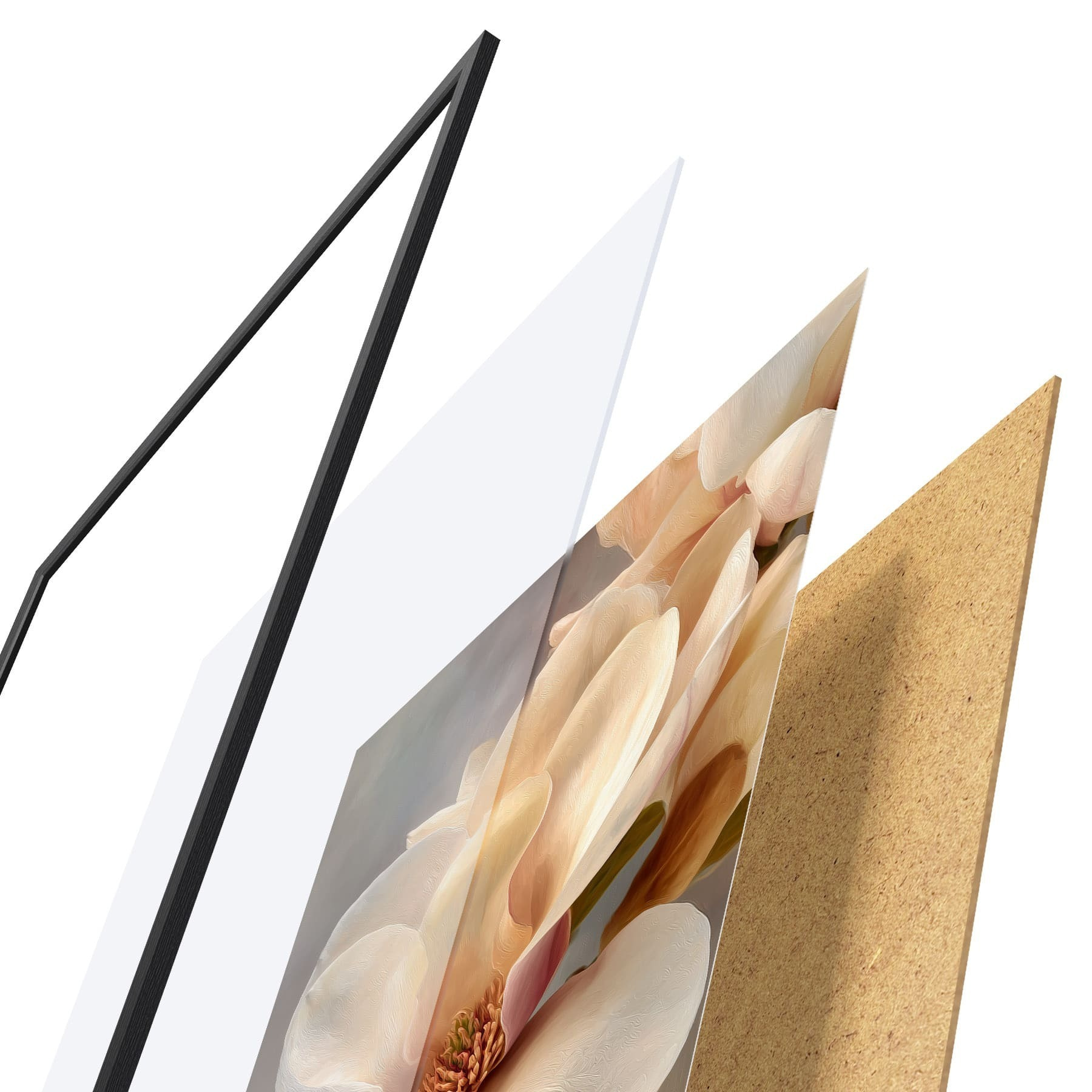 Das Poster besteht aus einem Rahmen, Plexiglas, einem gedruckten Bild und einer Rückwand aus Spanplatten. Dank der Halterungen auf der Rückseite kann das Poster sofort an die Wand gehängt werden.