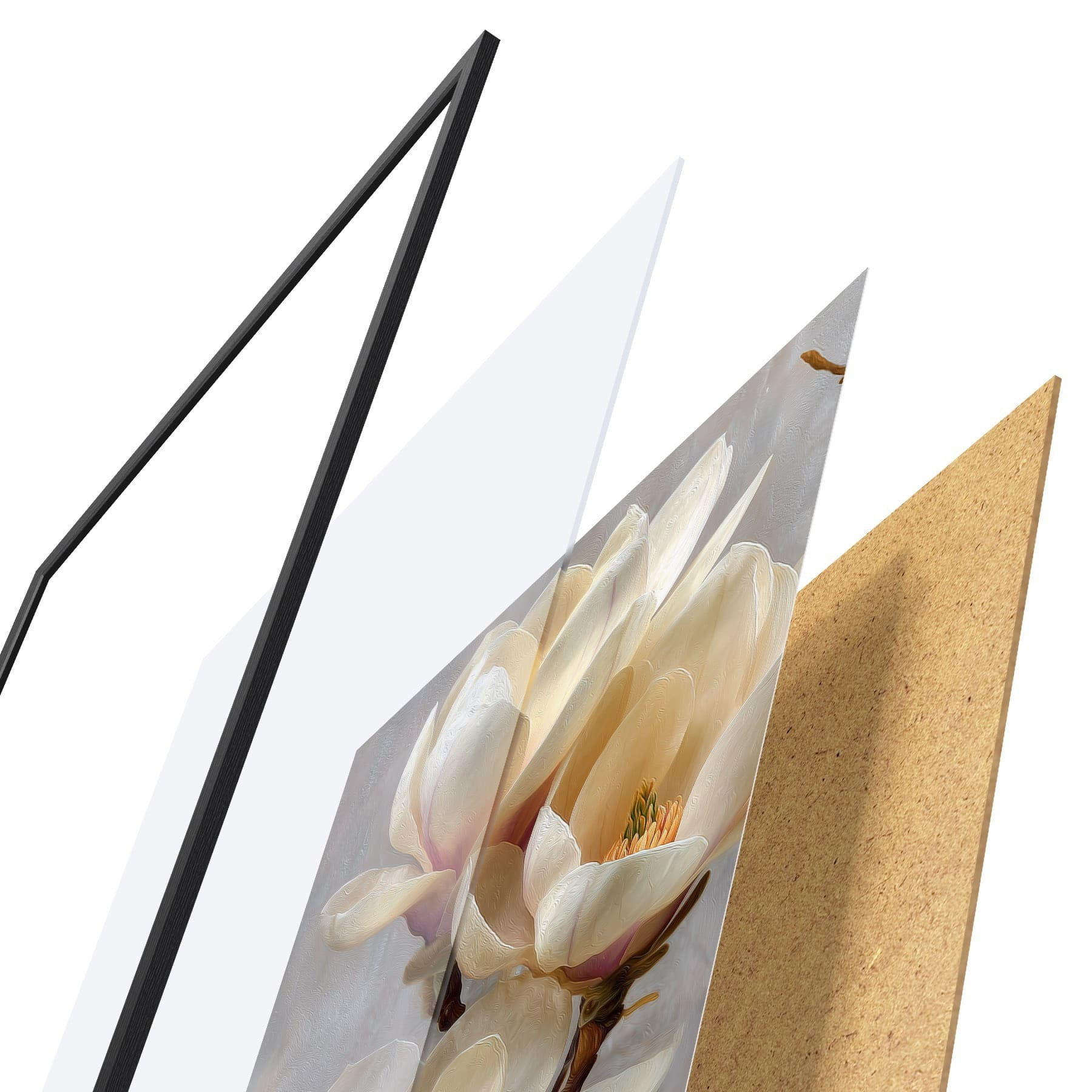 Das Poster besteht aus einem Rahmen, Plexiglas, einem gedruckten Bild und einer Rückwand aus Spanplatten. Dank der Halterungen auf der Rückseite kann das Poster sofort an die Wand gehängt werden.
