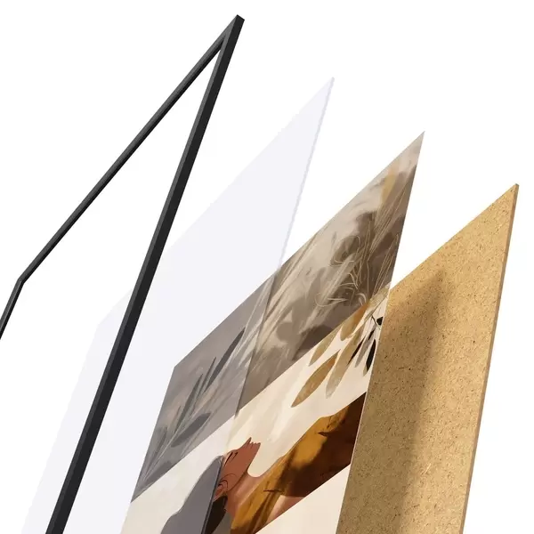 Das Poster besteht aus einem Rahmen, Plexiglas, einem gedruckten Bild und einer Rückwand aus Spanplatten. Dank der Halterungen auf der Rückseite kann das Poster sofort an die Wand gehängt werden.