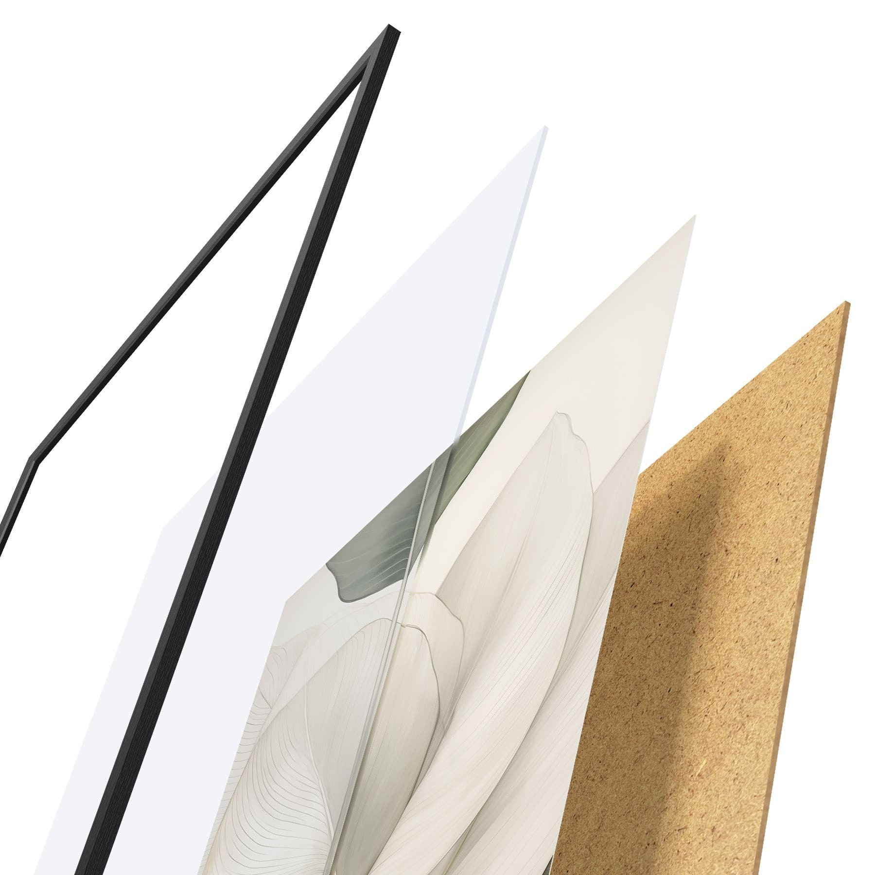 Das Poster besteht aus einem Rahmen, Plexiglas, einem gedruckten Bild und einer Rückwand aus Spanplatten. Dank der Halterungen auf der Rückseite kann das Poster sofort an die Wand gehängt werden.