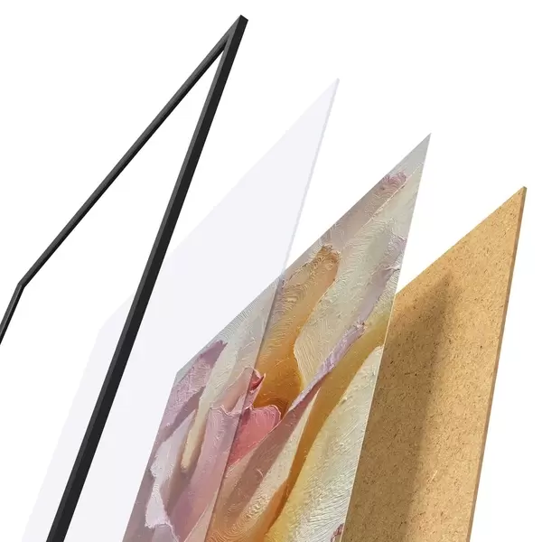 Das Poster besteht aus einem Rahmen, Plexiglas, einem gedruckten Bild und einer Rückwand aus Spanplatten. Dank der Halterungen auf der Rückseite kann das Poster sofort an die Wand gehängt werden.