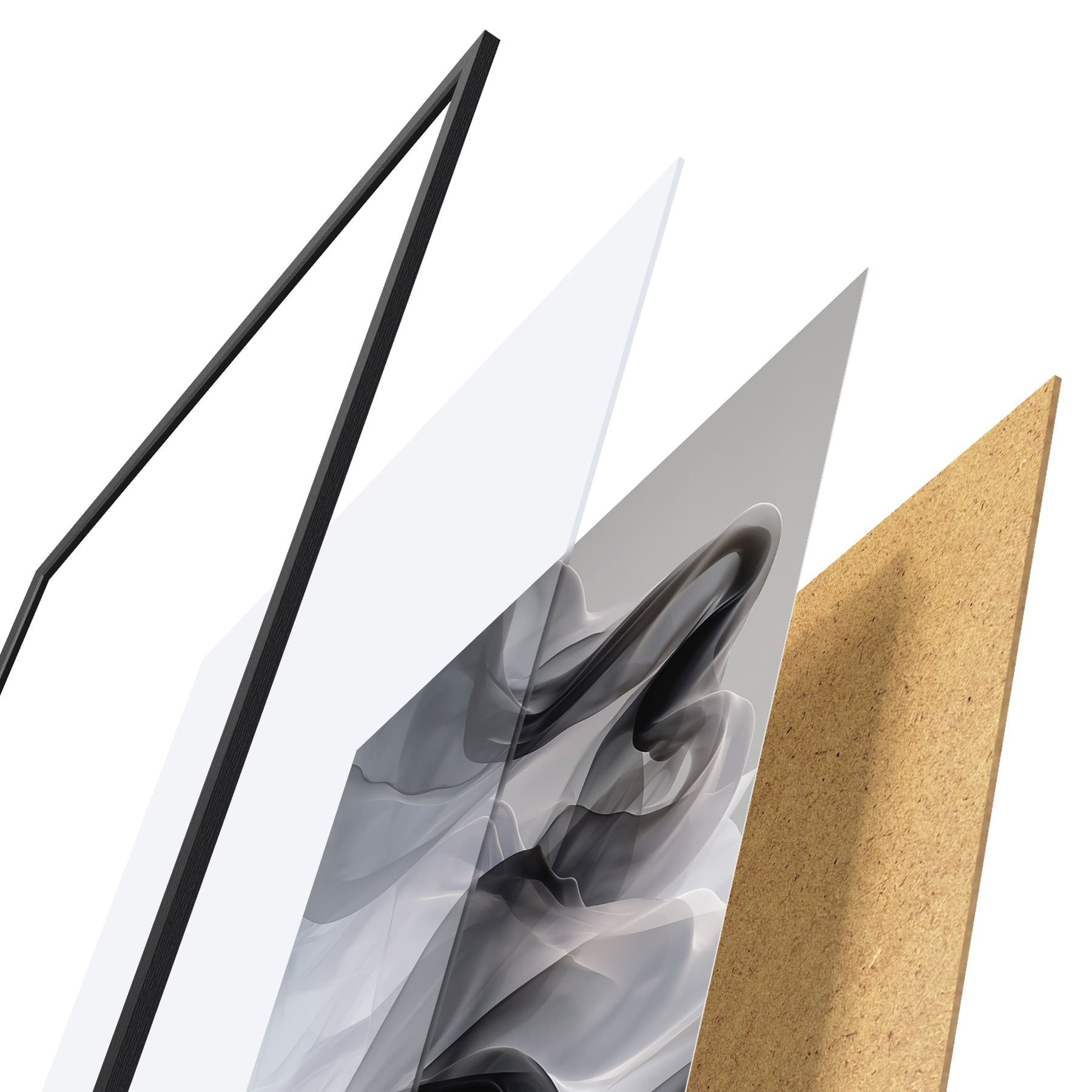Das Poster besteht aus einem Rahmen, Plexiglas, einem gedruckten Bild und einer Rückwand aus Spanplatten. Dank der Halterungen auf der Rückseite kann das Poster sofort an die Wand gehängt werden.