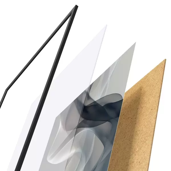 Das Poster besteht aus einem Rahmen, Plexiglas, einem gedruckten Bild und einer Rückwand aus Spanplatten. Dank der Halterungen auf der Rückseite kann das Poster sofort an die Wand gehängt werden.