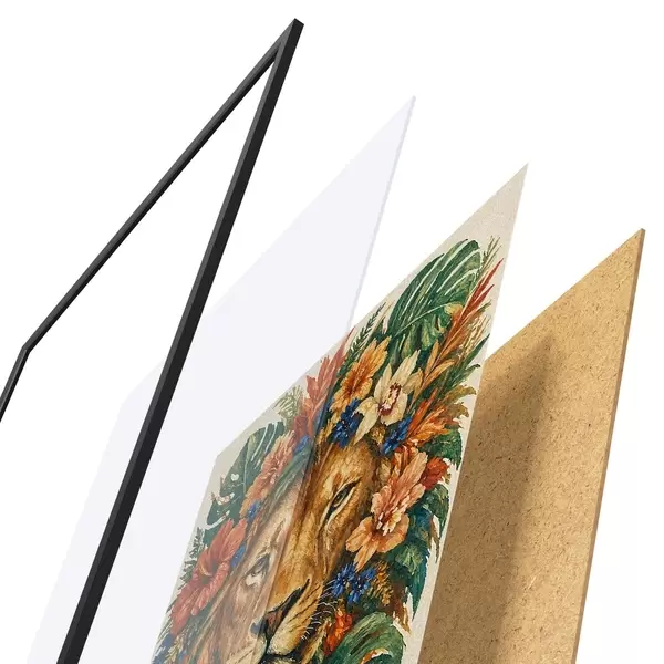 Das Poster besteht aus einem Rahmen, Plexiglas, einem gedruckten Bild und einer Rückwand aus Spanplatten. Dank der Halterungen auf der Rückseite kann das Poster sofort an die Wand gehängt werden.