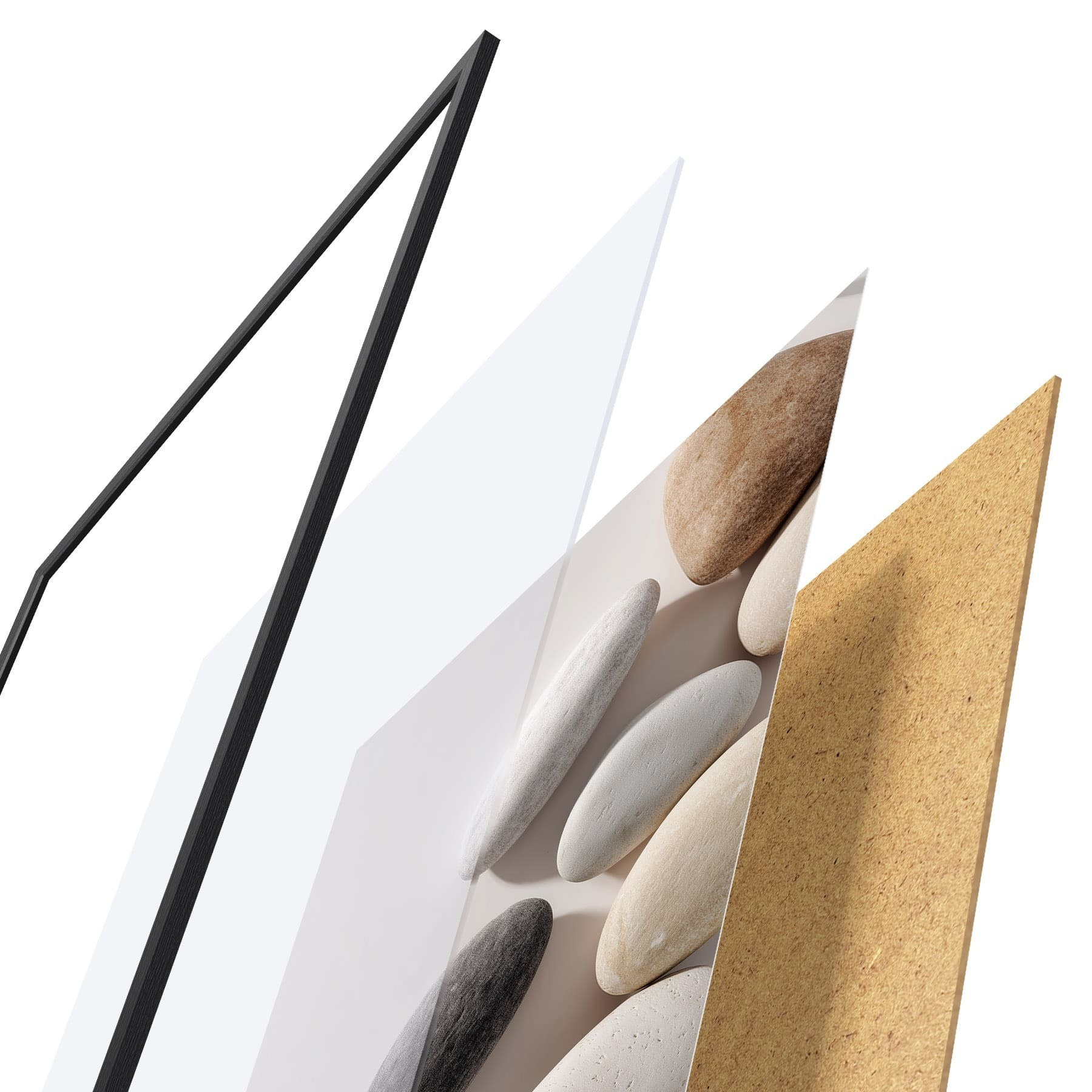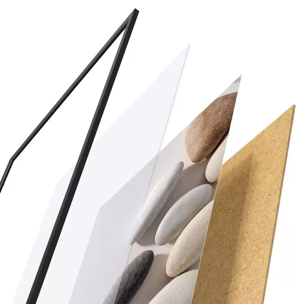 Das Poster besteht aus einem Rahmen, Plexiglas, einem gedruckten Bild und einer Rückwand aus Spanplatten. Dank der Halterungen auf der Rückseite kann das Poster sofort an die Wand gehängt werden.