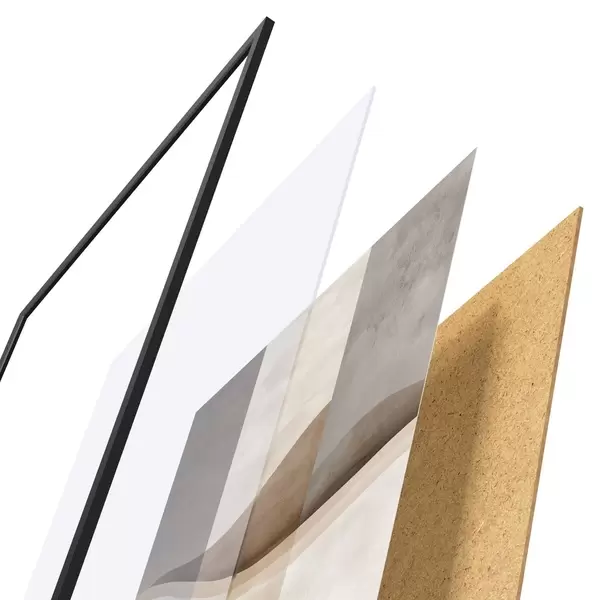 Das Poster besteht aus einem Rahmen, Plexiglas, einem gedruckten Bild und einer Rückwand aus Spanplatten. Dank der Halterungen auf der Rückseite kann das Poster sofort an die Wand gehängt werden.