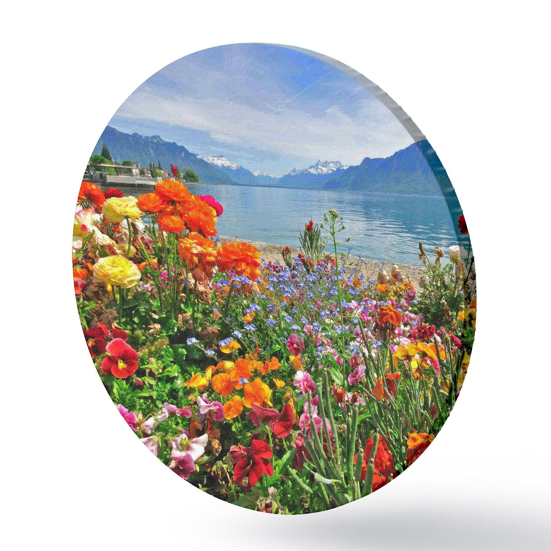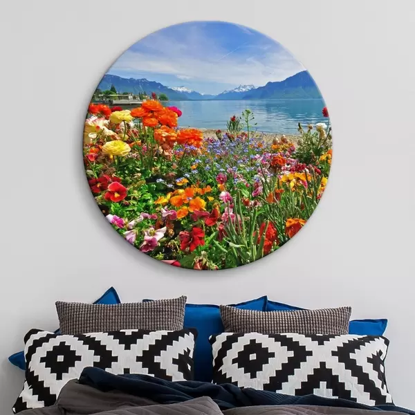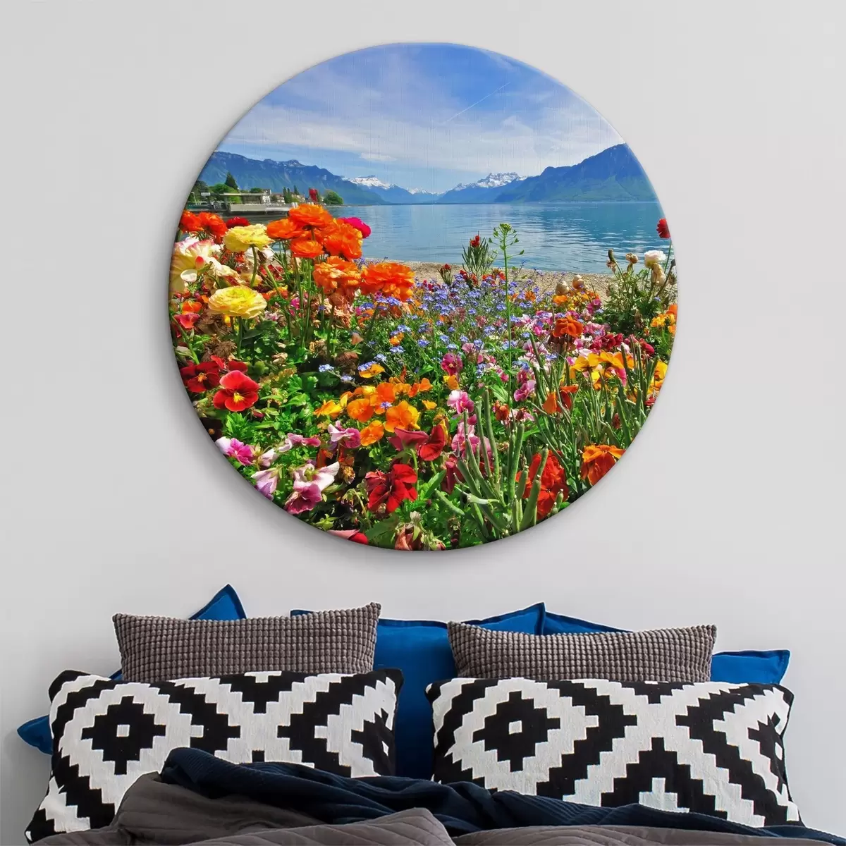 Runde Gemälde Wasser, Himmel und Blumen r00006