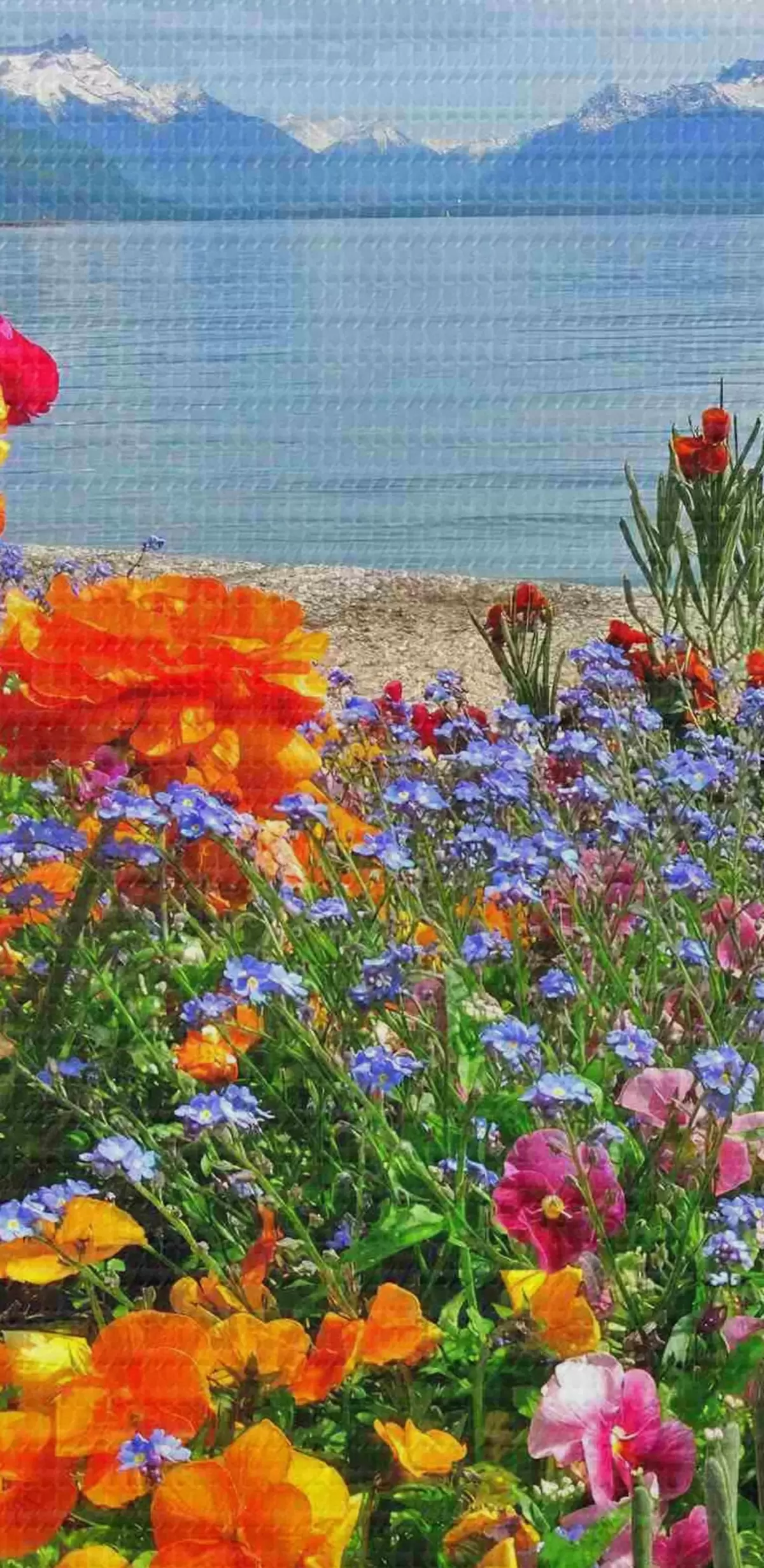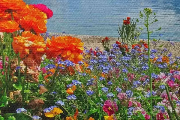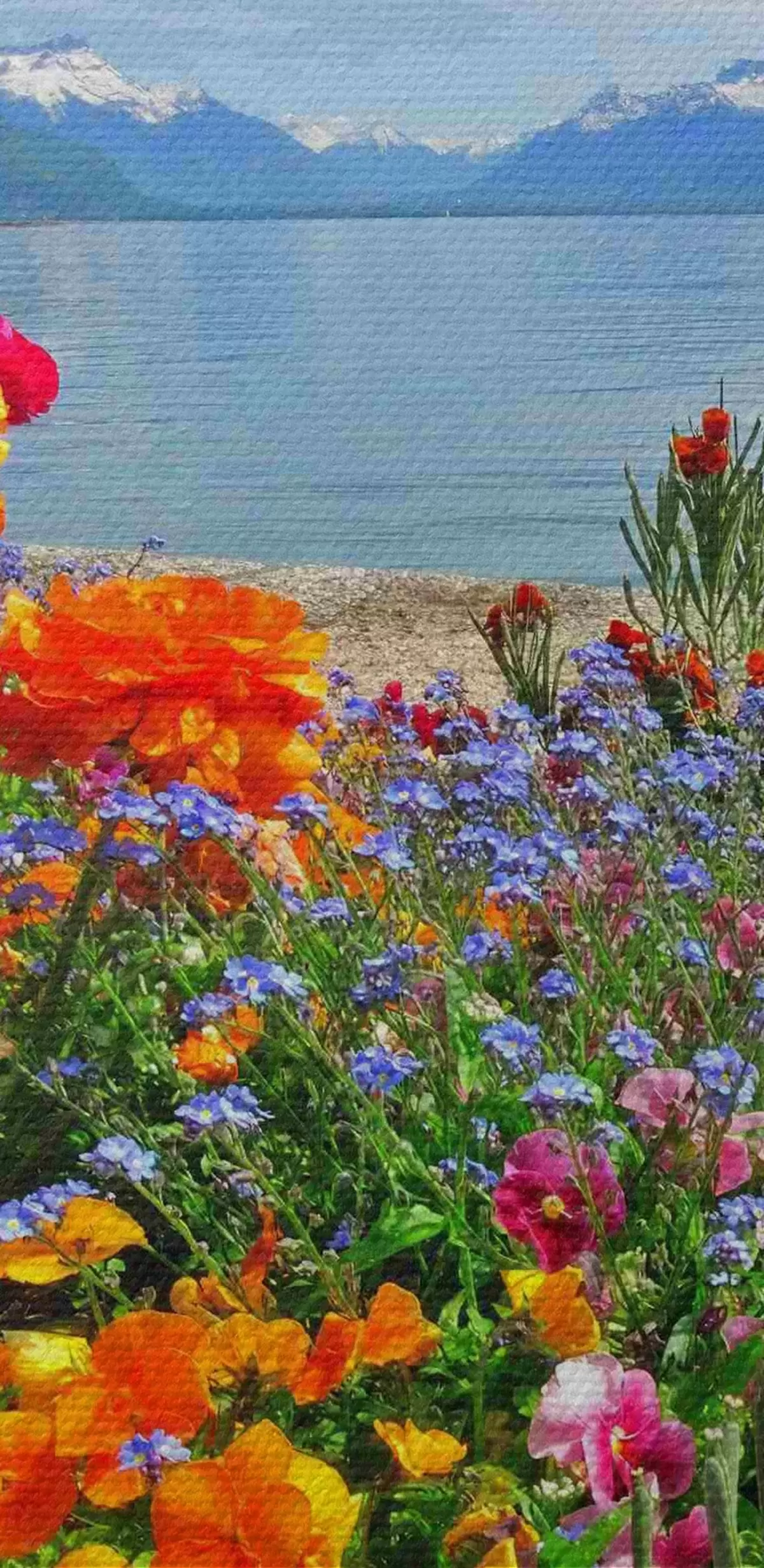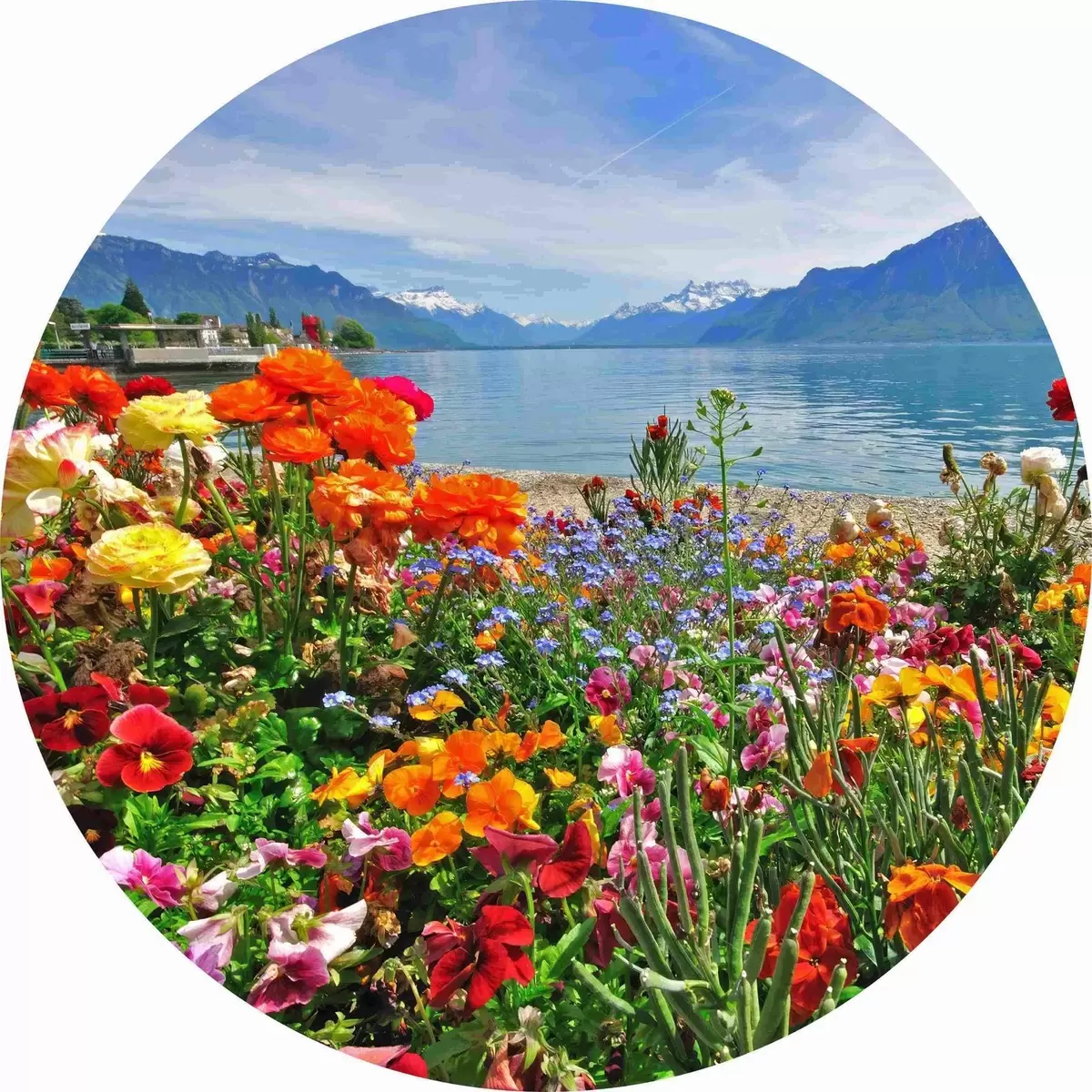 Runde Gemälde Wasser, Himmel und Blumen r00006