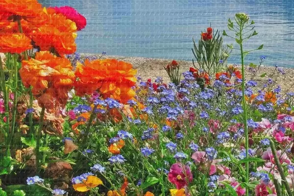 Runde Gemälde Wasser, Himmel und Blumen r00006