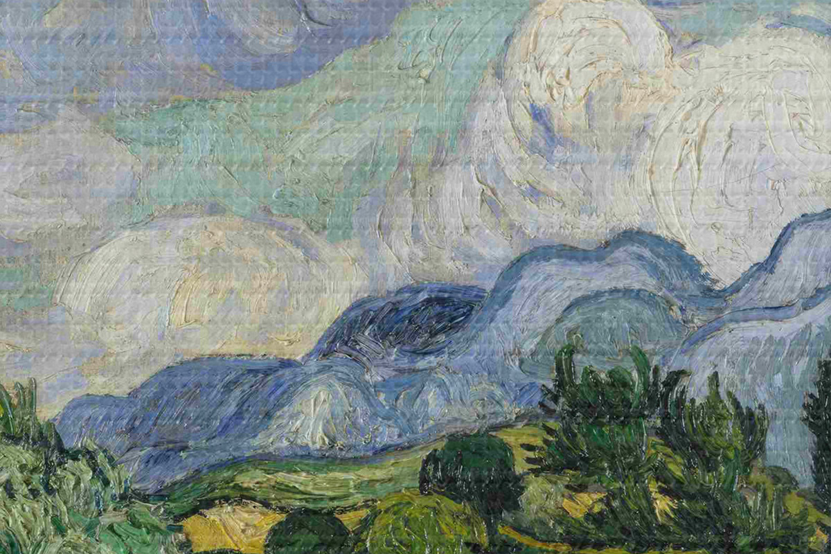 Um die Leinwand auf Keilrahmen zu spannen, ohne das Bild zu beschädigen, verwenden wir ein gespiegeltes Bild.