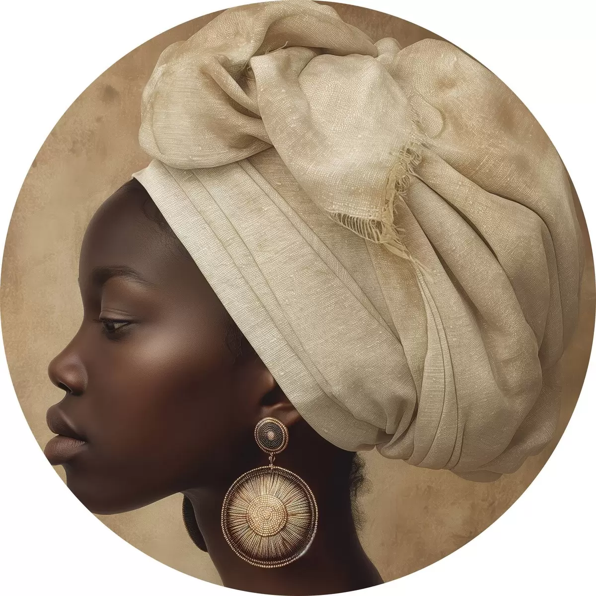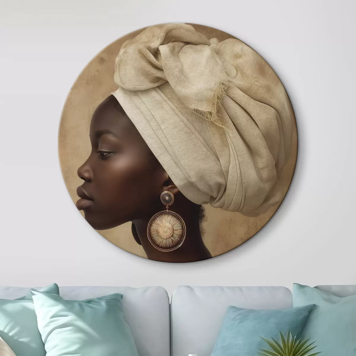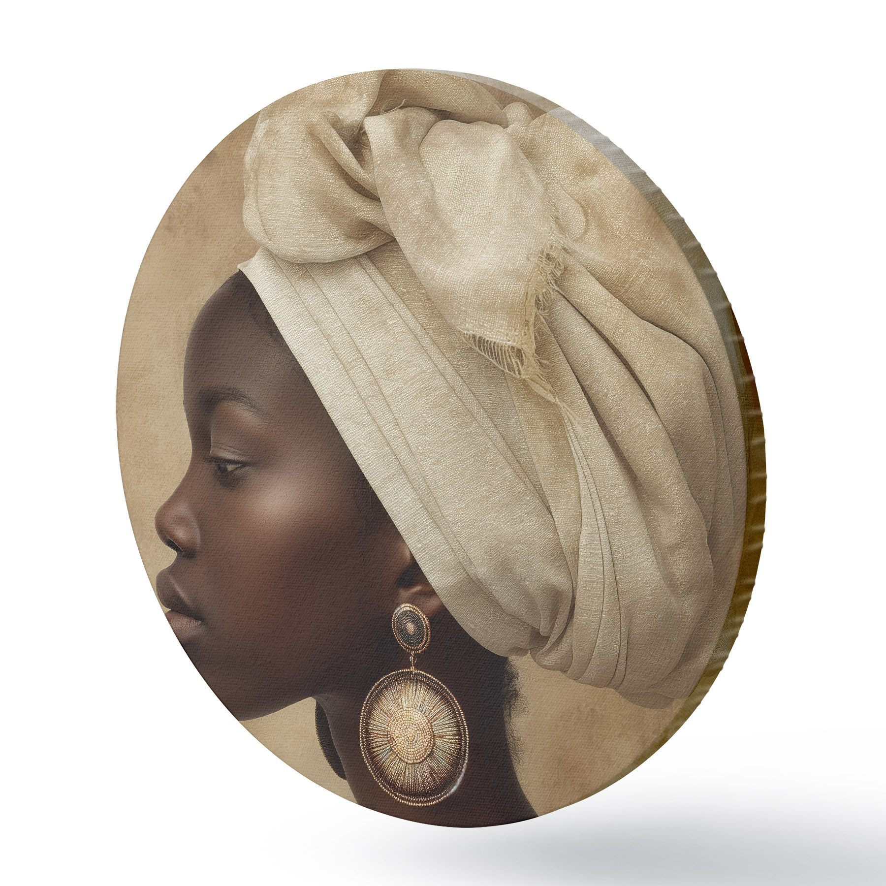 Runde Gemälde beiges Frauenporträt im afrikanischen Stil im Profil mit großen Ohrringen r26120