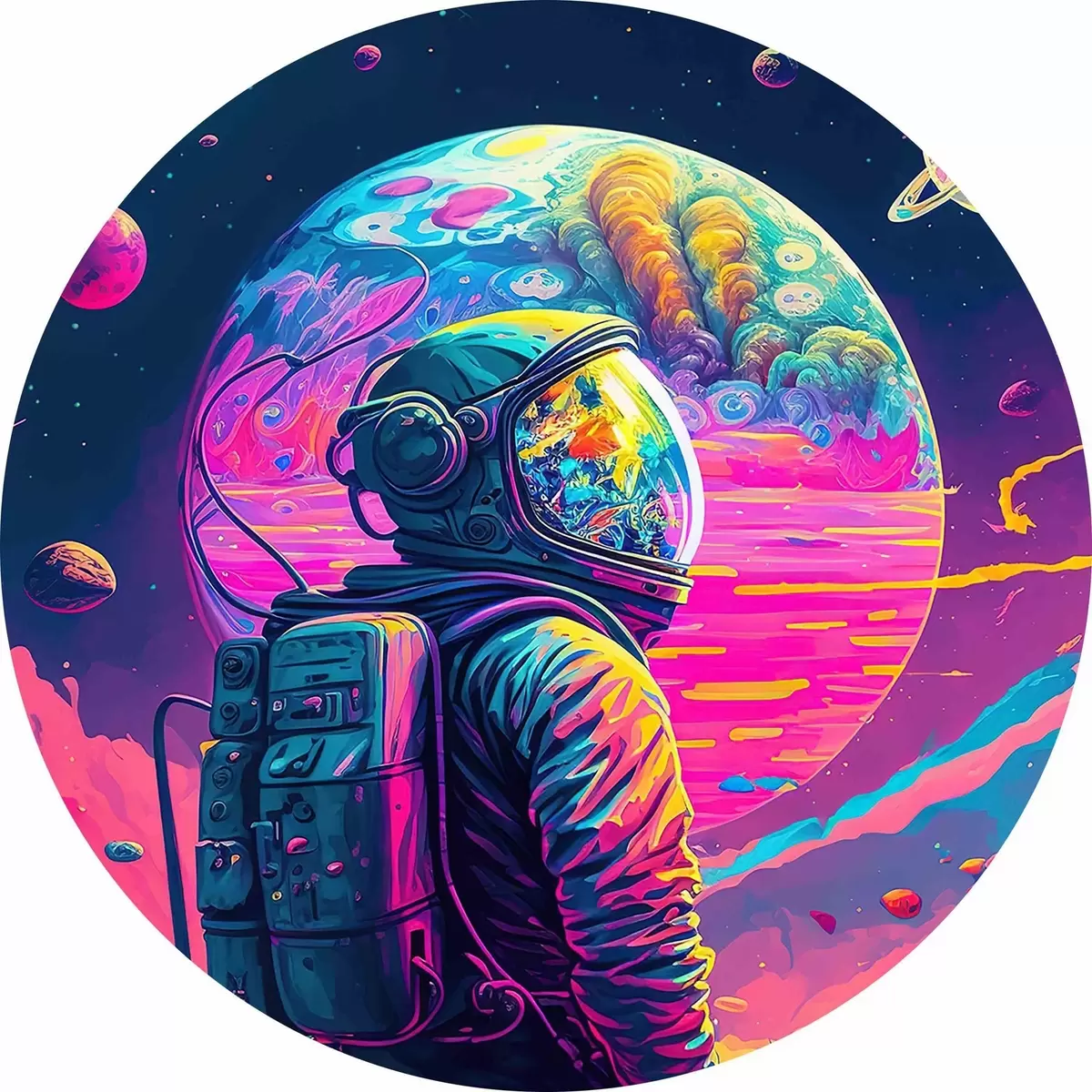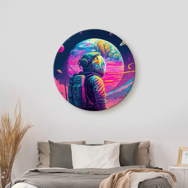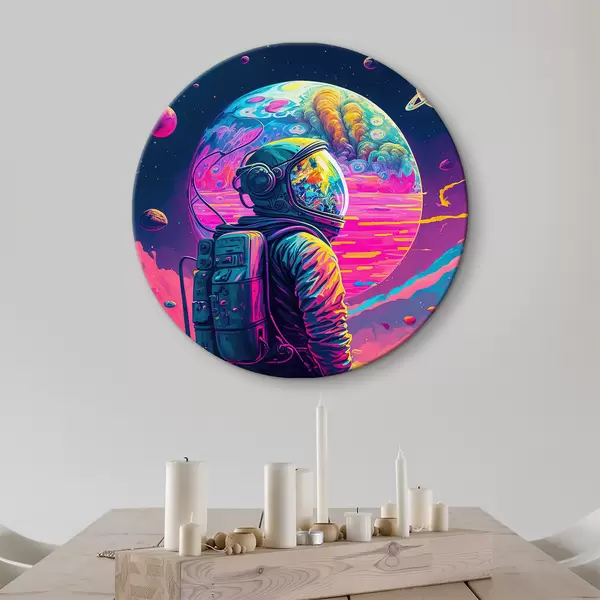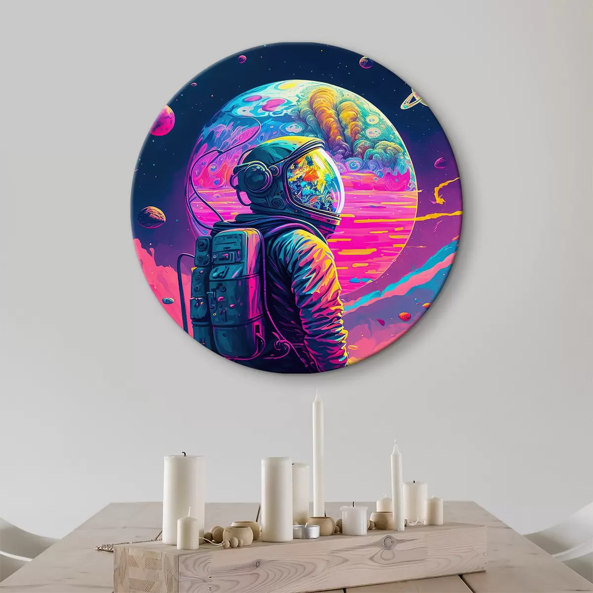 Runde Gemälde Illustration einer zukünftigen Landschaft mit Bergen, Planeten und Mond r33058