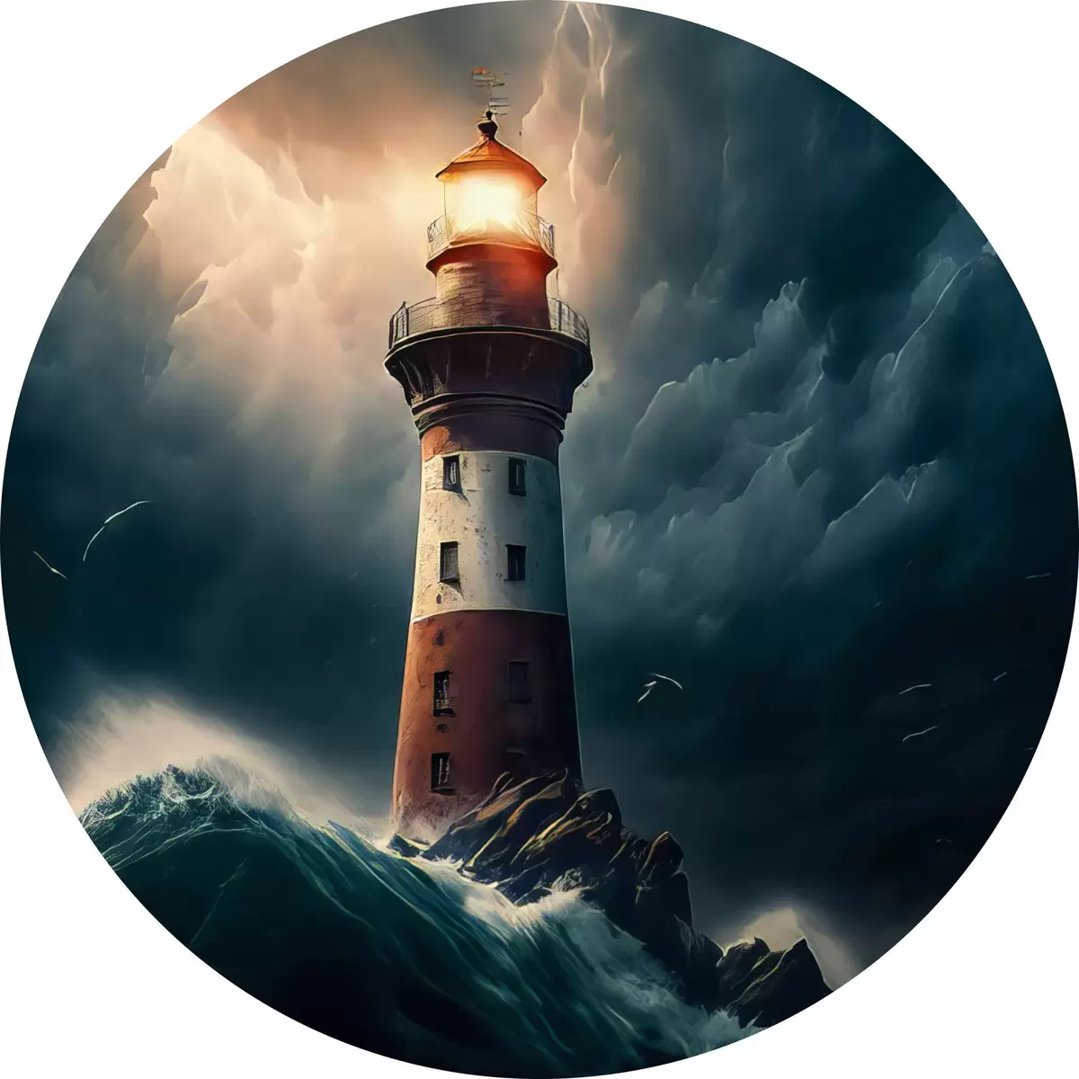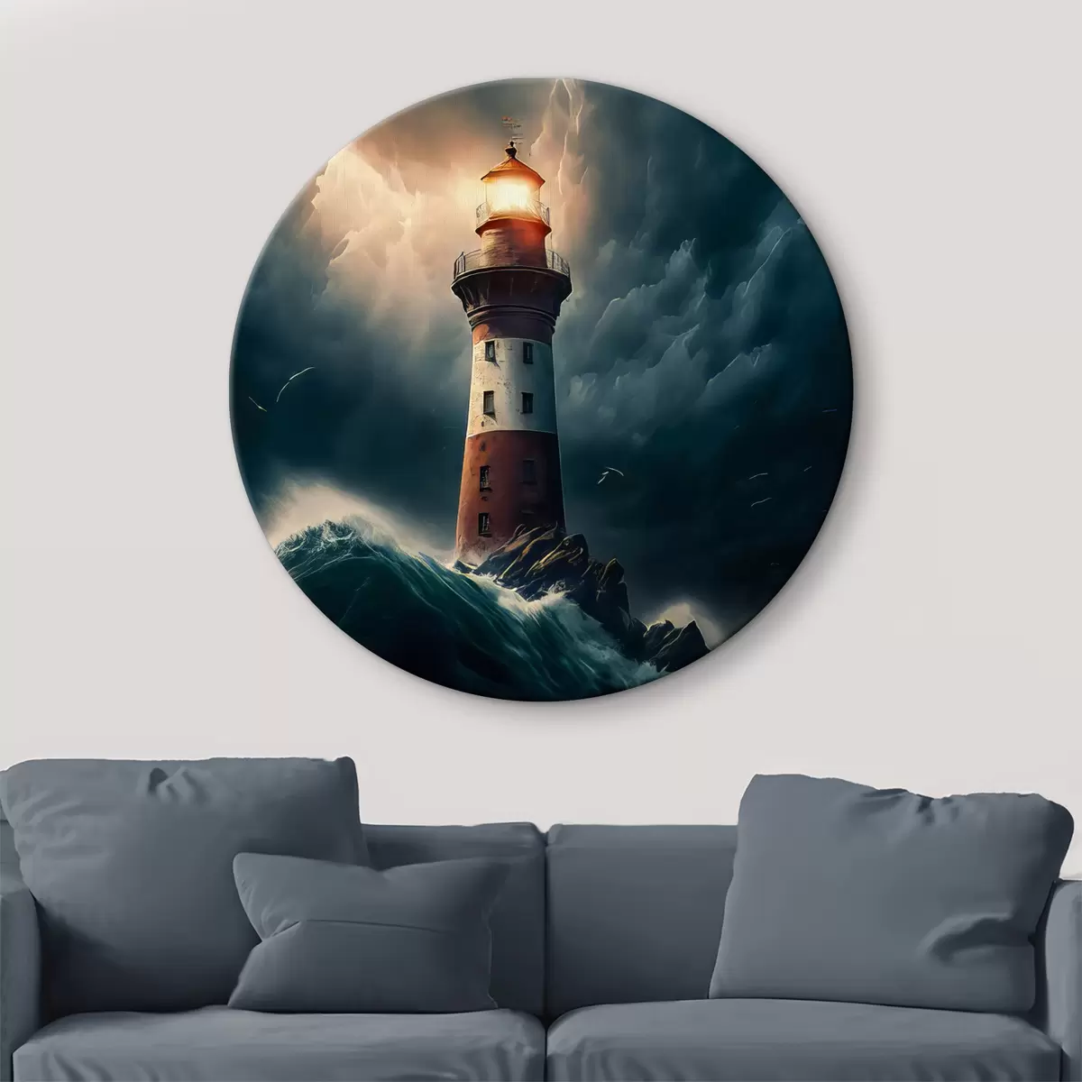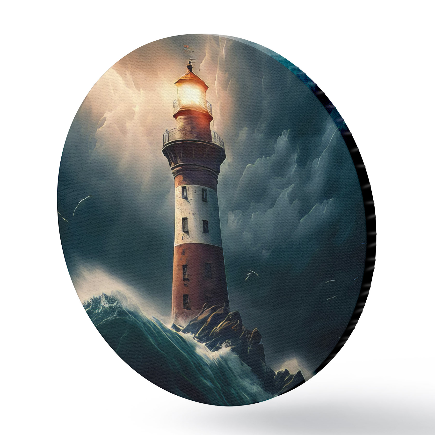 Runde Gemälde Malerischer Leuchtturm auf einer einsamen Insel während eines Sturms r35349