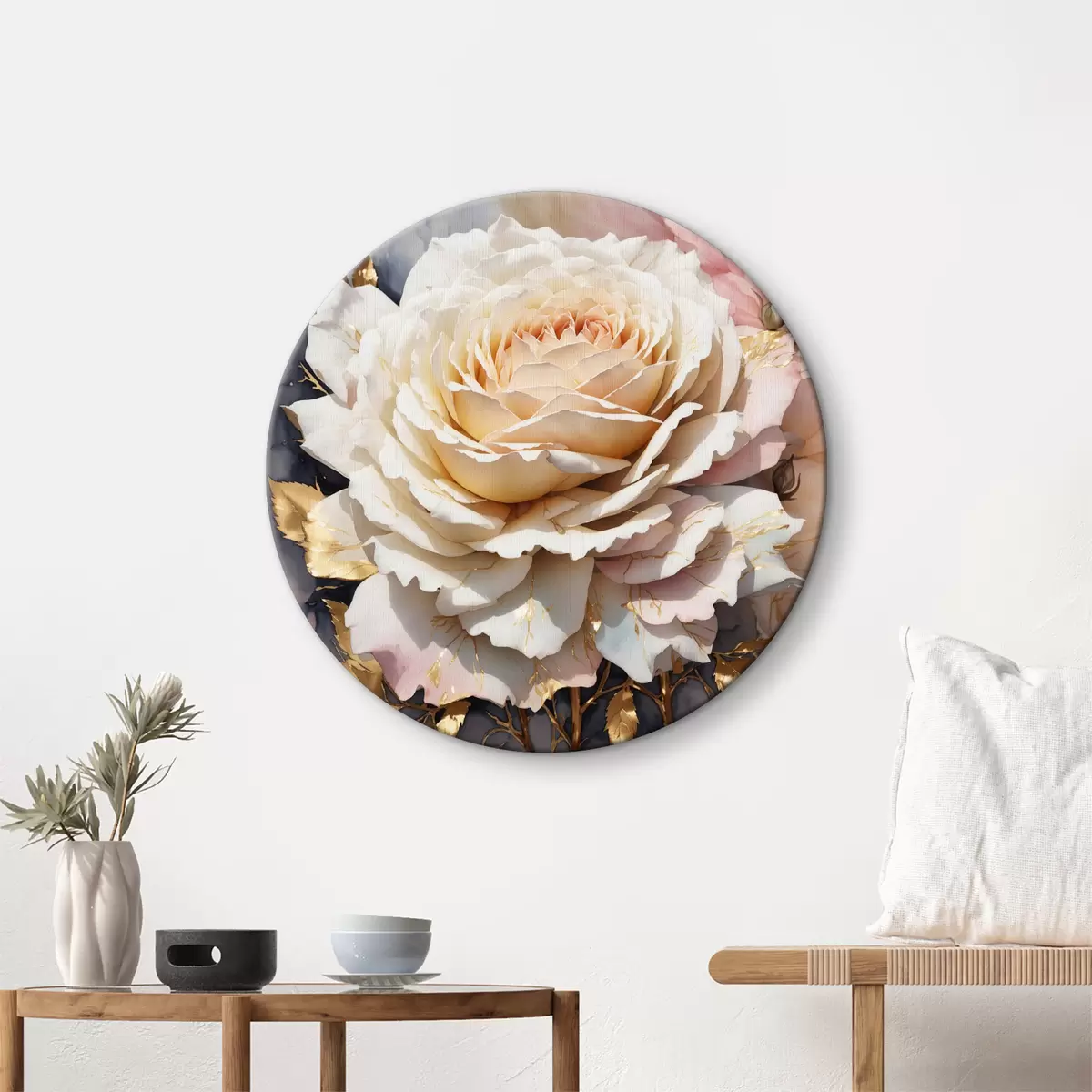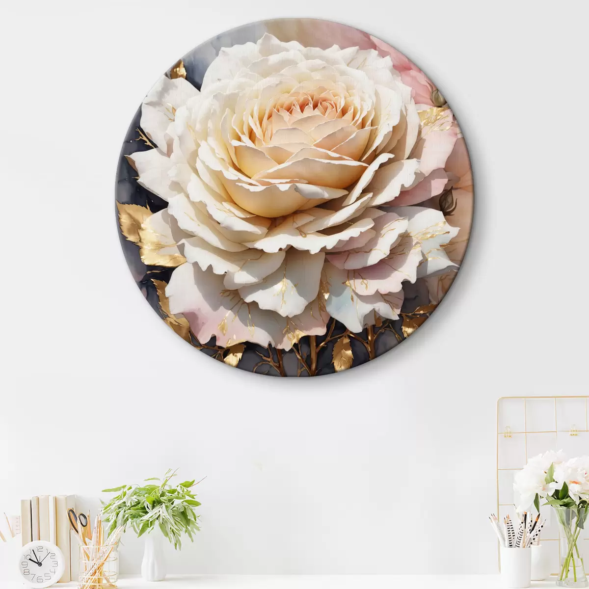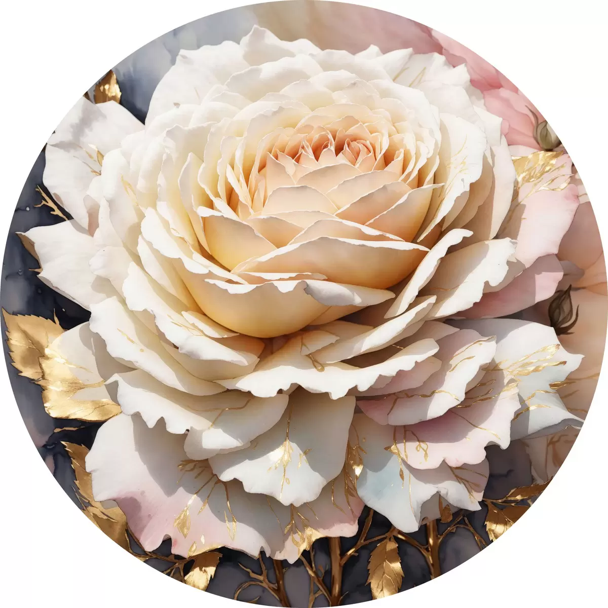 Runde Gemälde Weiße Rose in Aquarell mit Blättern r35662