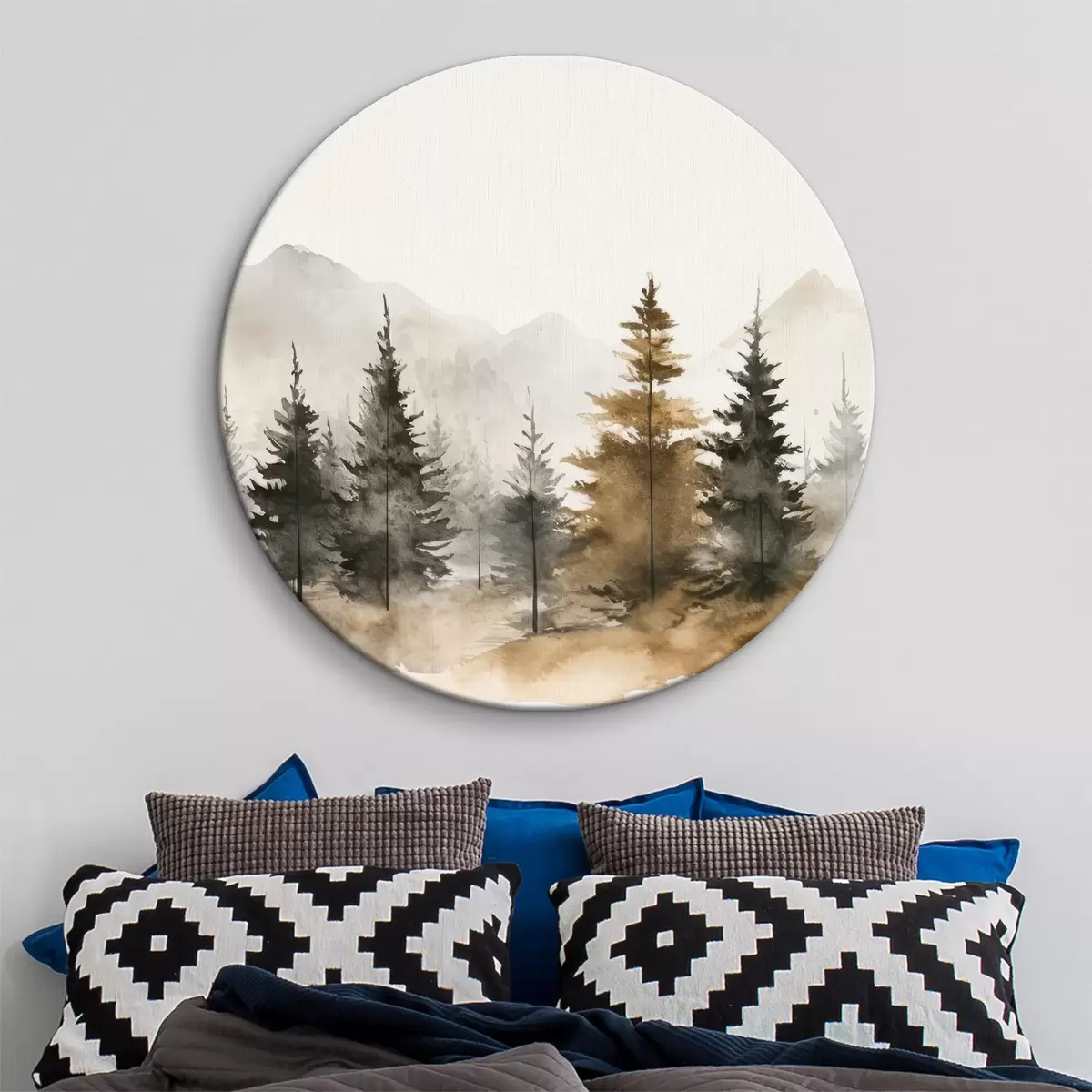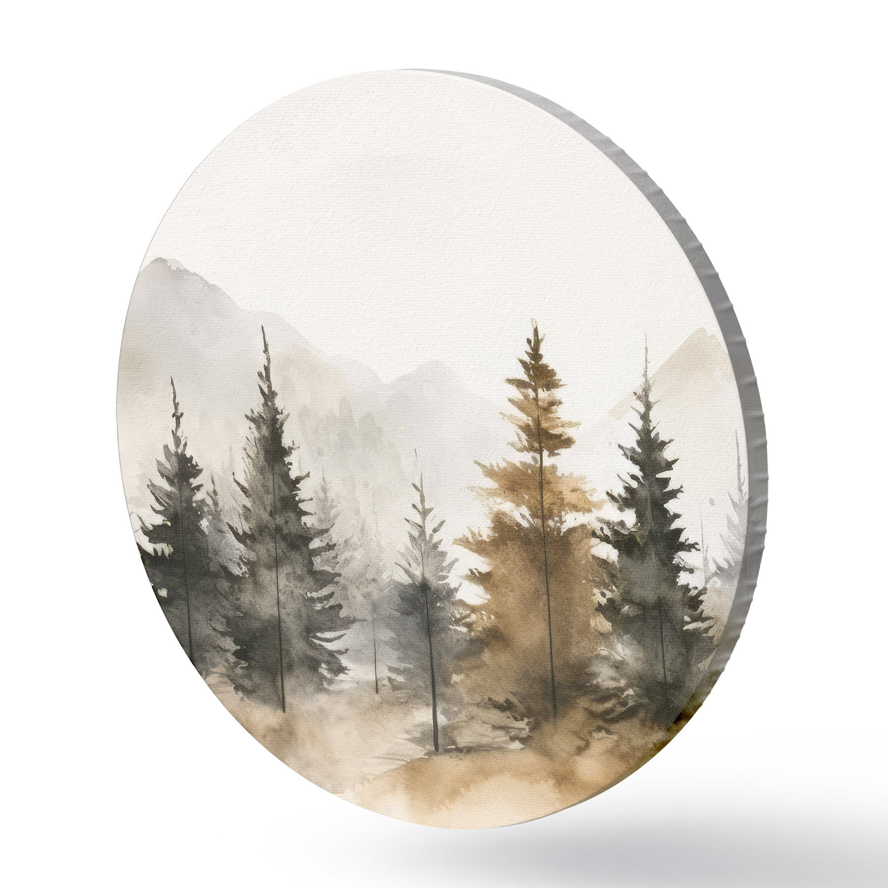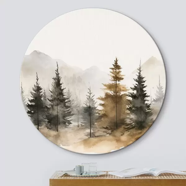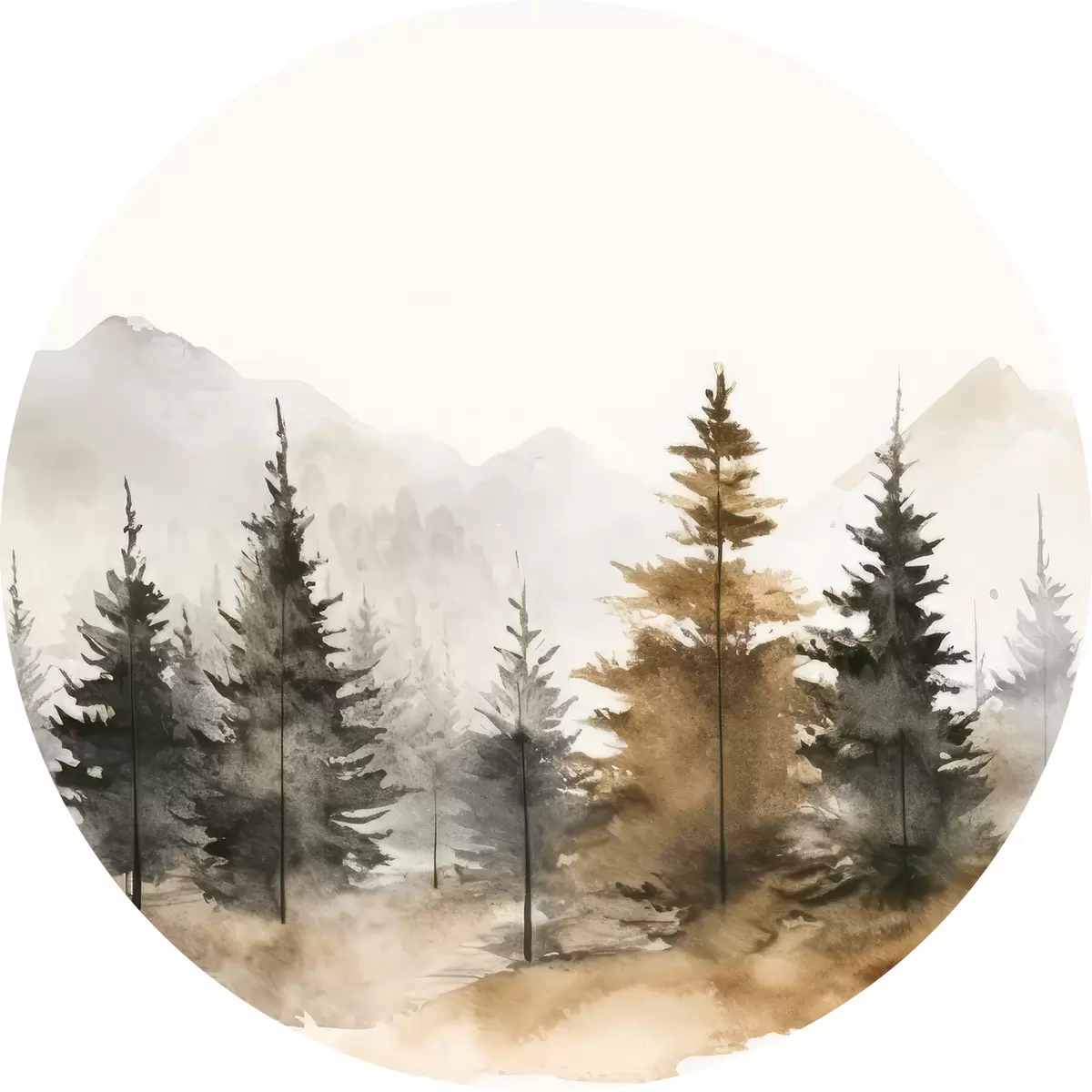 Runde Gemälde Aquarell Tannenbäume auf dem Hintergrund der Berge r36010