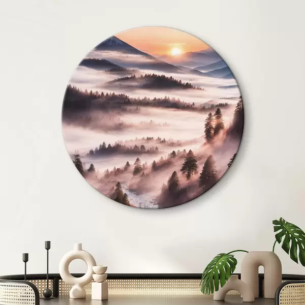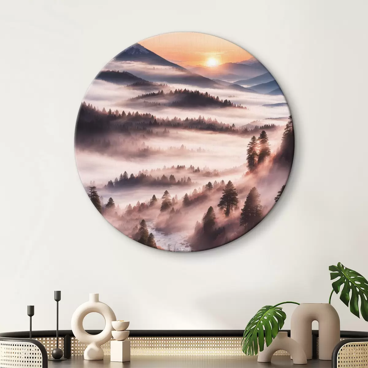 Runde Gemälde Blick auf den nebligen Wald r36050