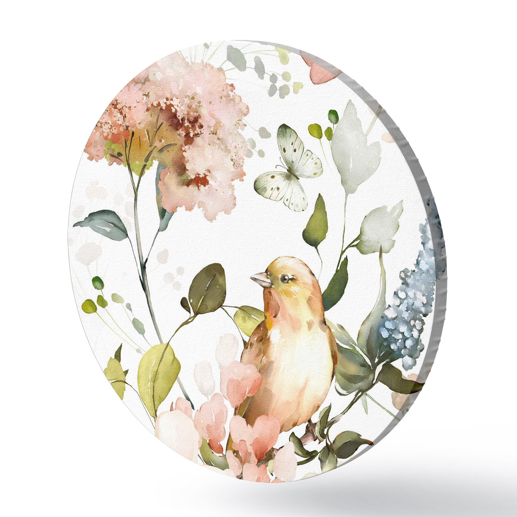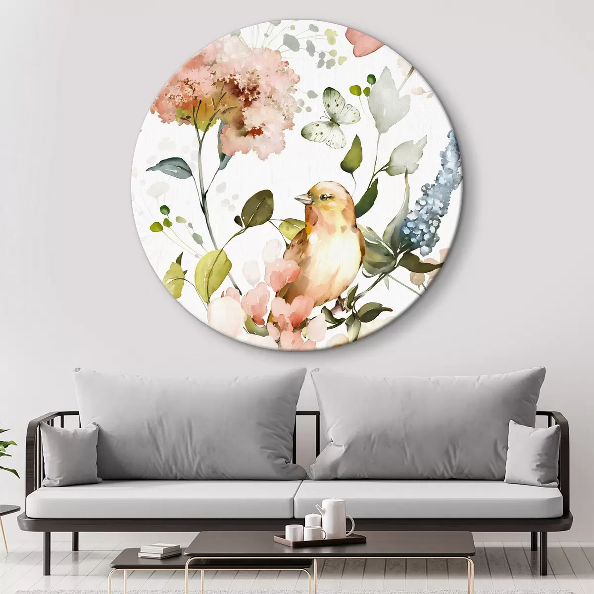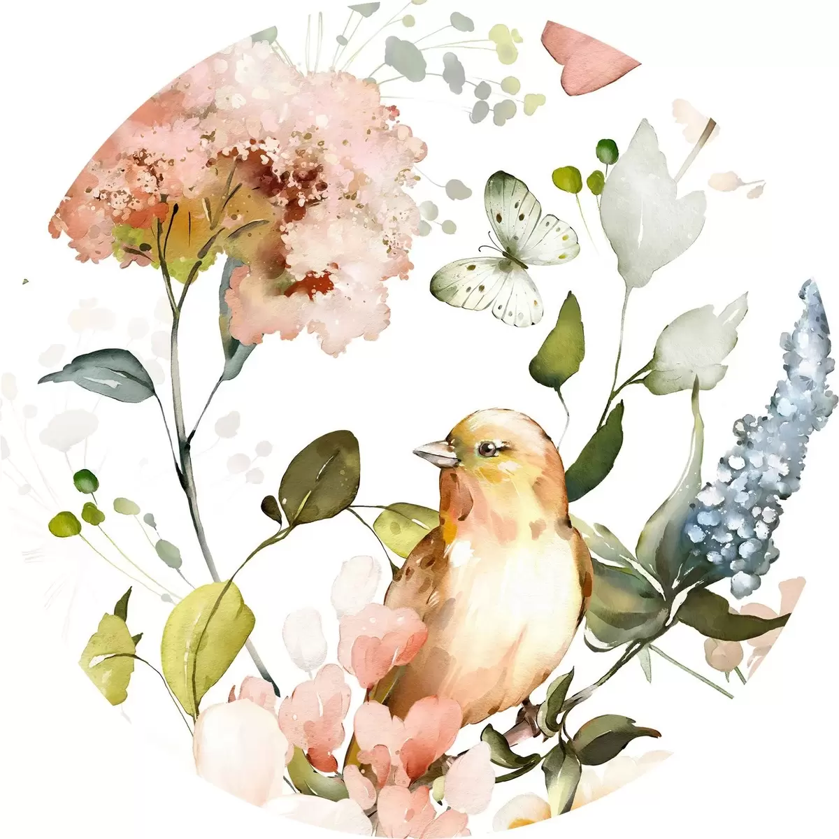 Runde Gemälde Aquarell mit Blumen, Vögeln und Schmetterlingen auf einem weißen Hintergrund r36153