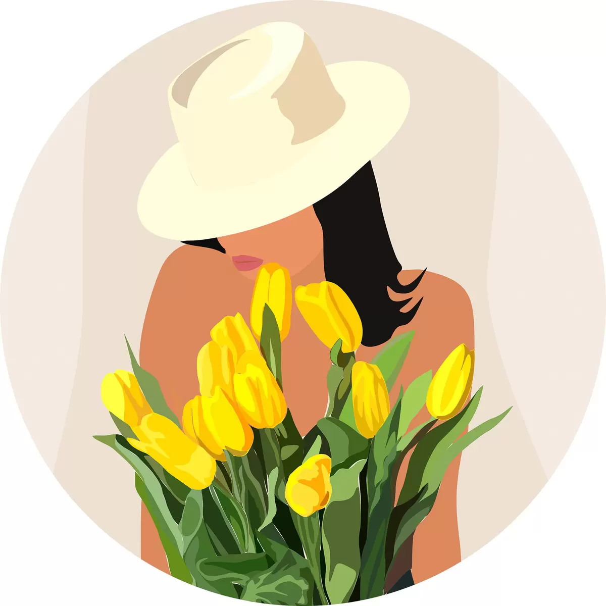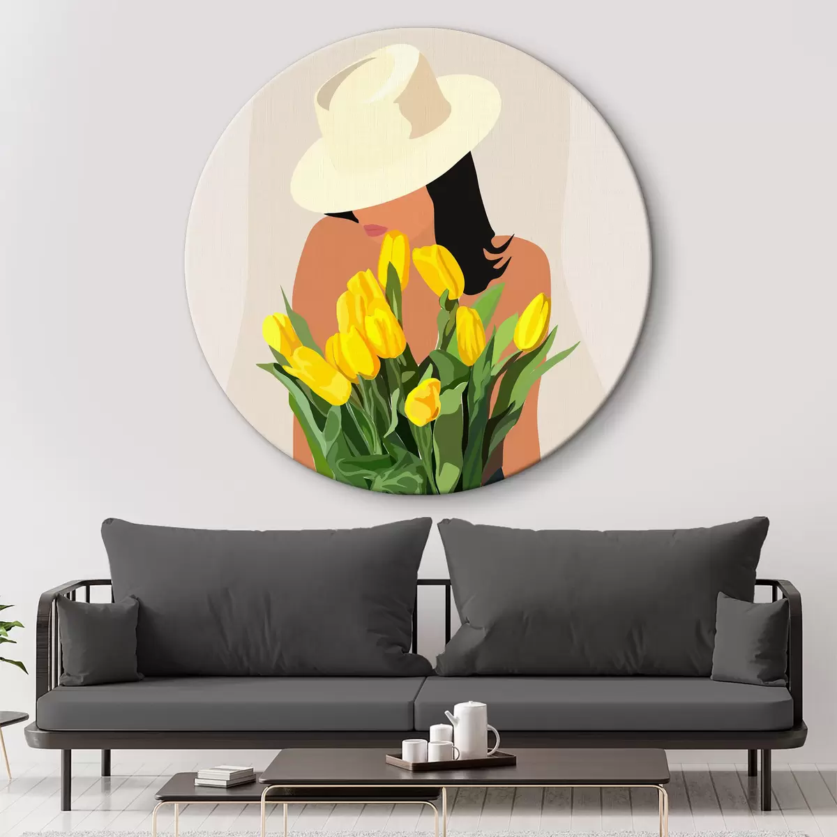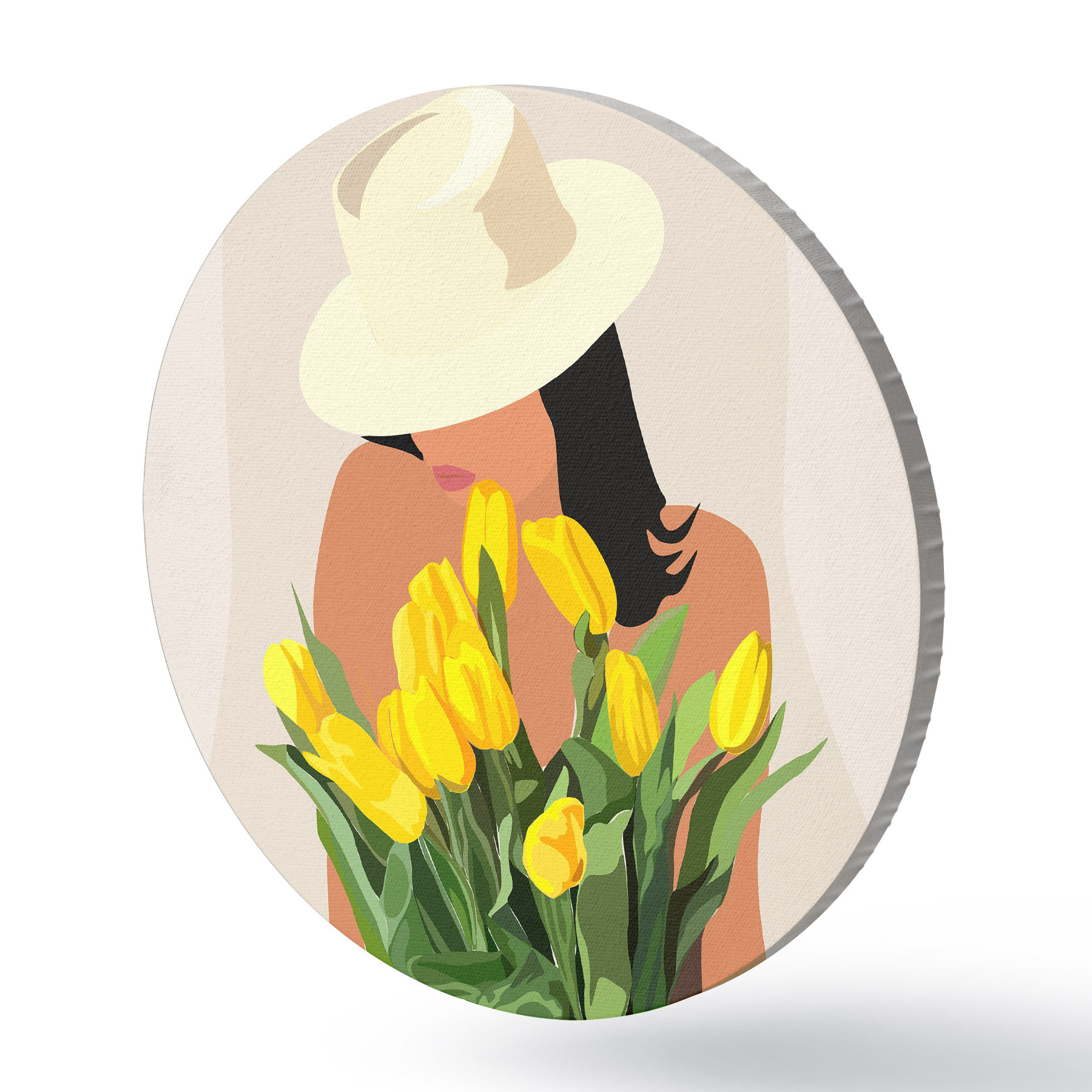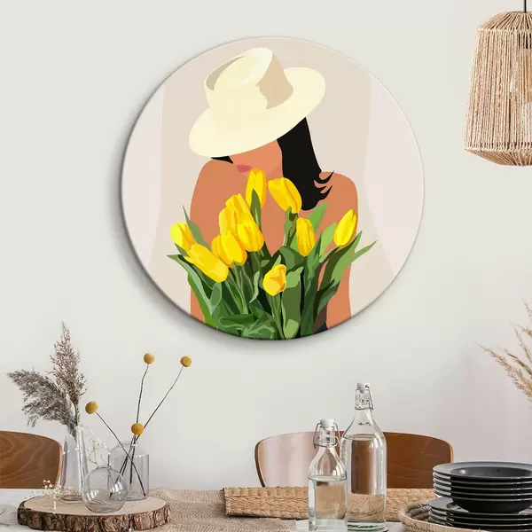Runde Gemälde Mädchen mit gelben Blumen abstrakten Boho-Stil r36336