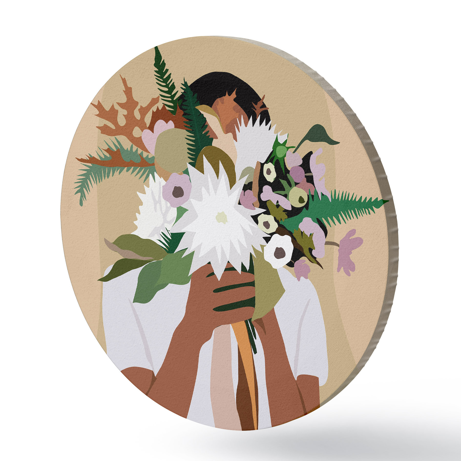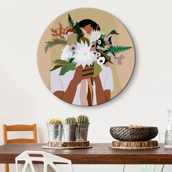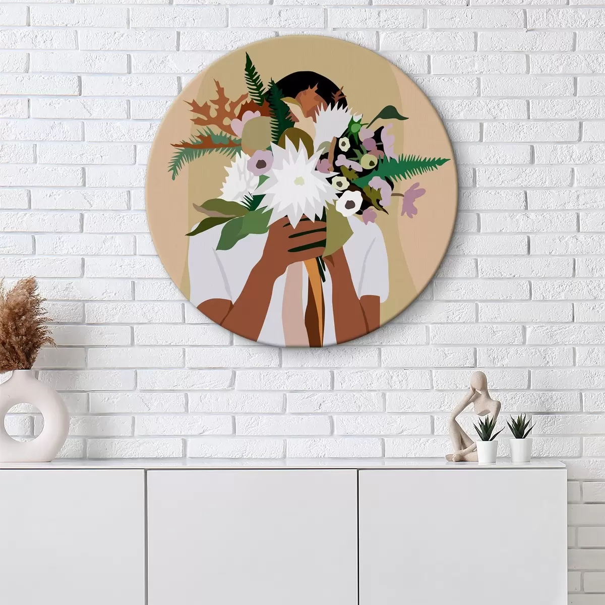 Runde Gemälde Mädchen mit einem Blumenstrauß abstrakten Boho-Stil r36367