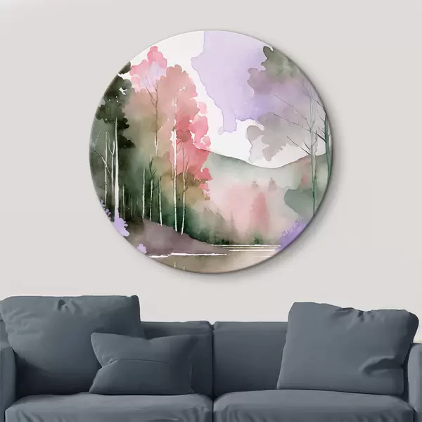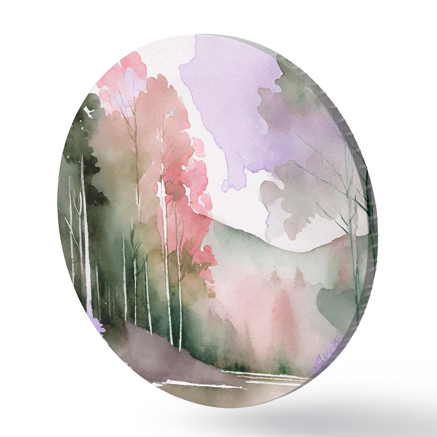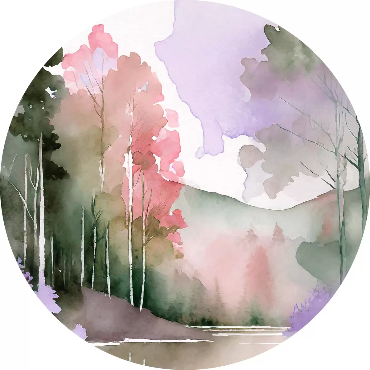 Runde Gemälde Aquarell See- und Waldlandschaft, Frühling, zarte natürliche Farben r36501