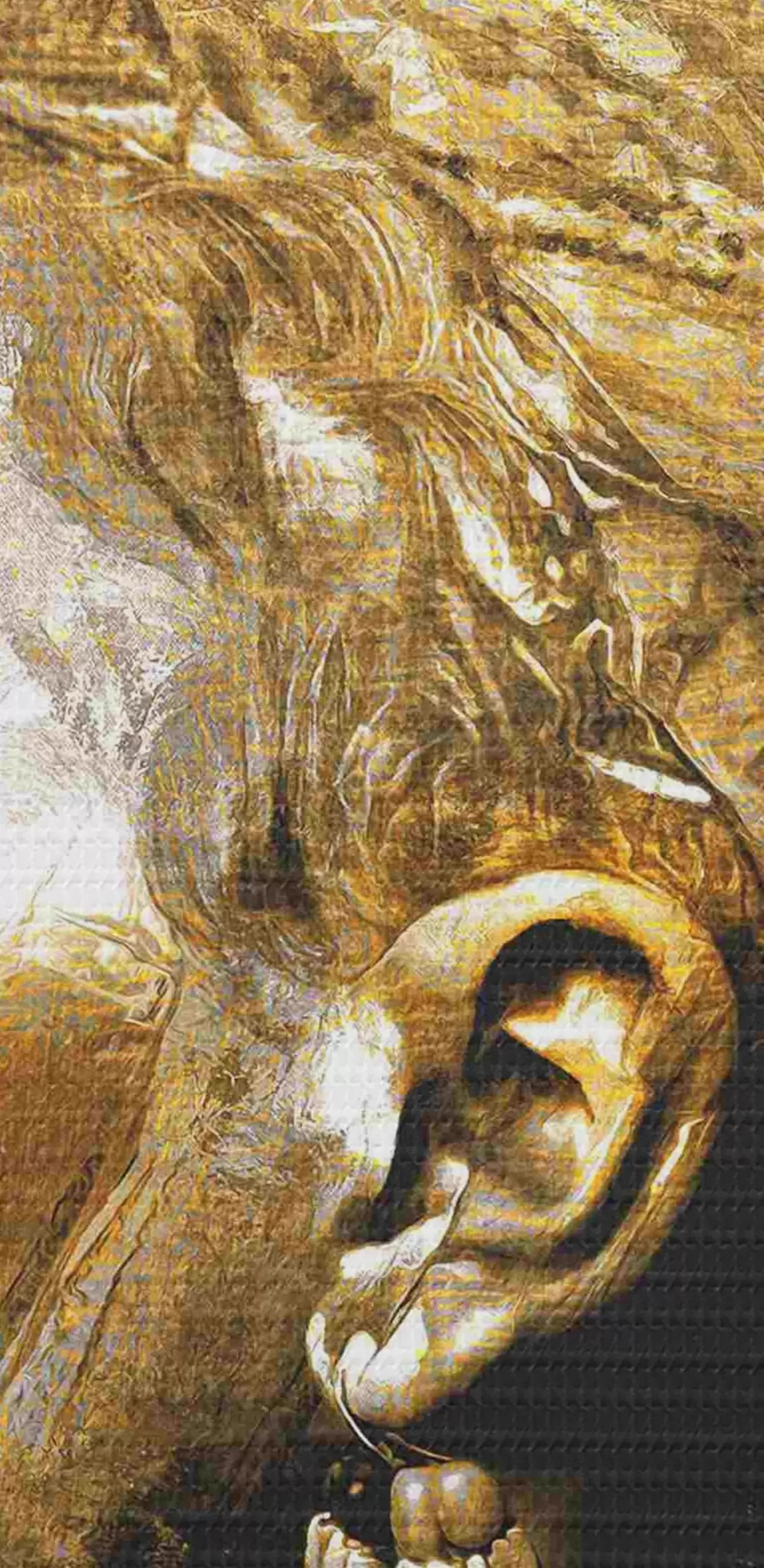 Das Bild kann vorsichtig mit einem trockenen, weichen Tuch oder Schwamm abgewischt werden; es wird nicht empfohlen, feuchte Produkte zu verwenden. Die Verwendung eines feuchten Schwamms ist nur zulässig, wenn das Bild lackiert wurde.