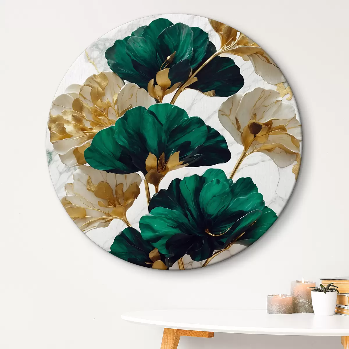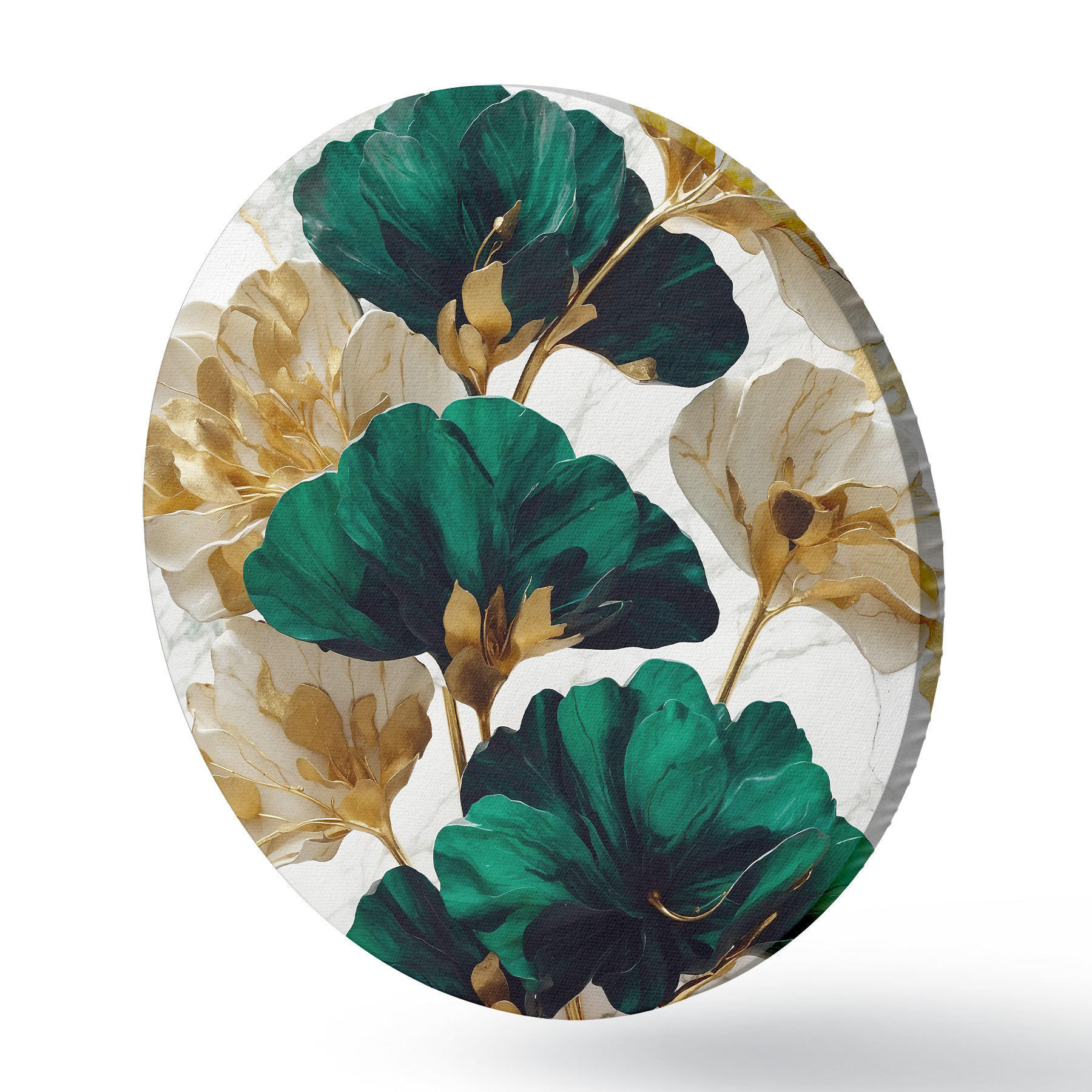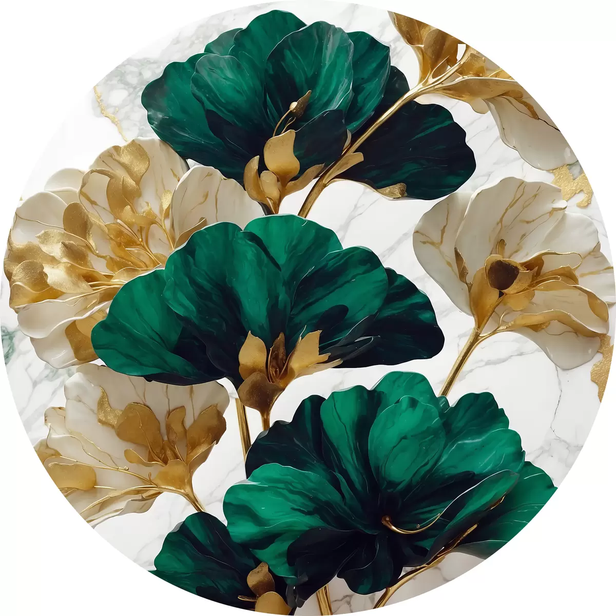 Runde Gemälde Grüne und weiße Blumen auf weißem Marmor Hintergrund r36646