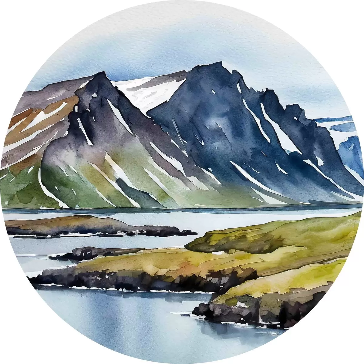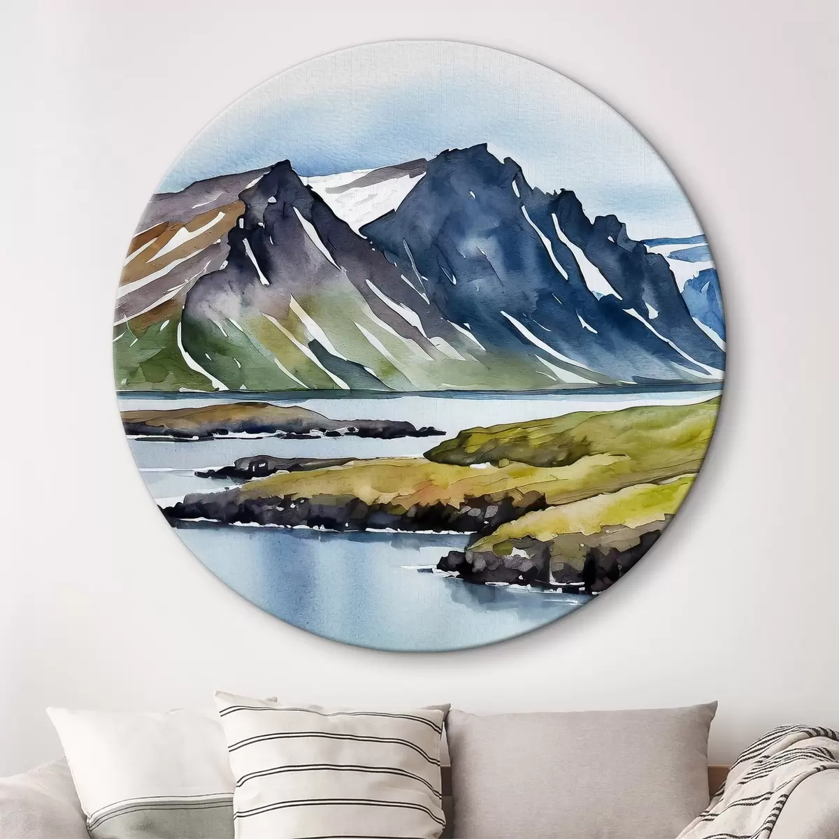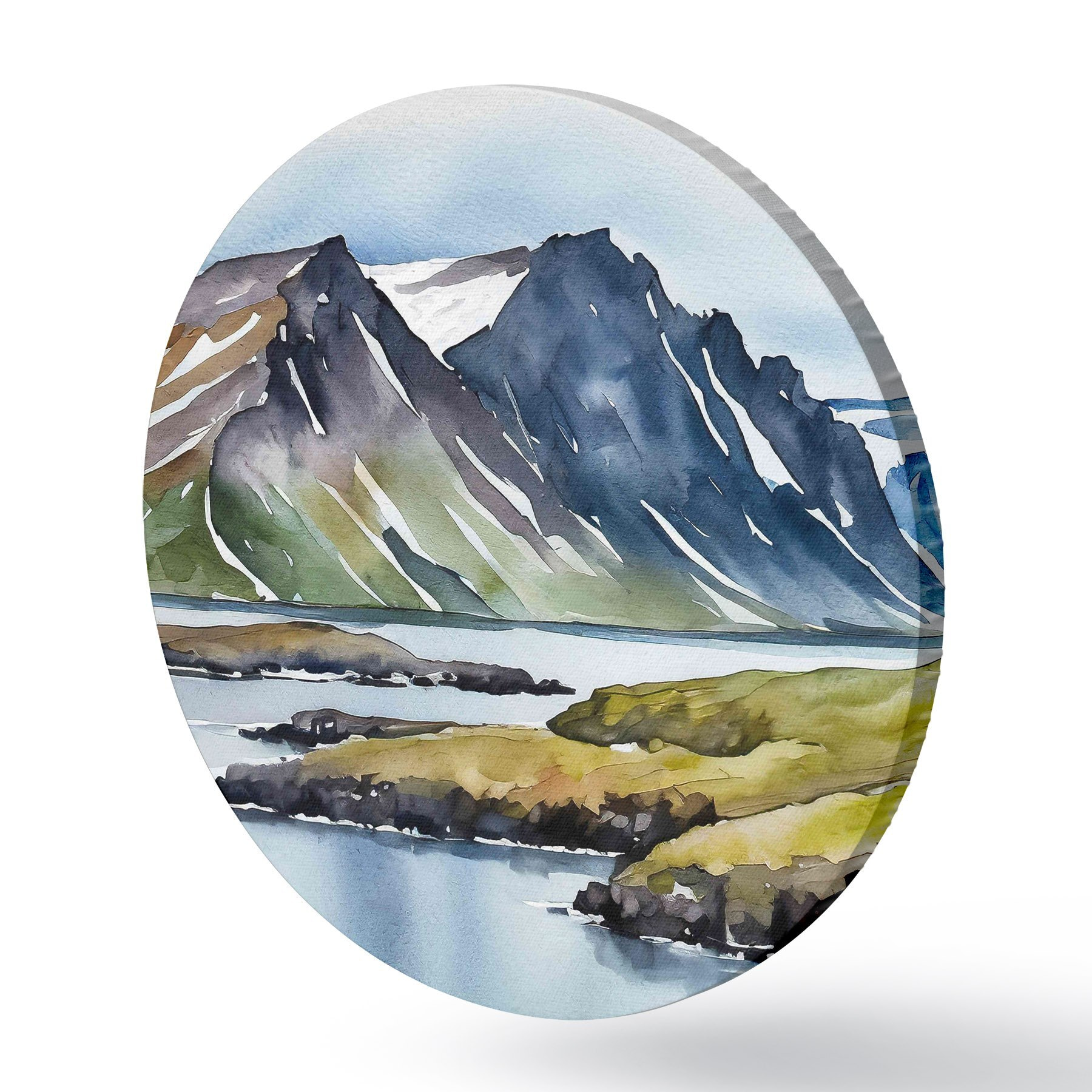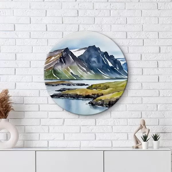 Runde Gemälde Aquarell, das einen See und Berge darstellt r36679