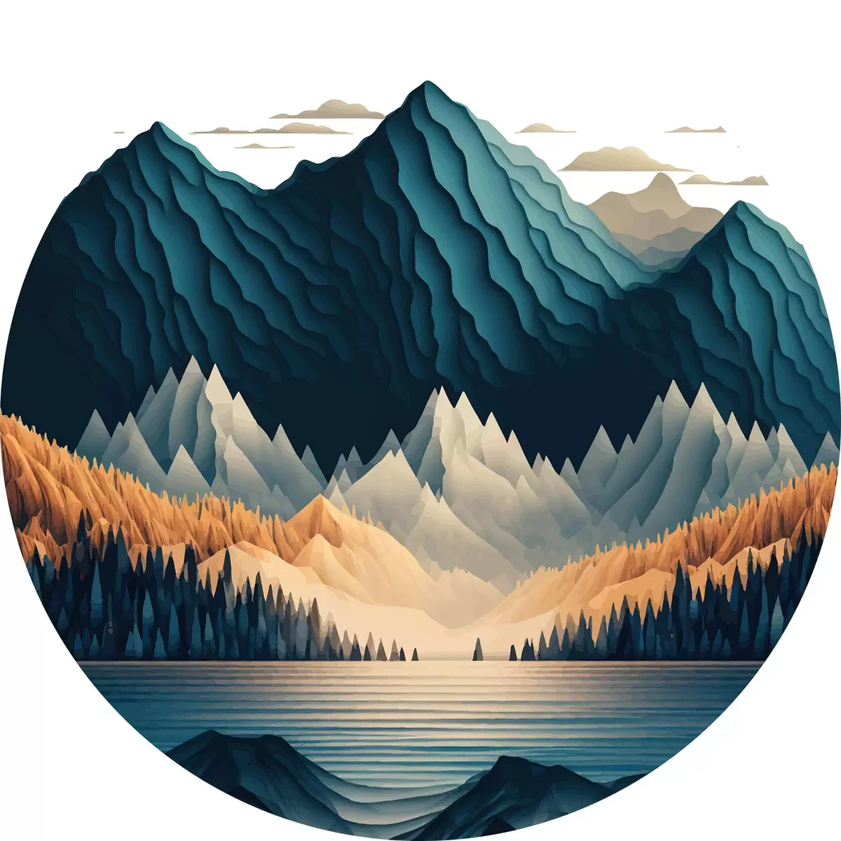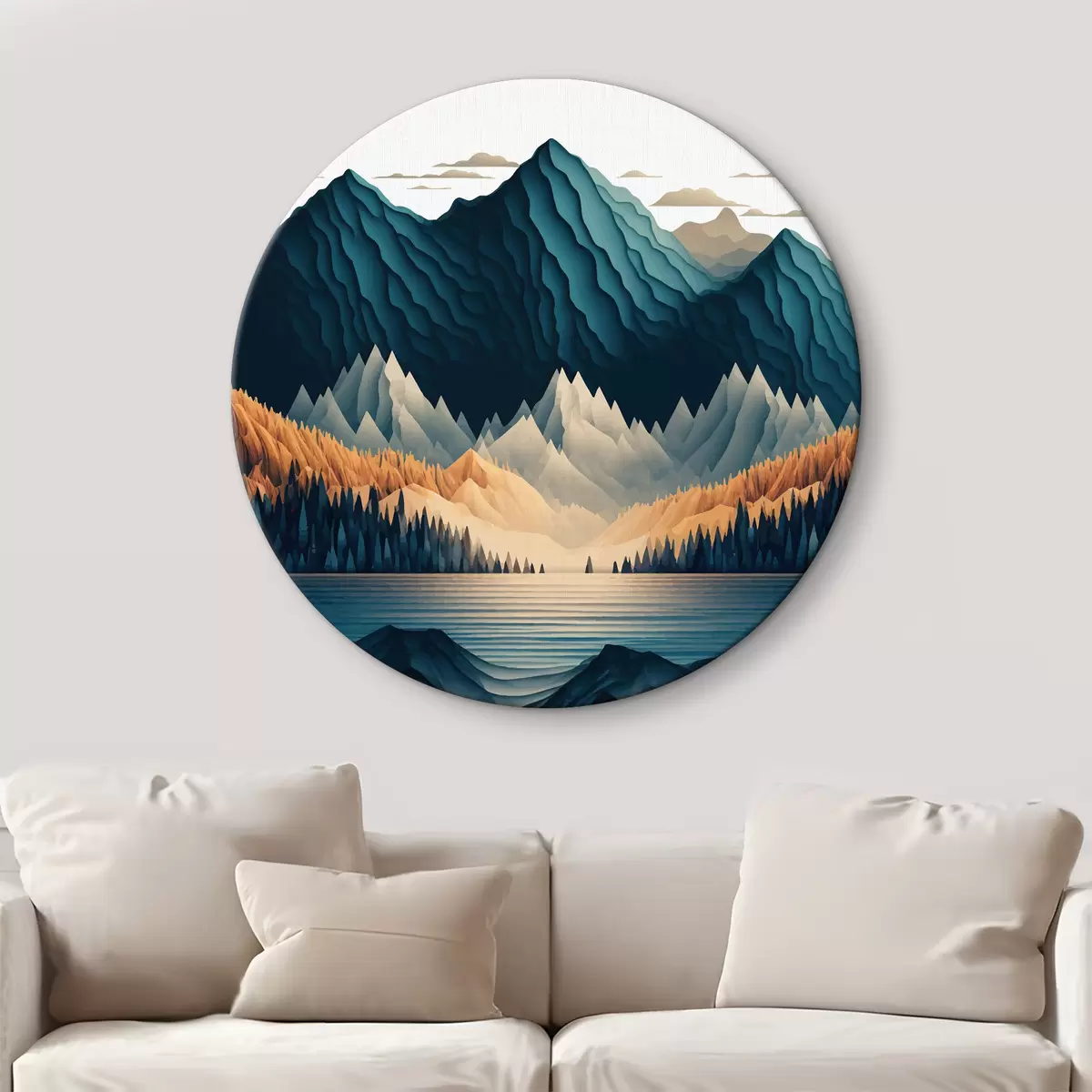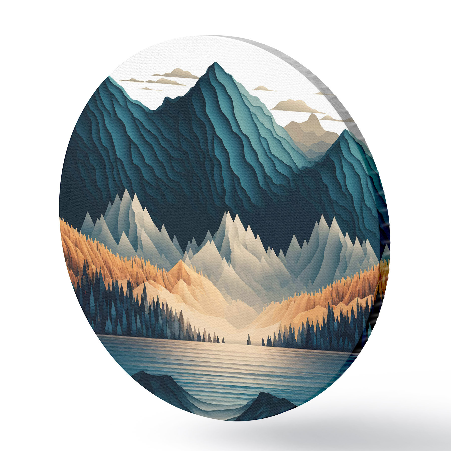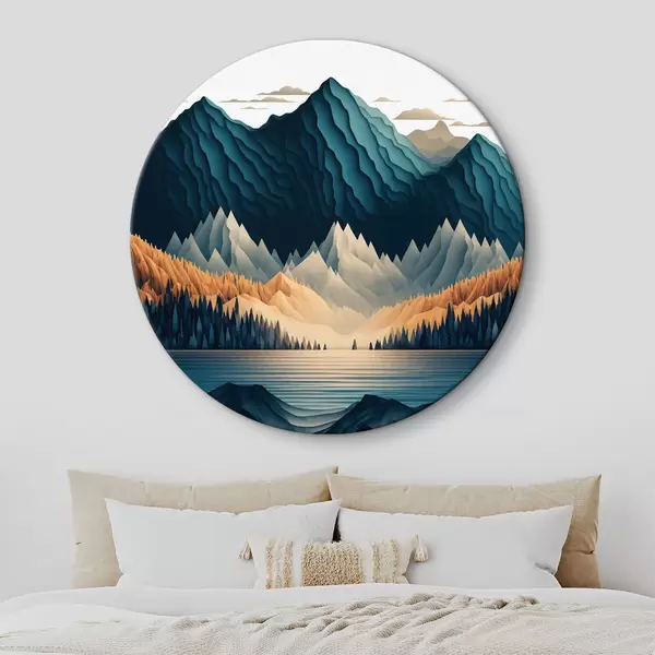 Runde Gemälde Bergkette mit Bäumen und See r36697