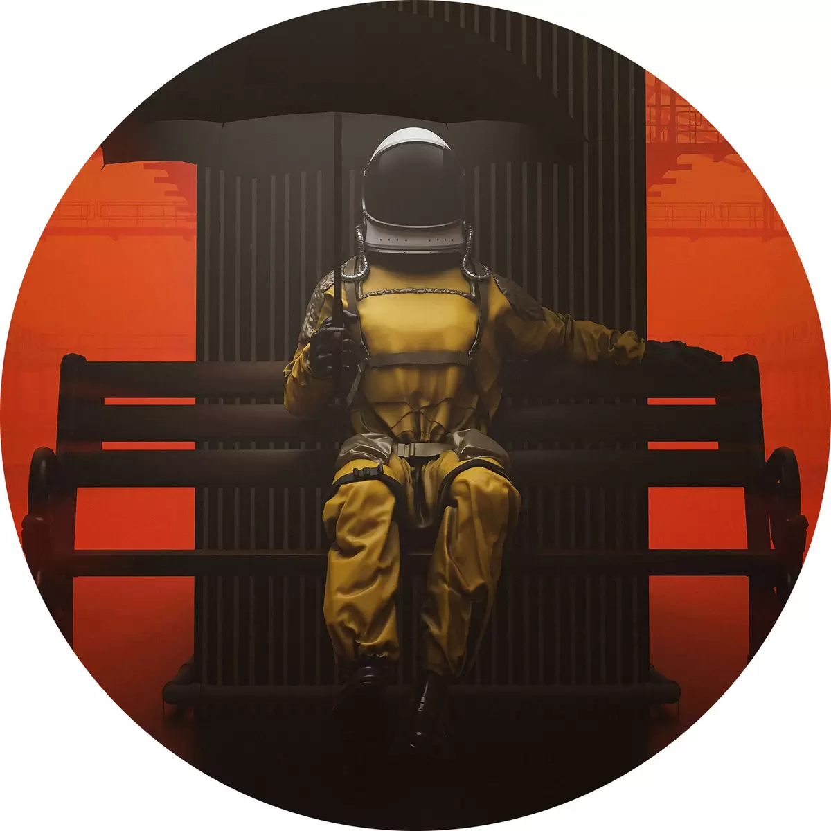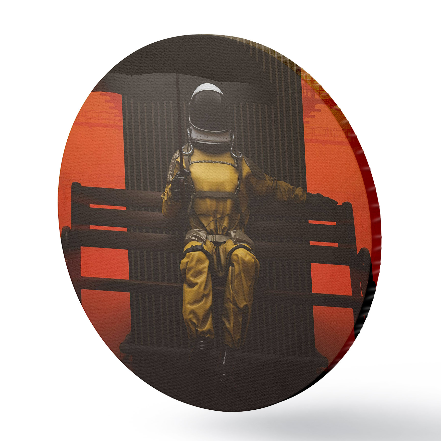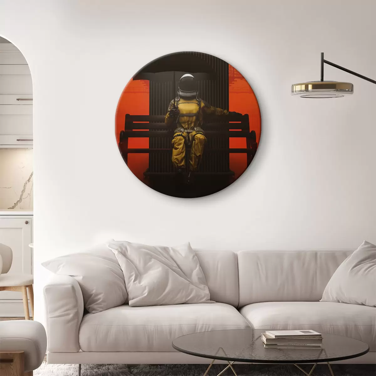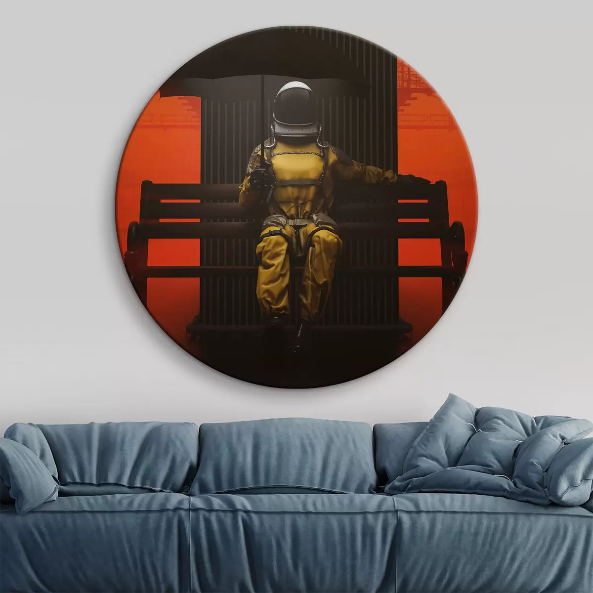 Runde Gemälde Eine Person im Anzug sitzt auf einer Bank mit einem Regenschirm r36702