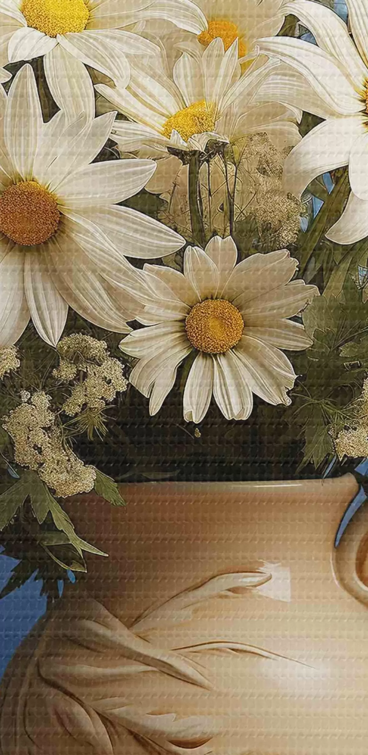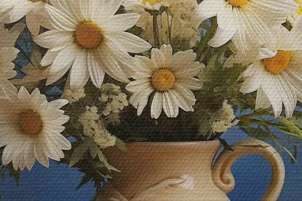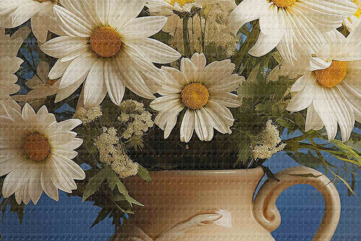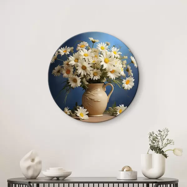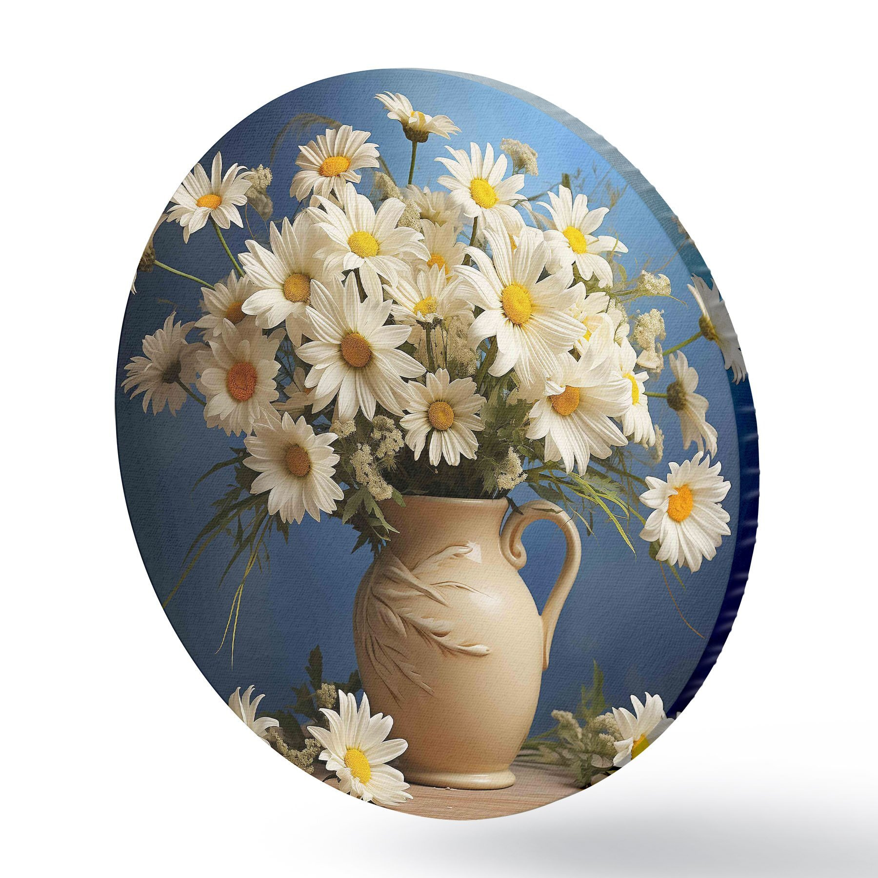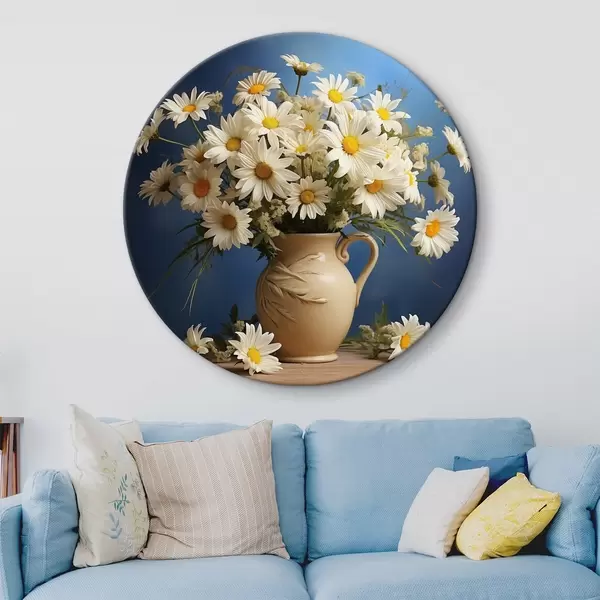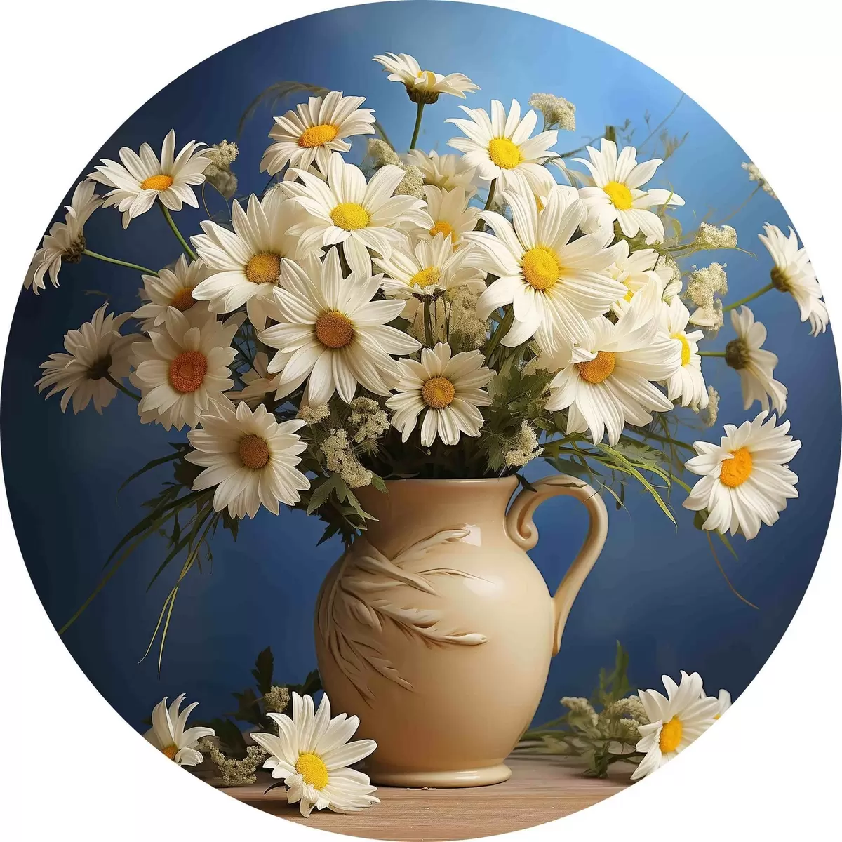 Runde Gemälde Ein wunderschöner Strauß weißer Gänseblümchen auf blauem Hintergrund r36814
