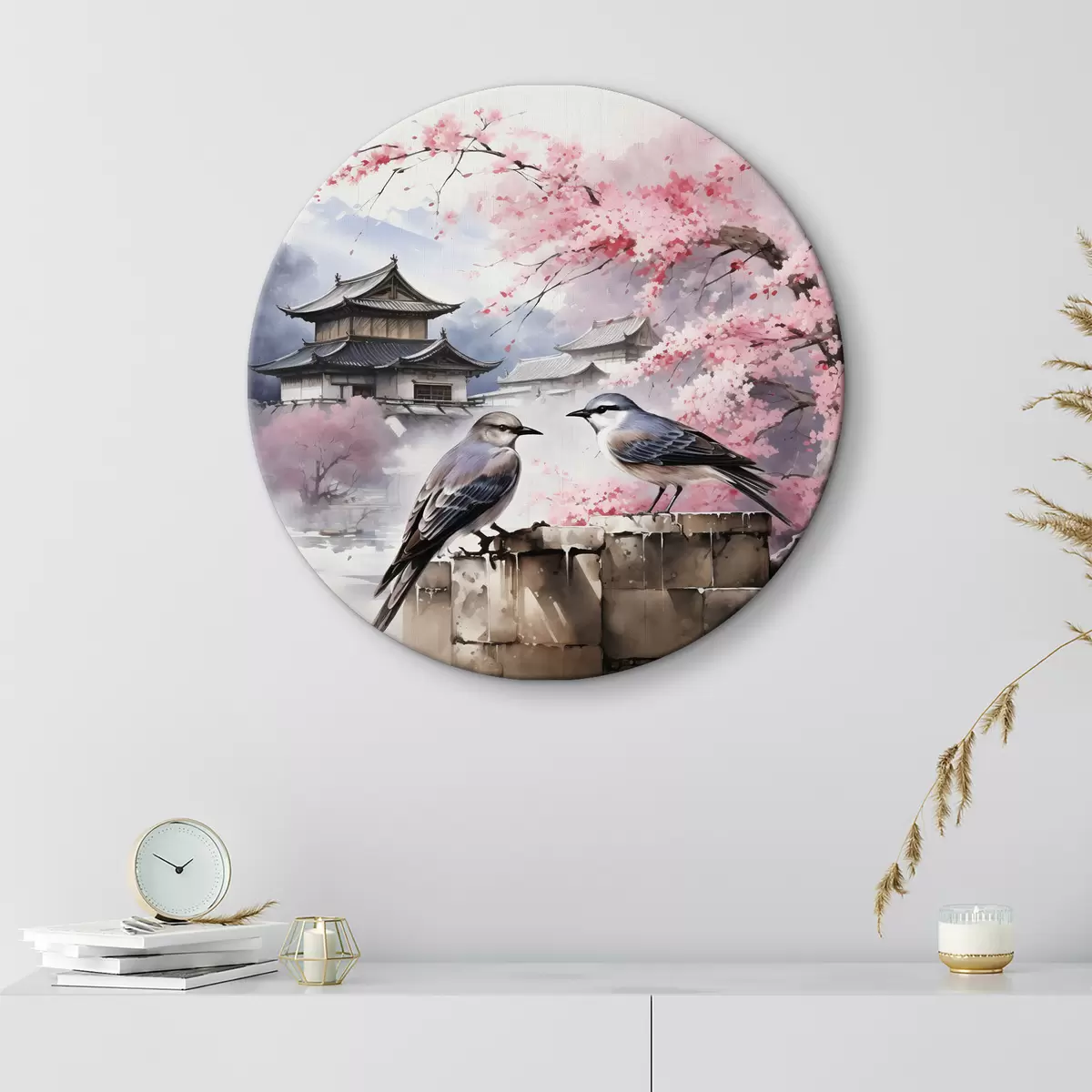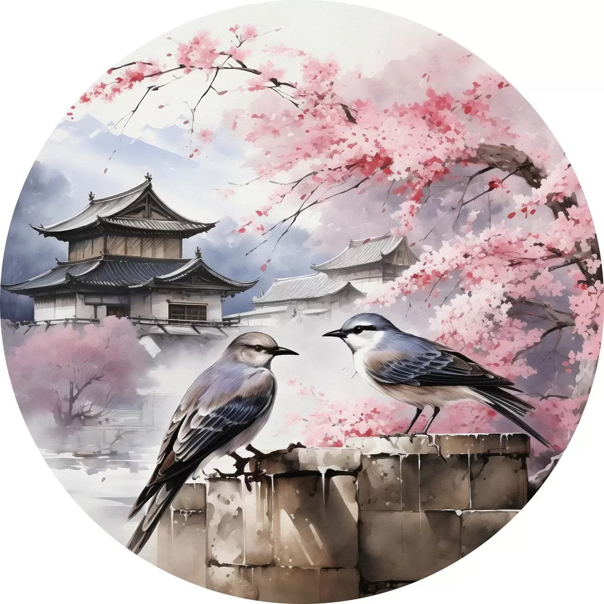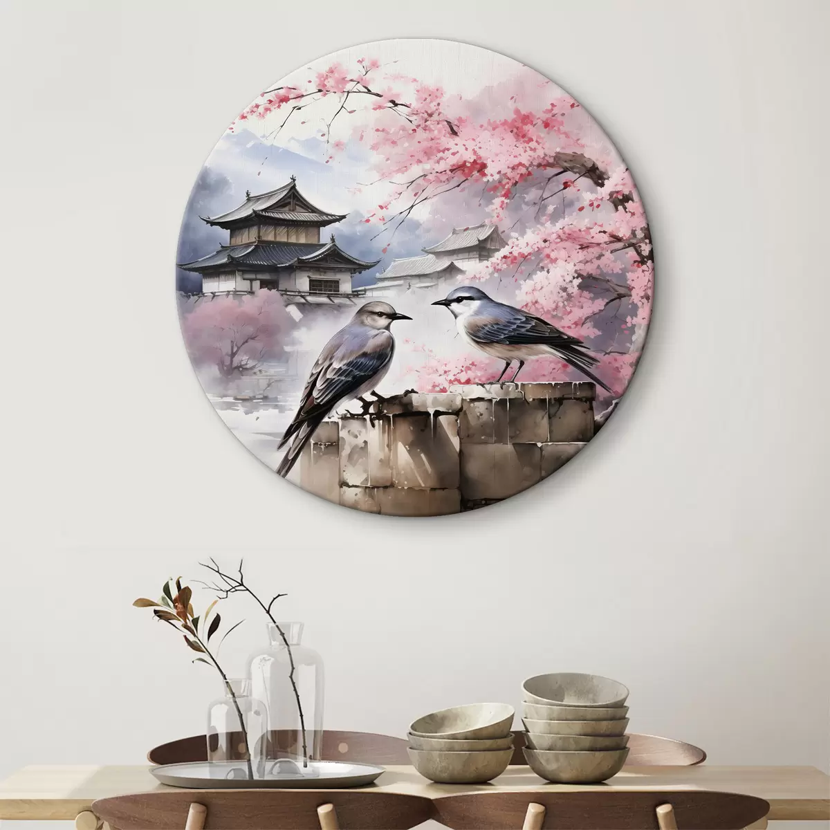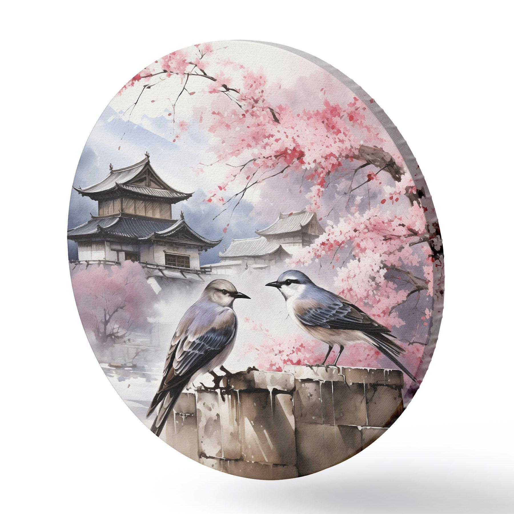 Runde Gemälde Zwei Vögel auf dem Hintergrund der blühenden Sakura r36815