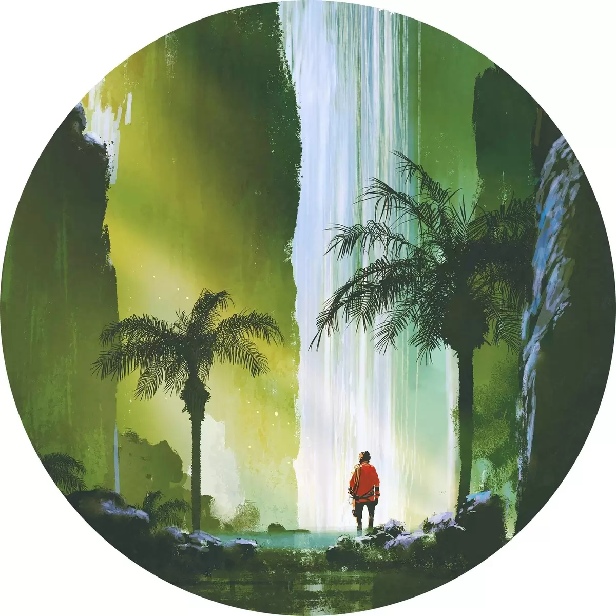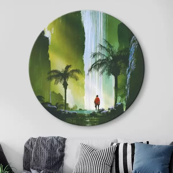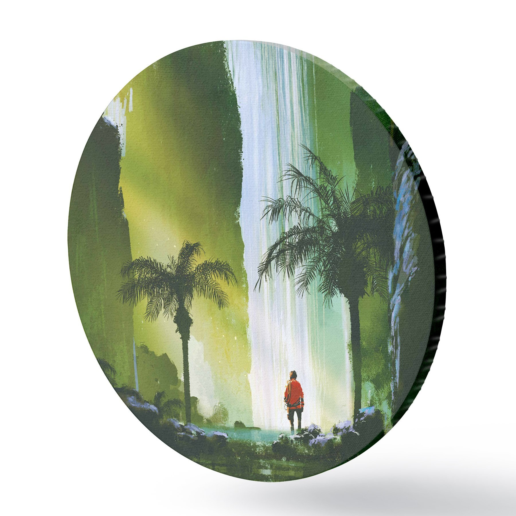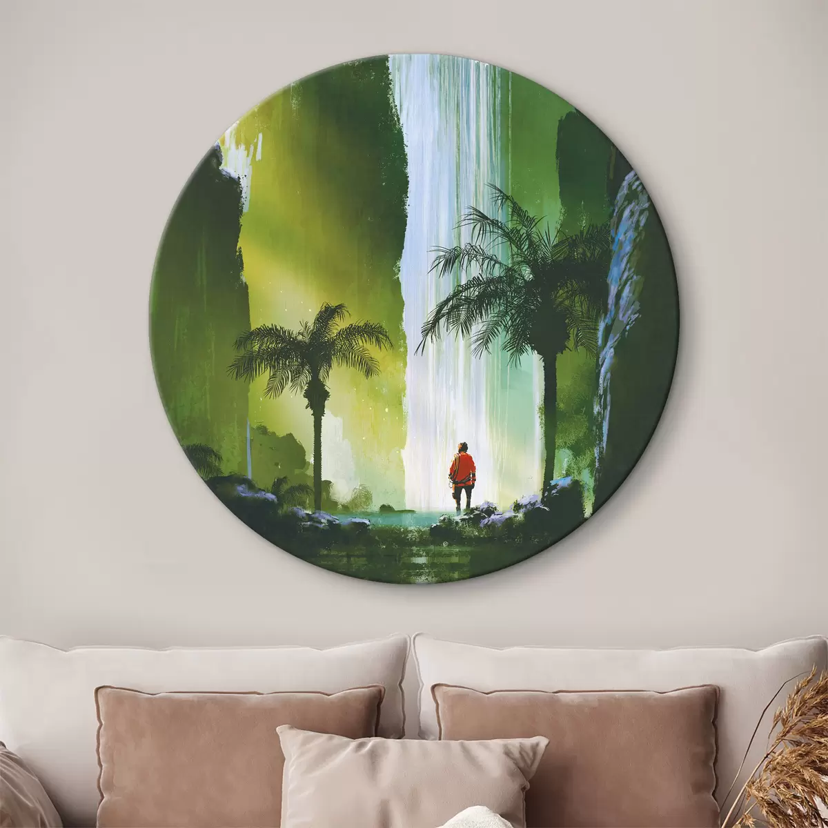 Runde Gemälde Ein Mann spaziert durch den Wald mit einem Wasserfall r37080