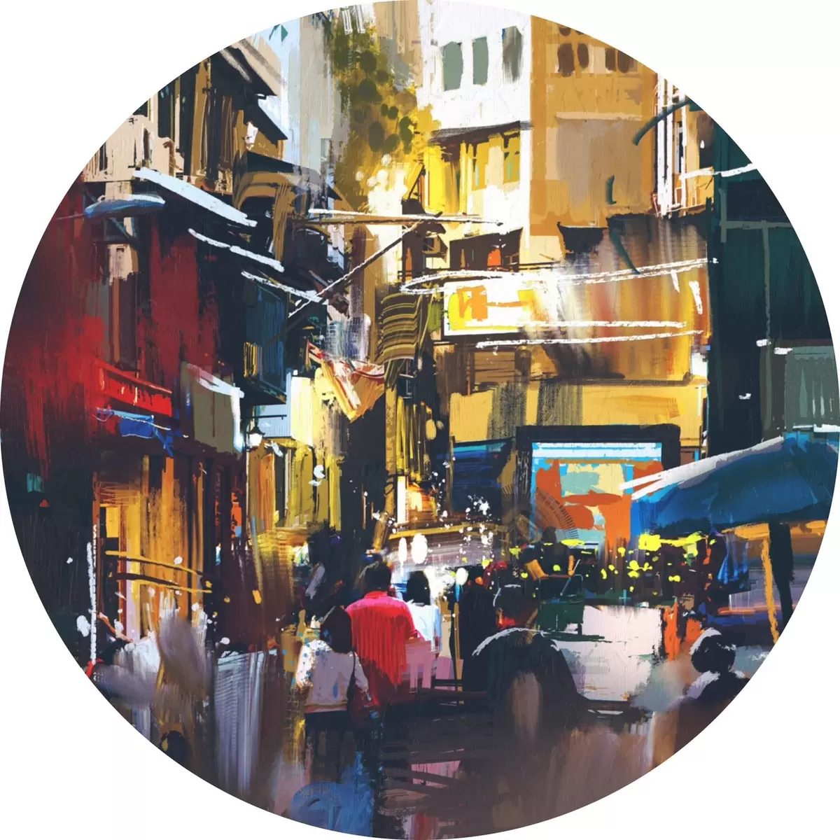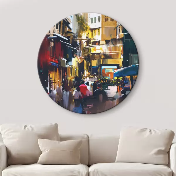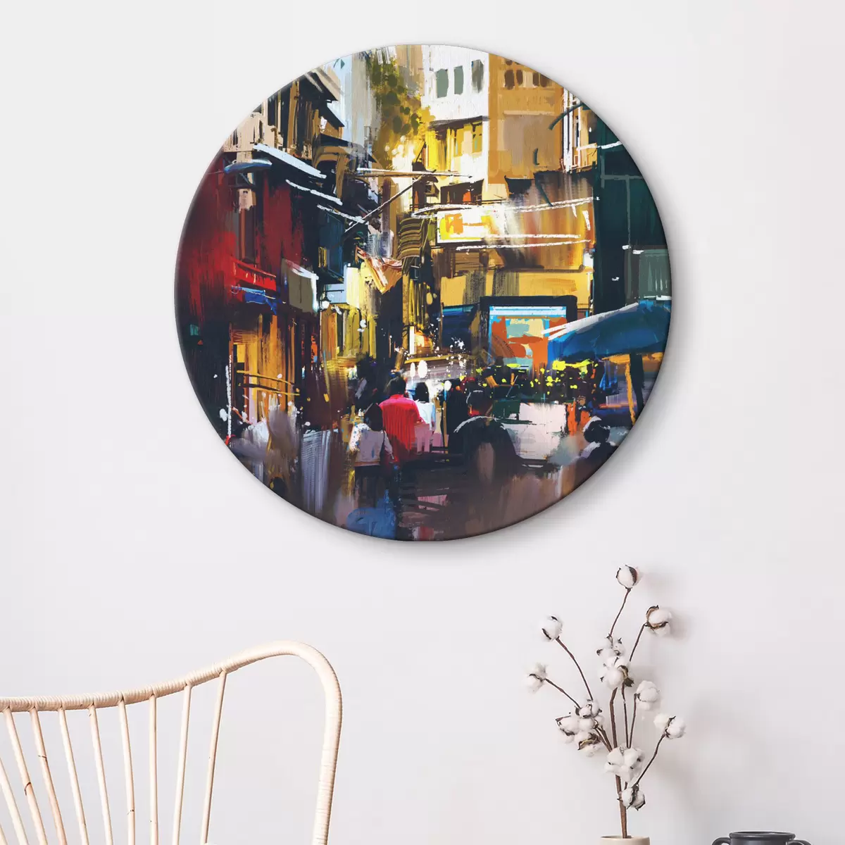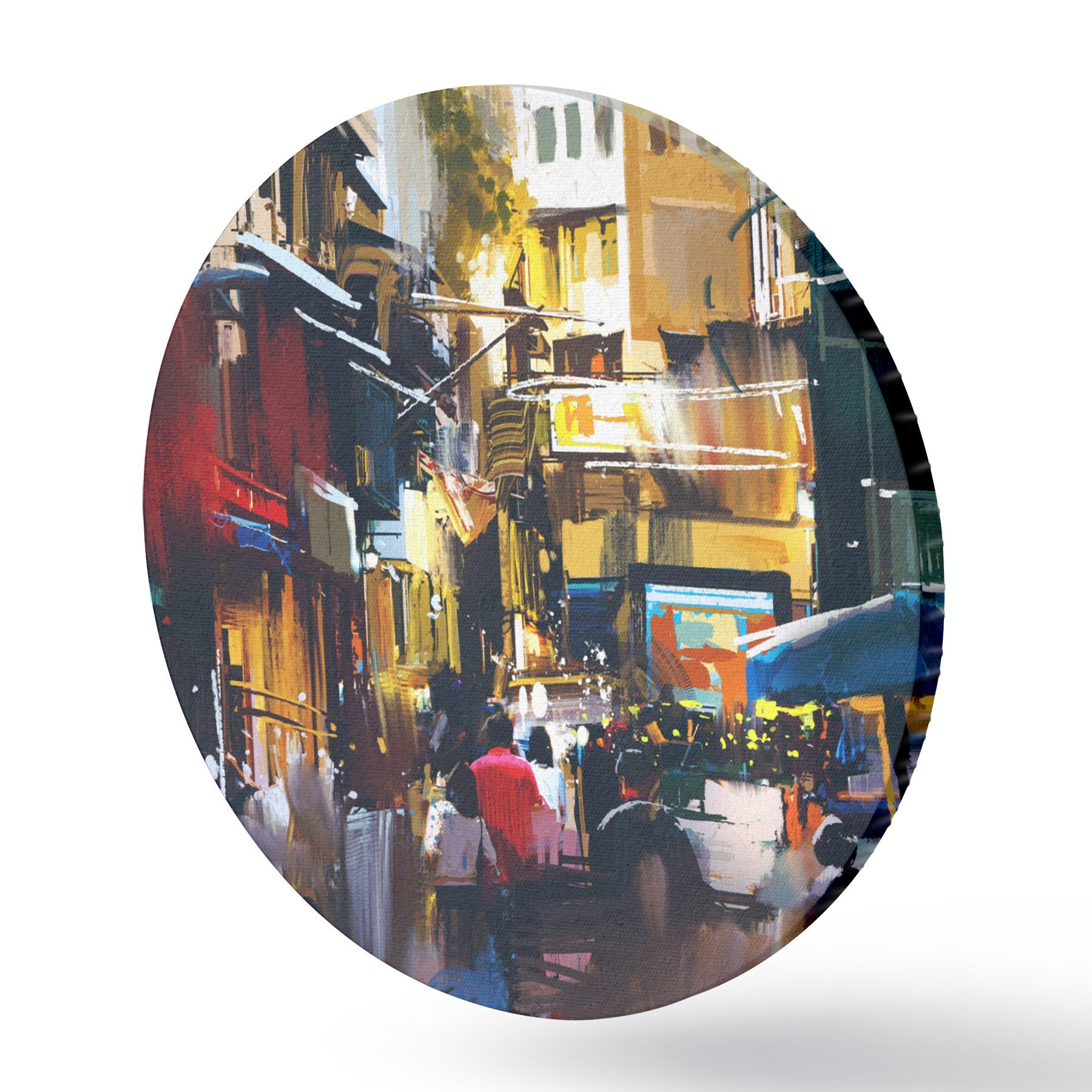 Runde Gemälde Straße mit Gebäuden und Spaziergängern r37096