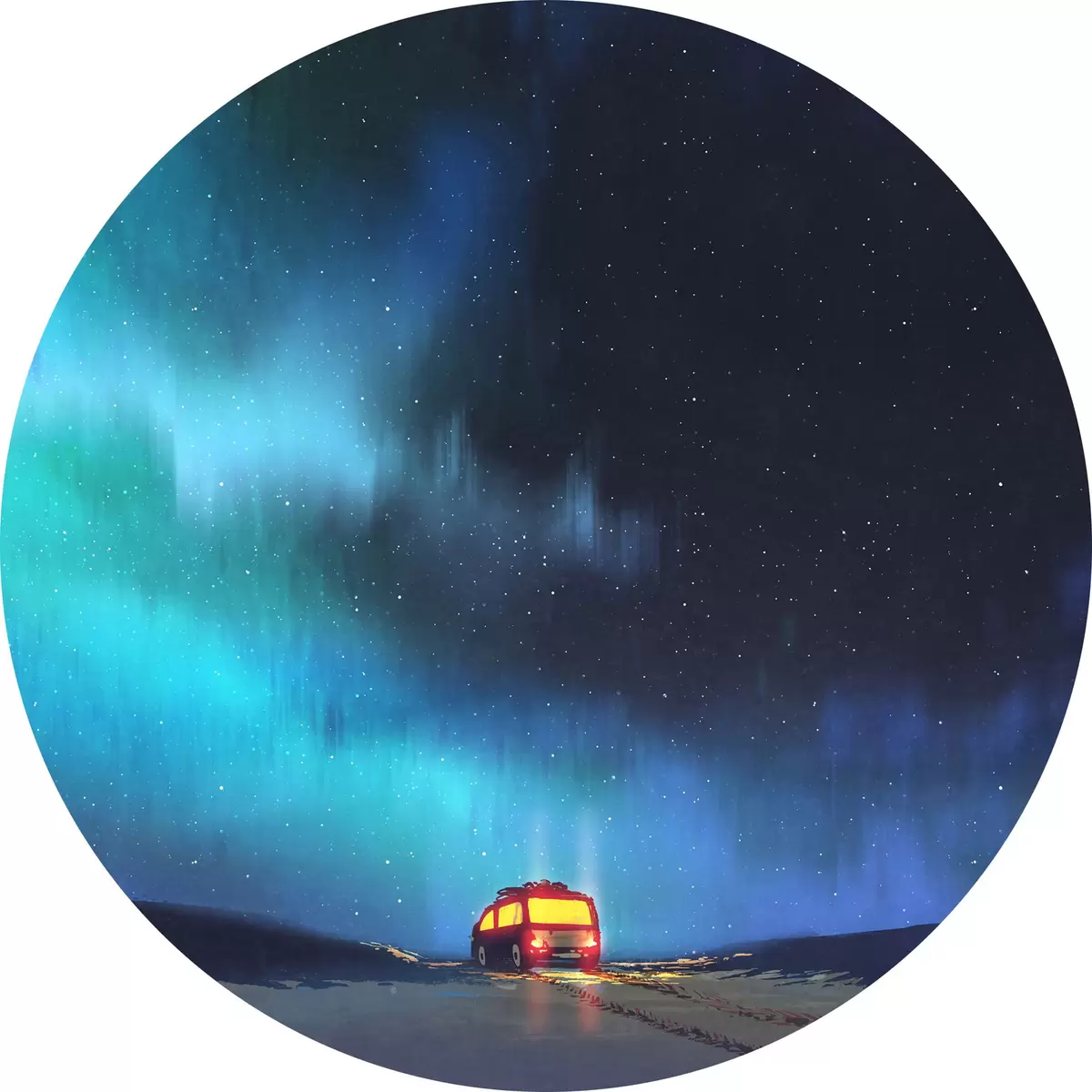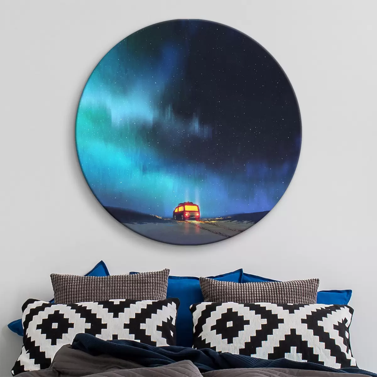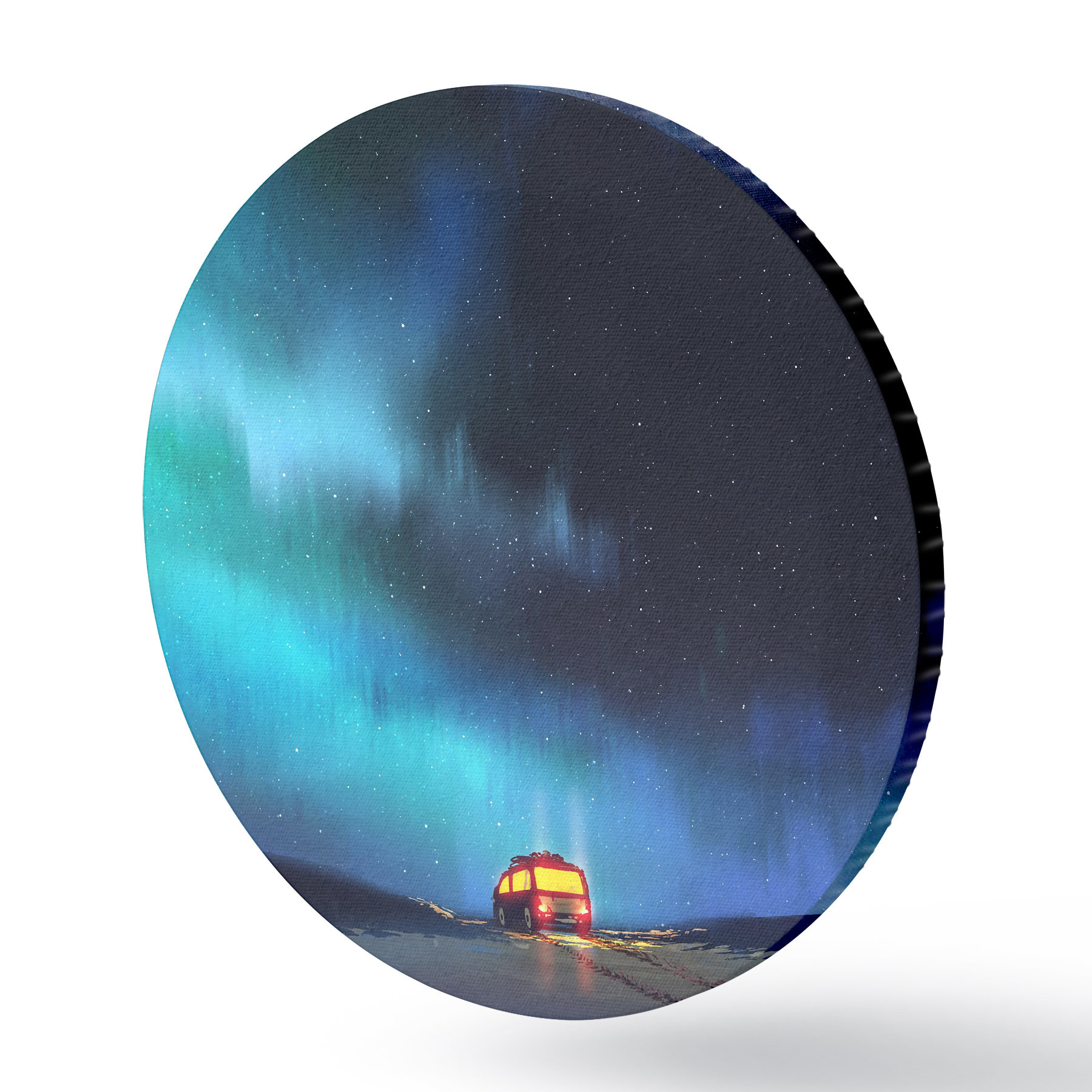 Runde Gemälde Bus auf einer verschneiten Straße mit Lichtern am Himmel r37111