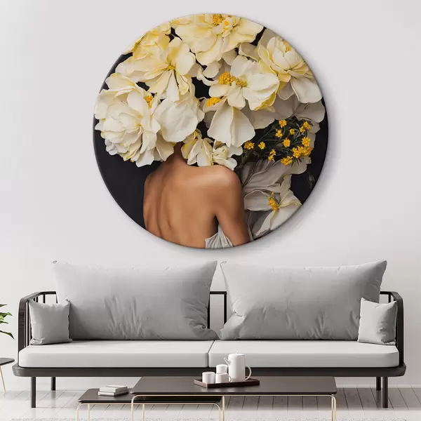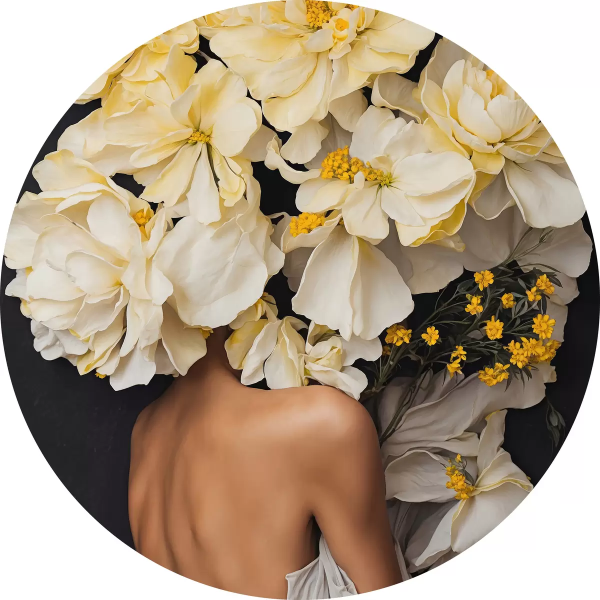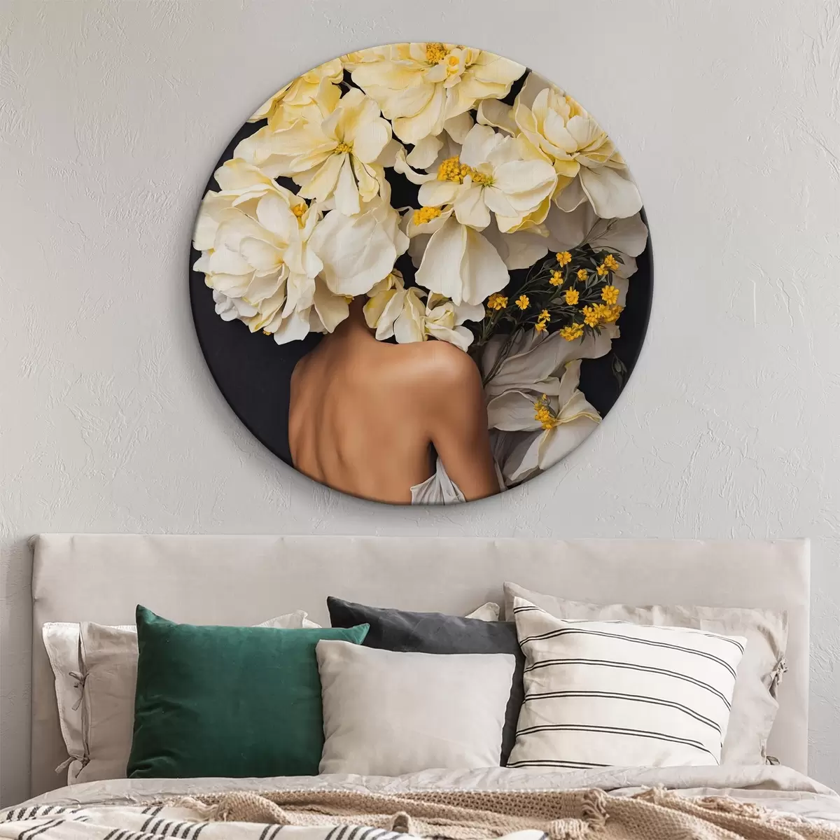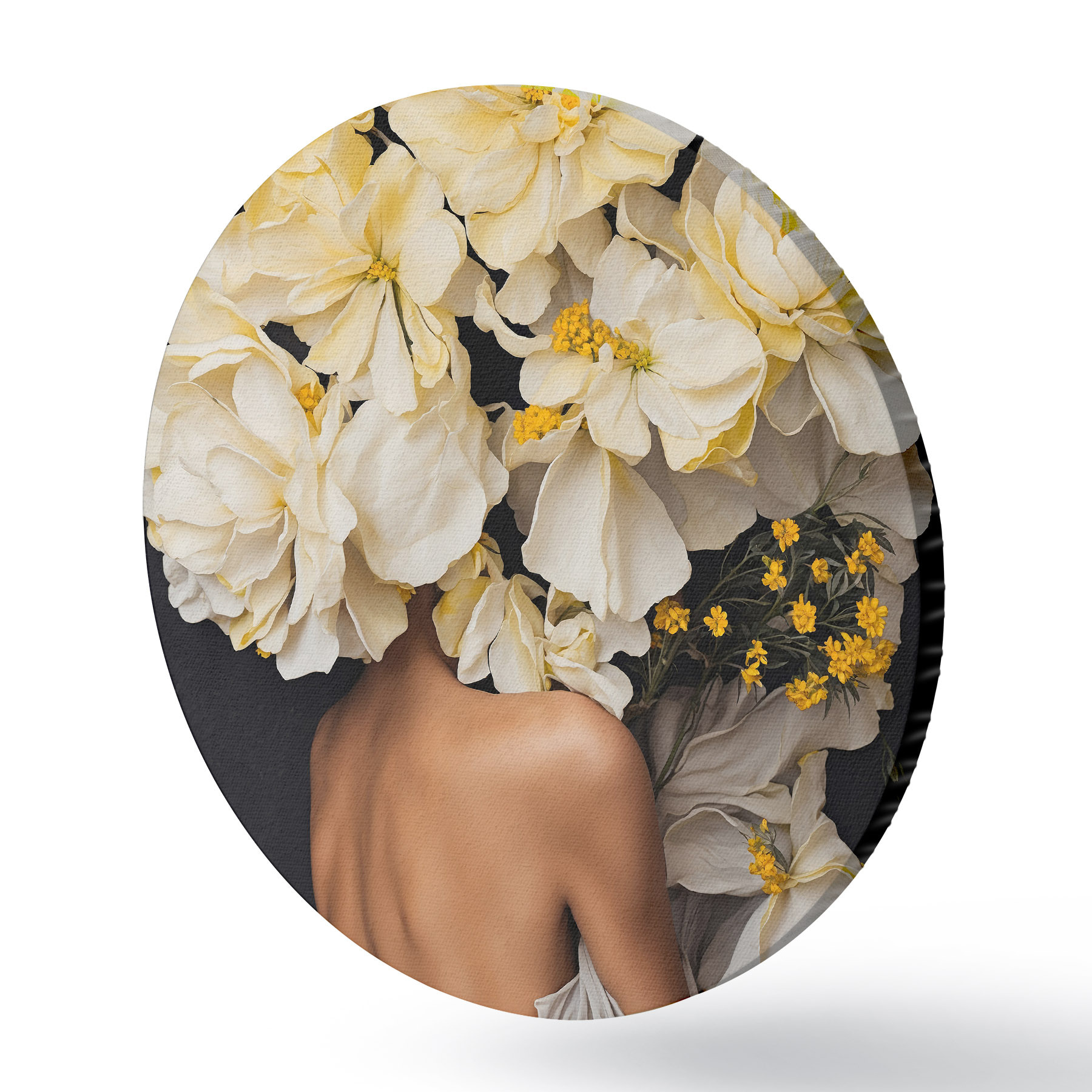 Runde Gemälde Frau mit gelben Blumen auf schwarzem Hintergrund r37162