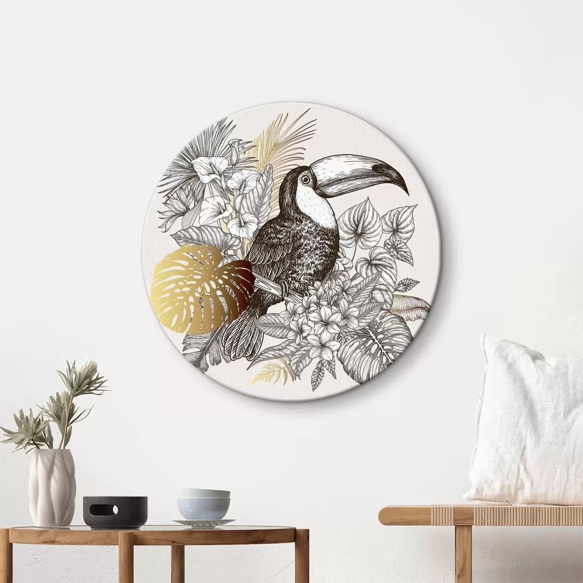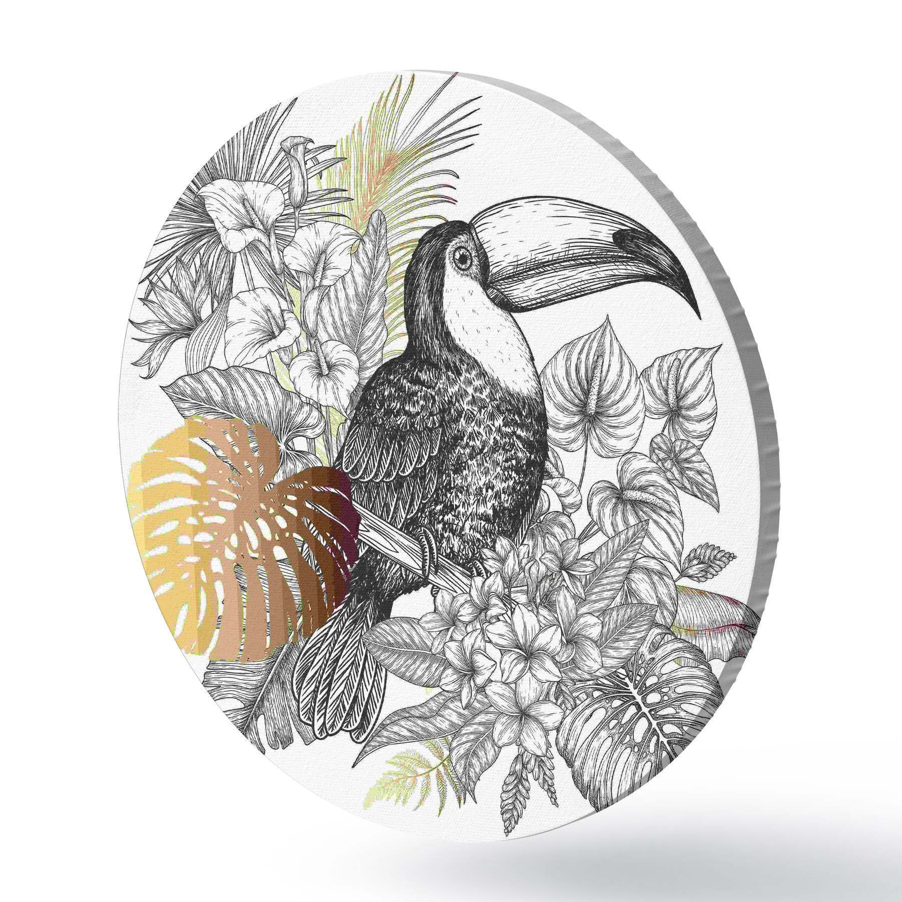 Runde Gemälde Tukan mit Blättern und Blumen r37303