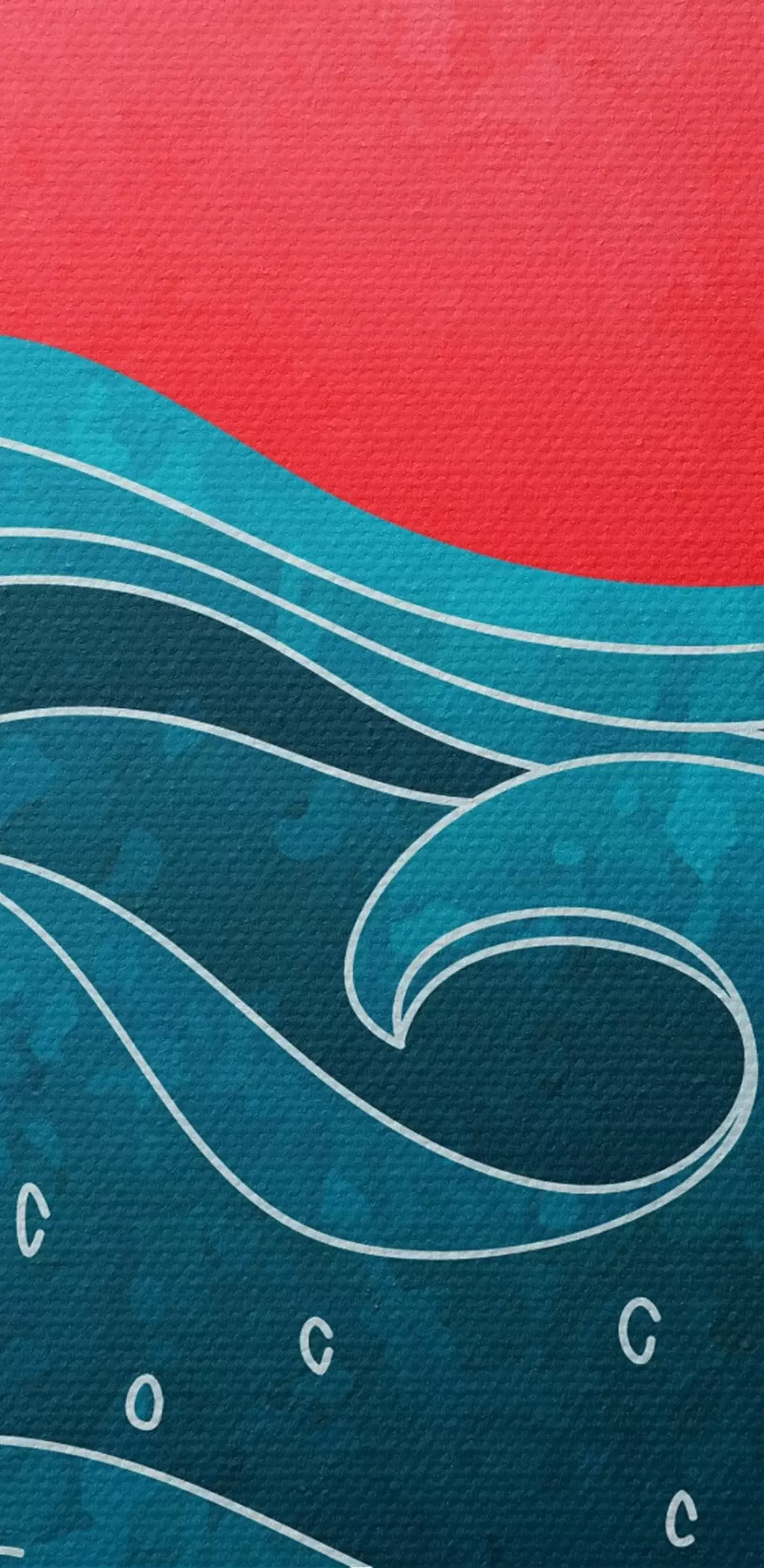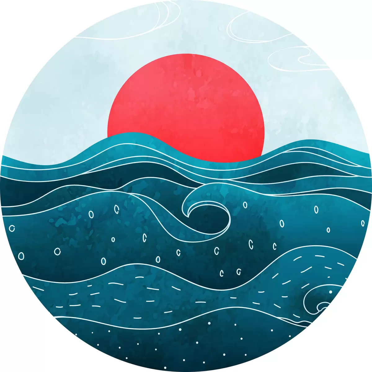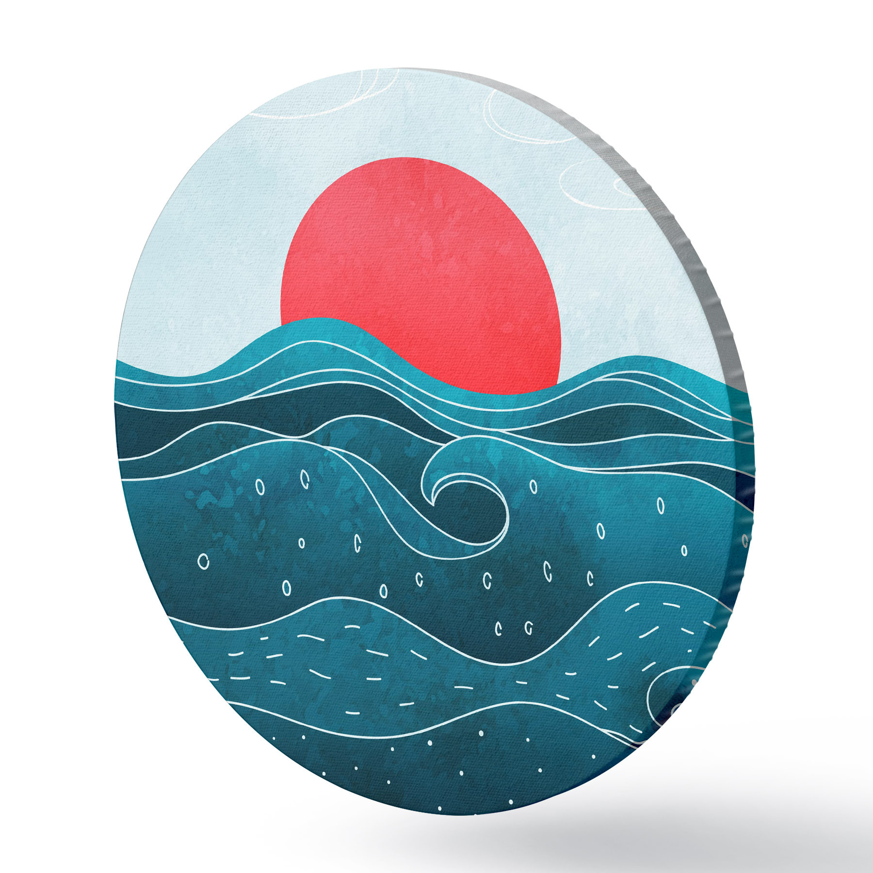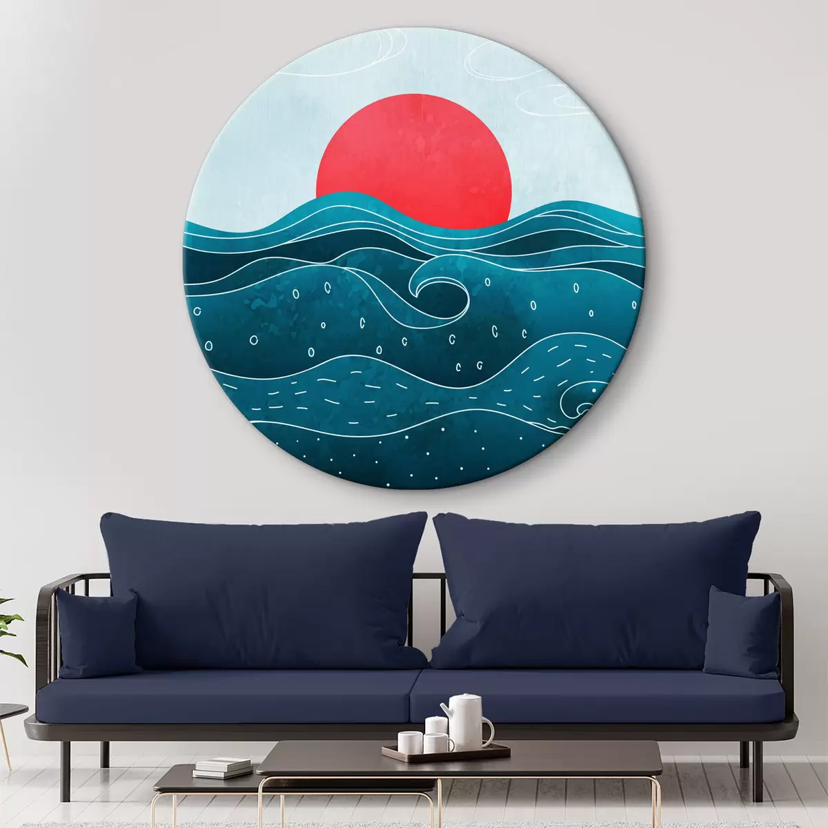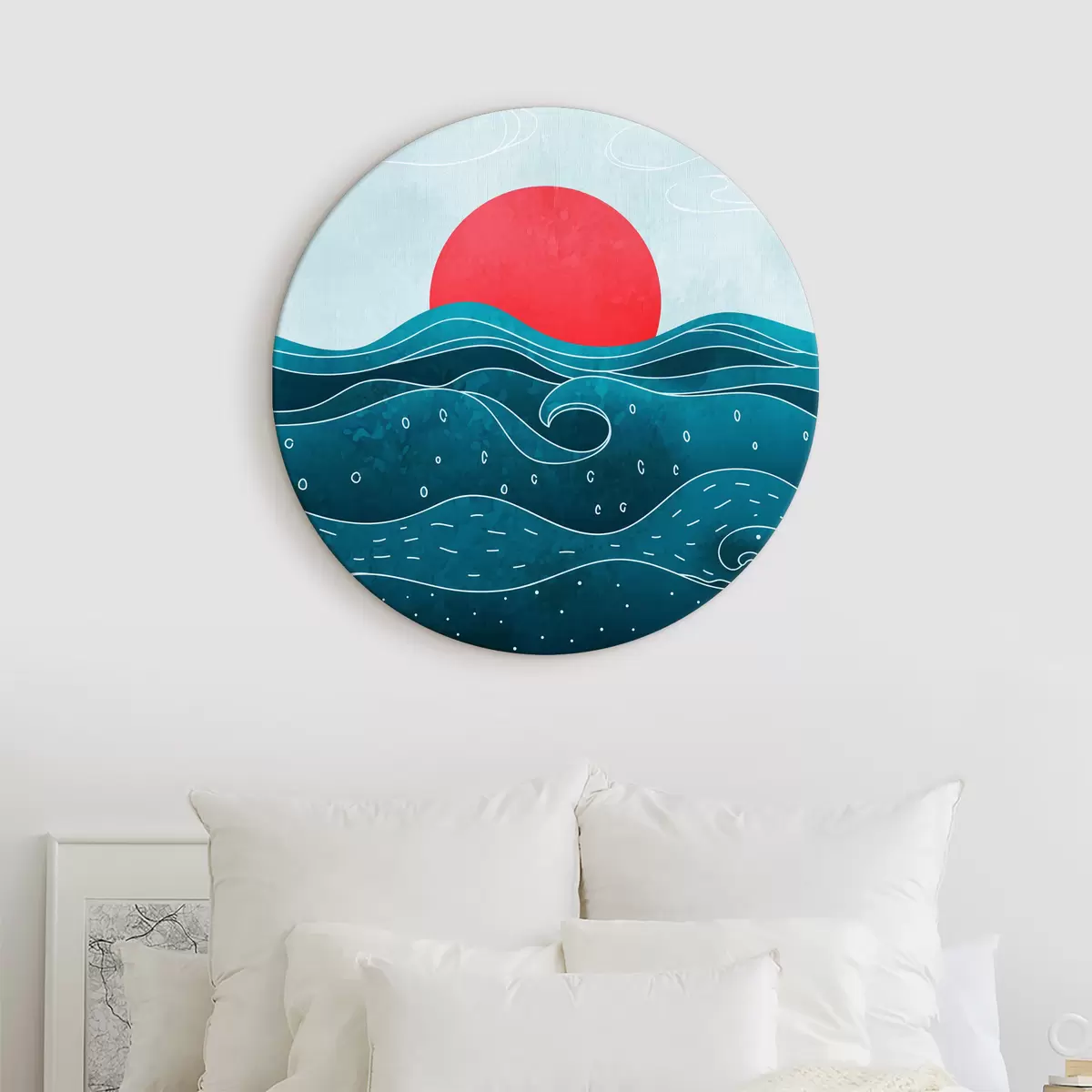 Runde Gemälde Wasser mit Wellen und roter Sonne r37640
