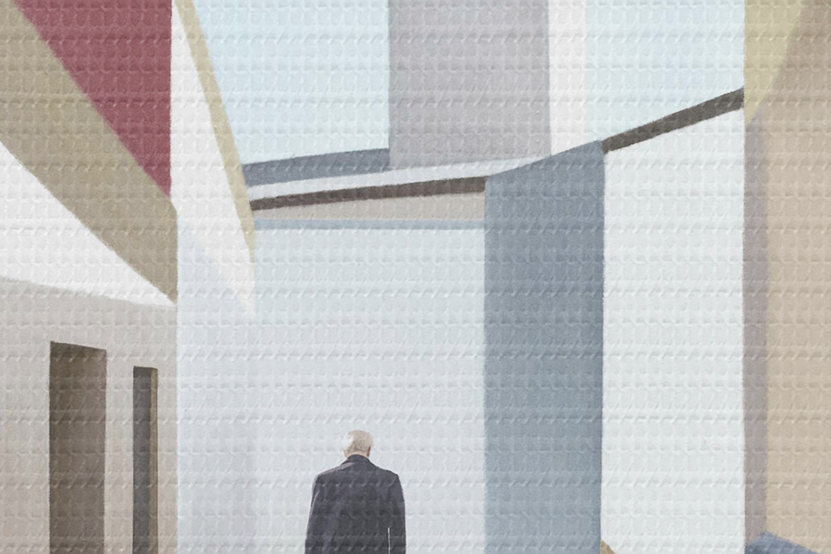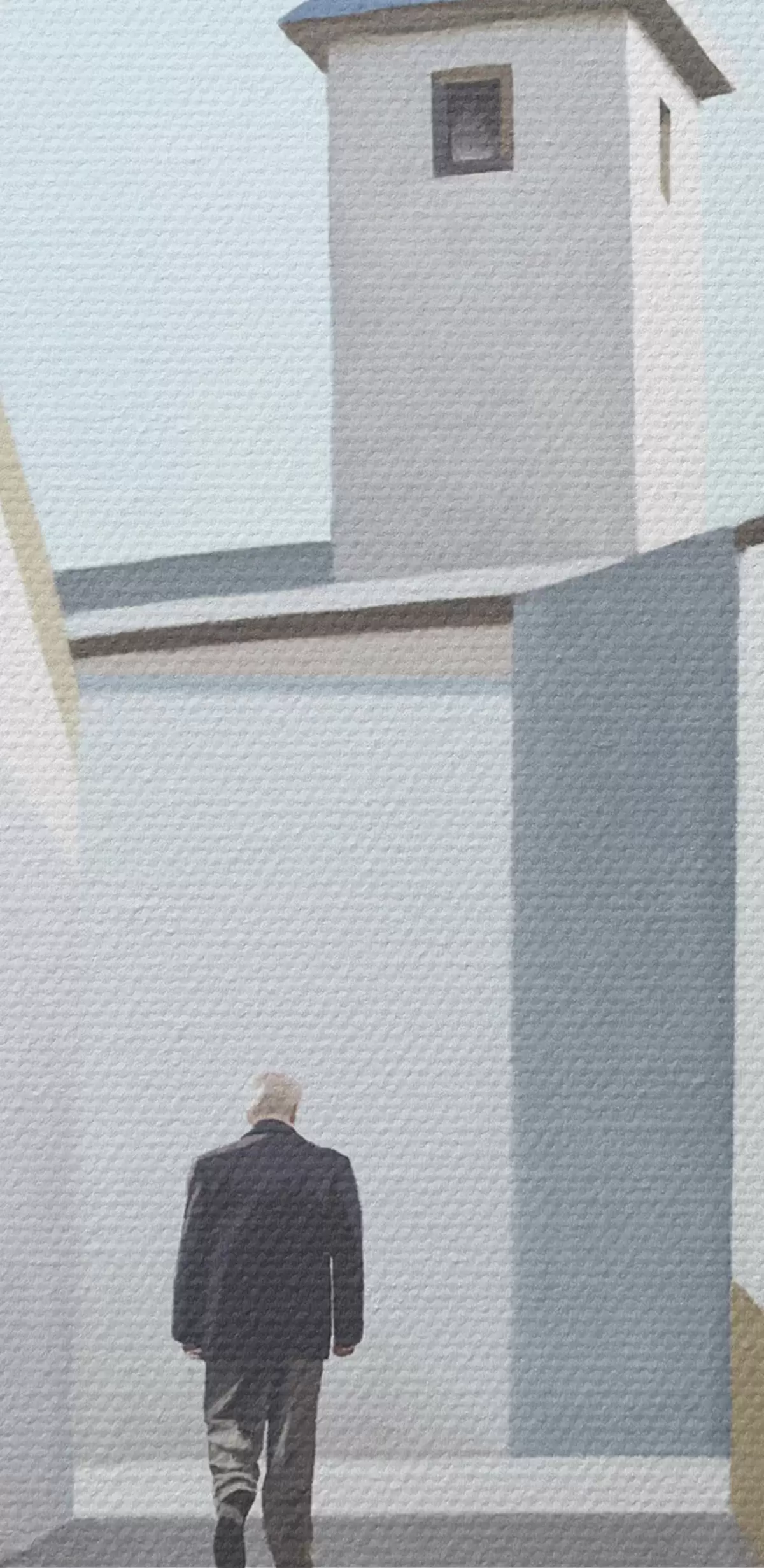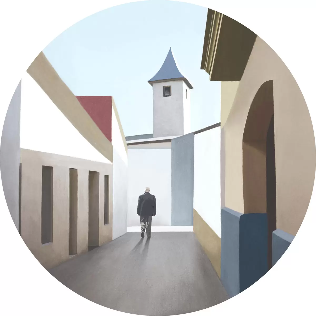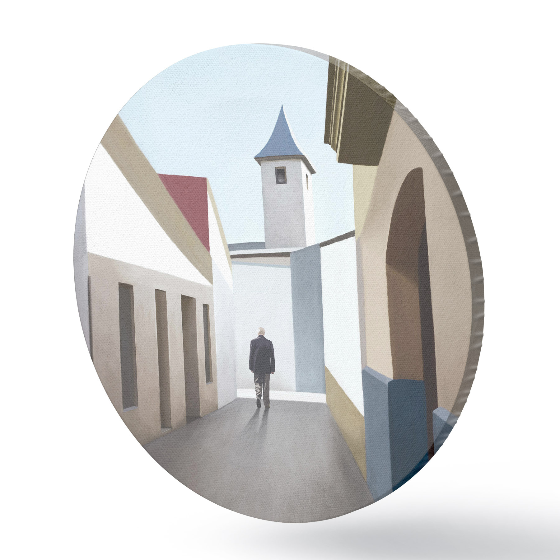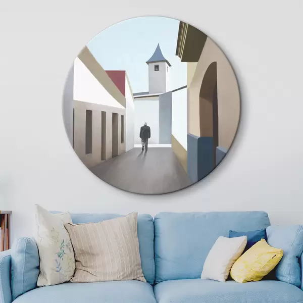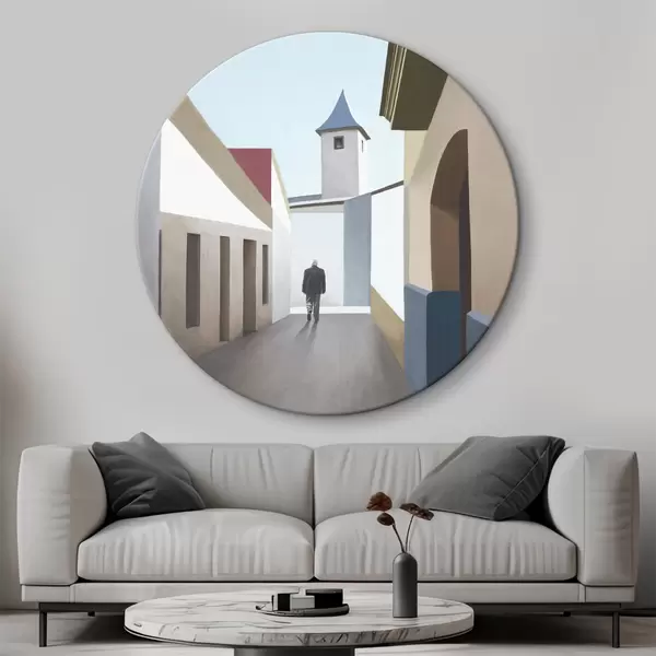 Runde Gemälde Ein Mann geht eine schmale Straße entlang r37784