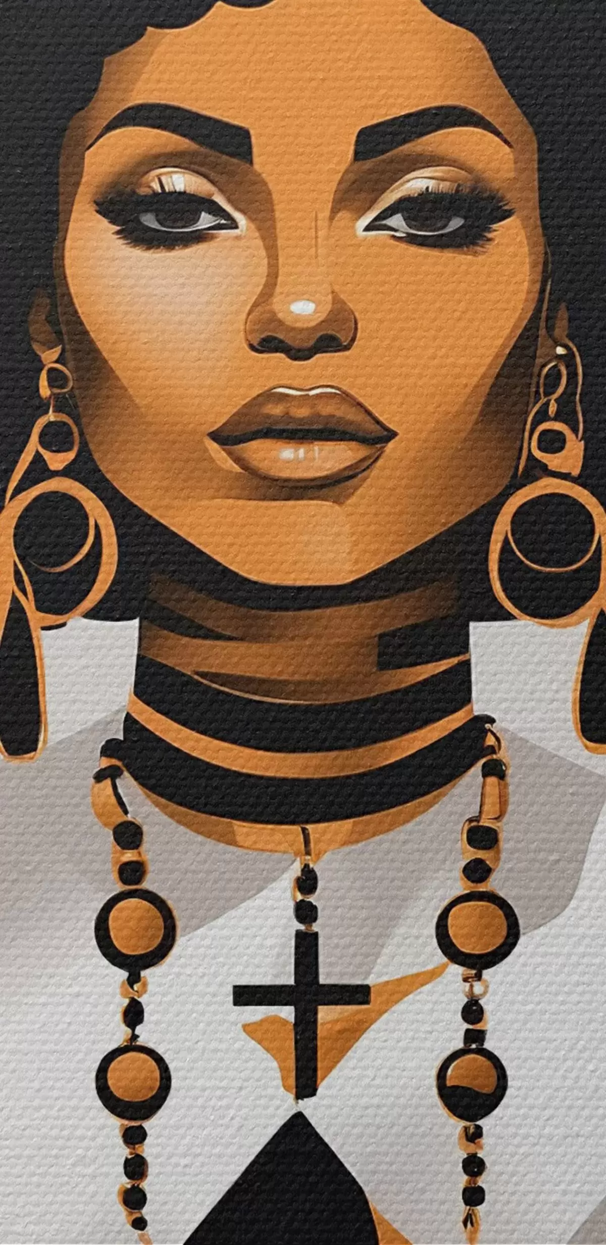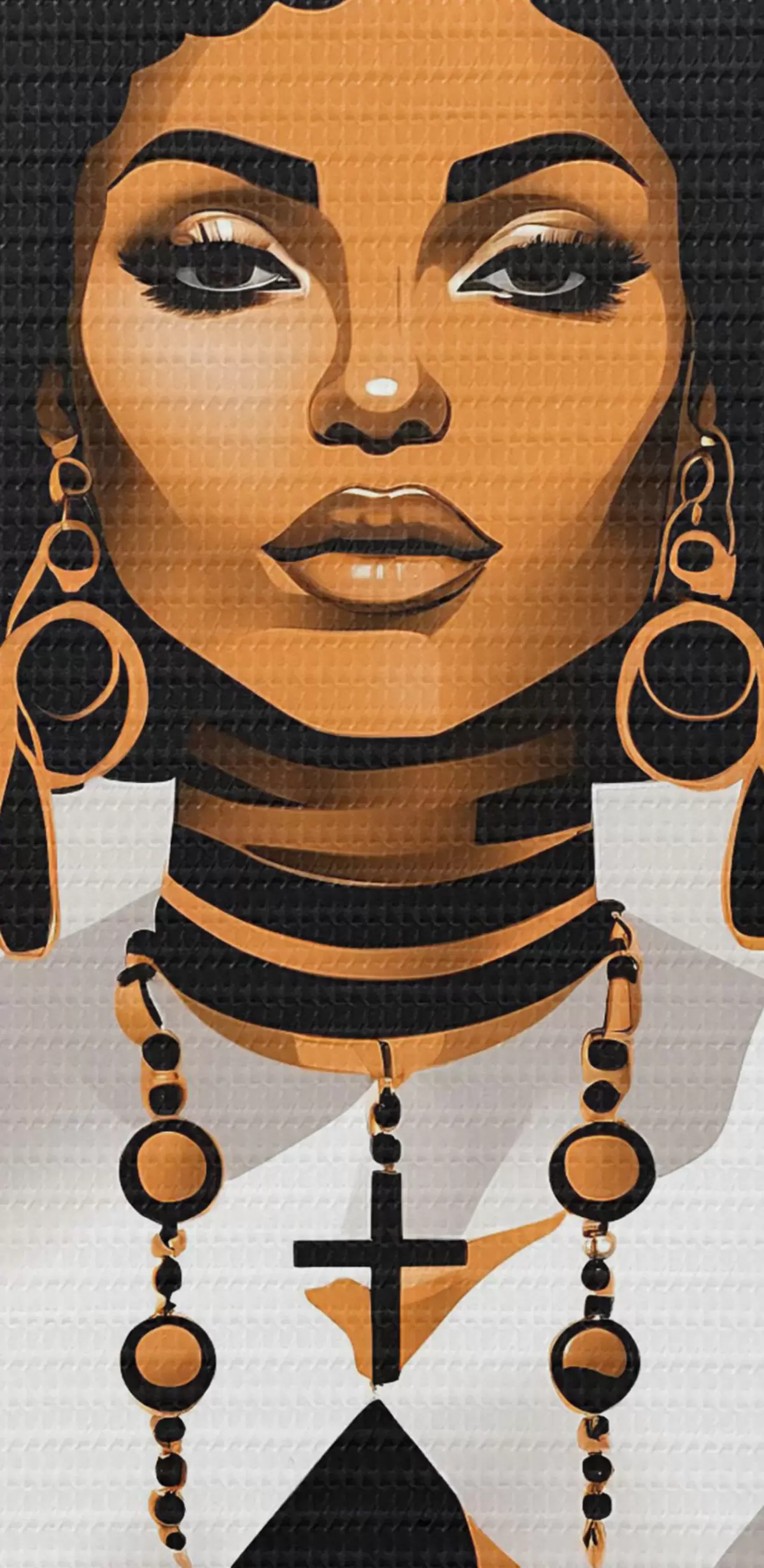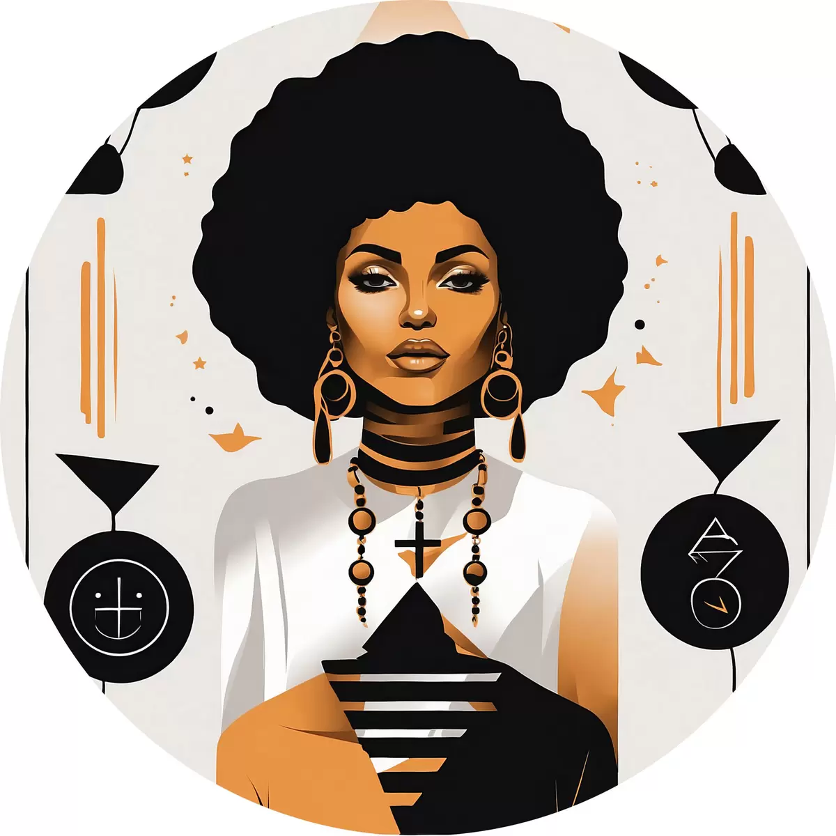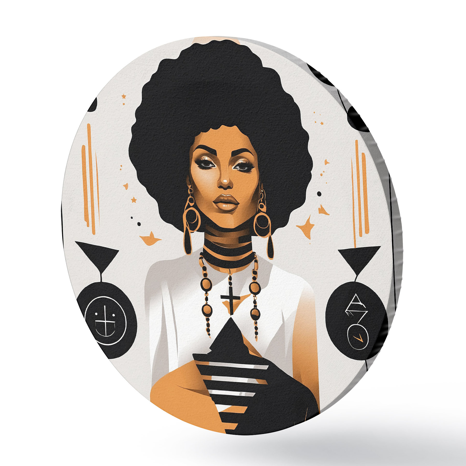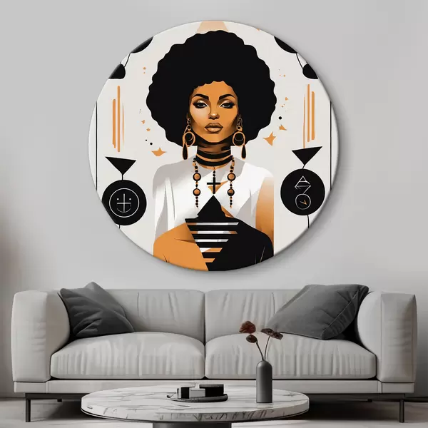 Runde Gemälde Eine Frau mit großem Afro, weißem Hemd und Ohrringen r37793