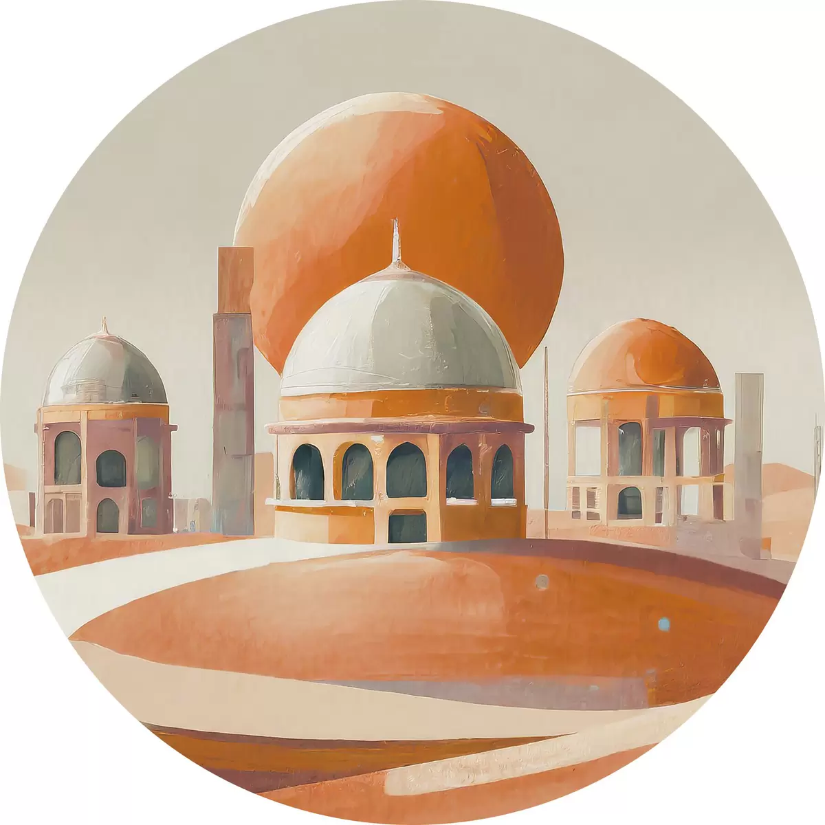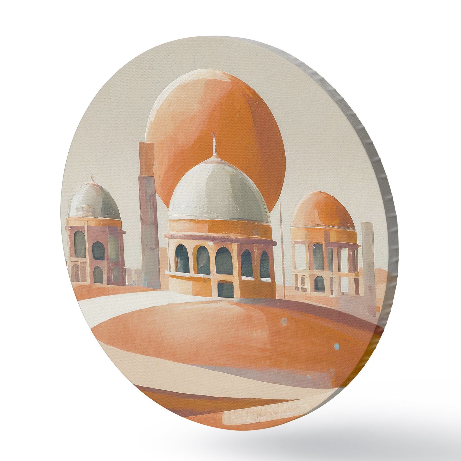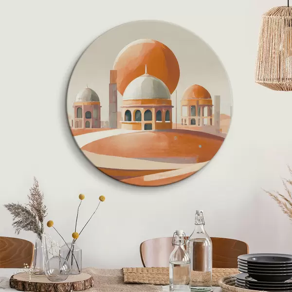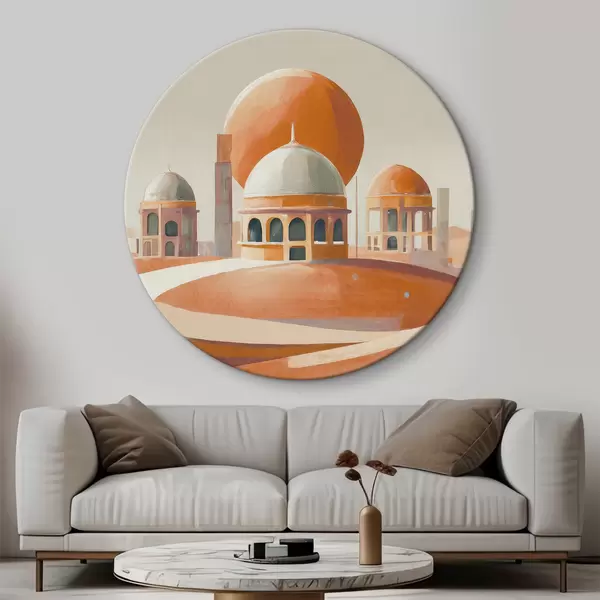 Runde Gemälde Wüstenlandschaft mit Gebäuden und einem großen orangefarbenen Ball r37812