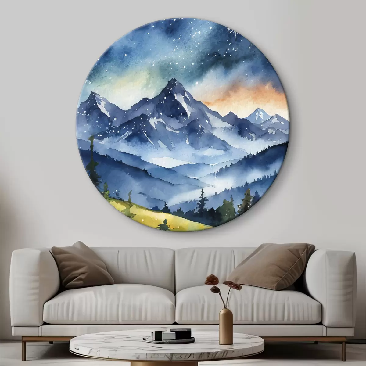 Runde Gemälde Aquarell Berglandschaft, Wald, sternenklarer Nachthimmel, Sonnenuntergang Farben r37946
