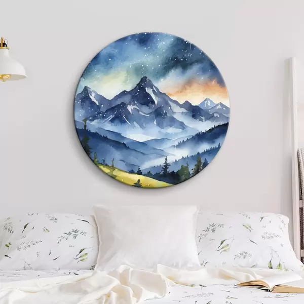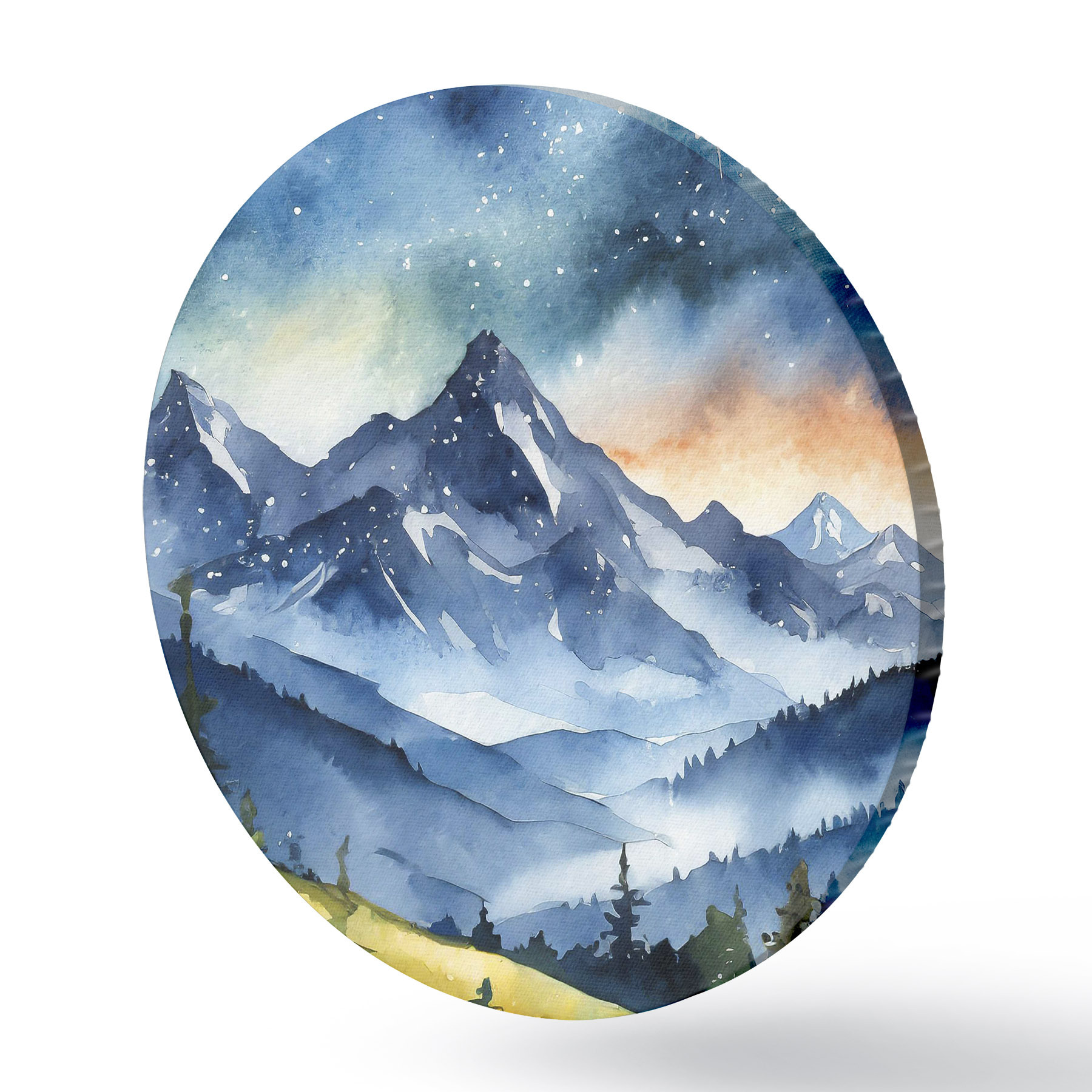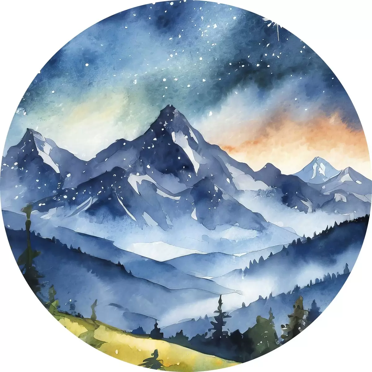 Runde Gemälde Aquarell Berglandschaft, Wald, sternenklarer Nachthimmel, Sonnenuntergang Farben r37946