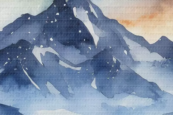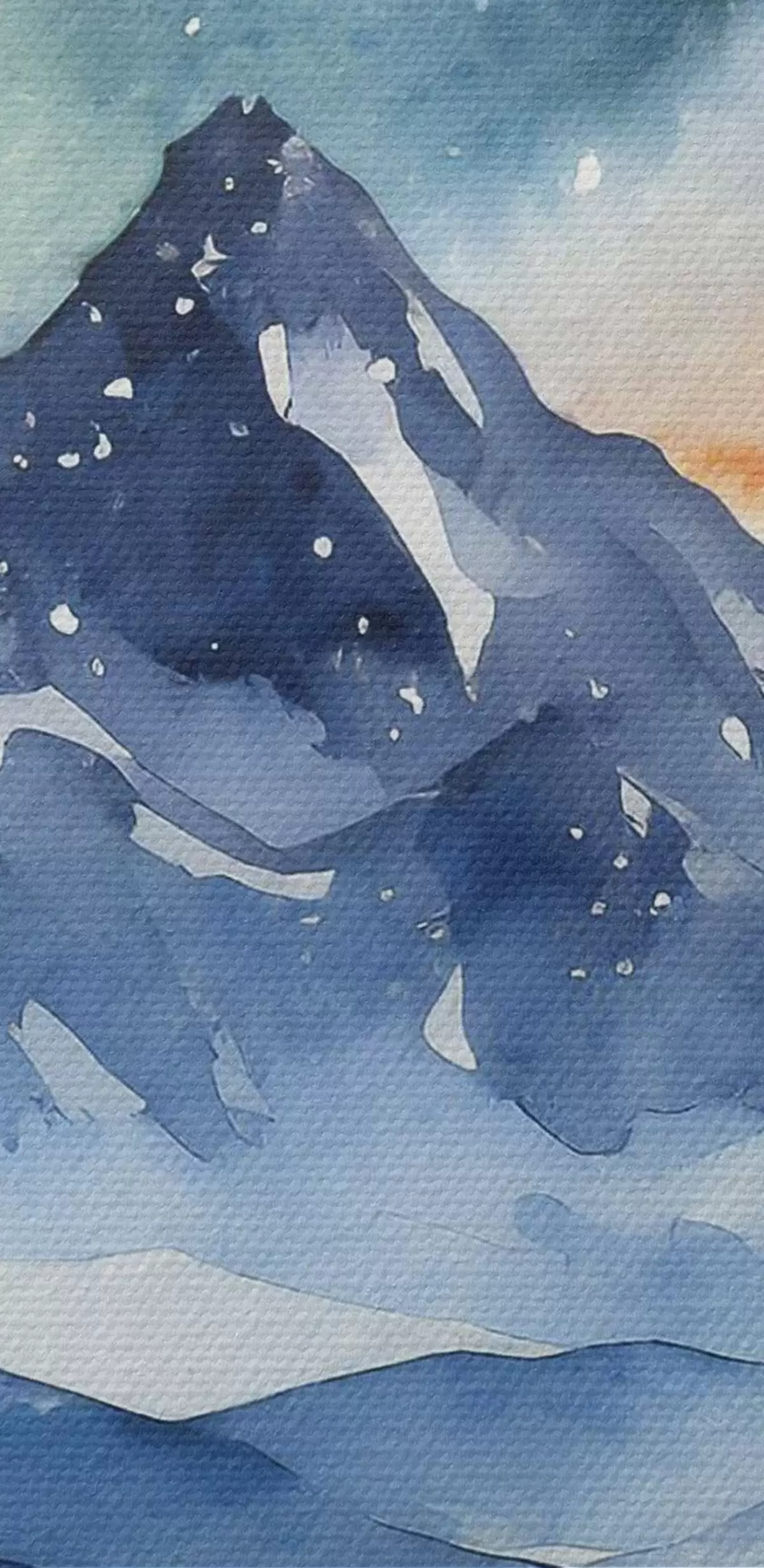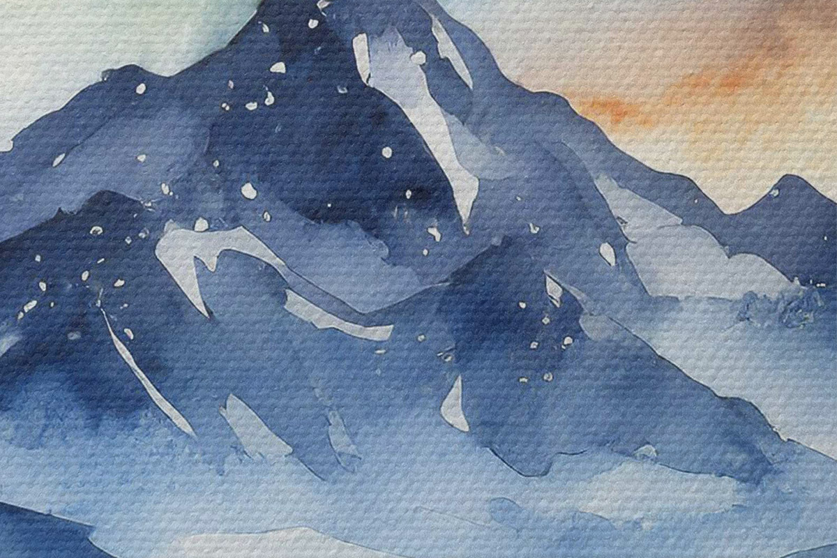 Bild Aquarell Berglandschaft, Wald, sternenklarer Nachthimmel, Sonnenuntergang Farben Nr r37946