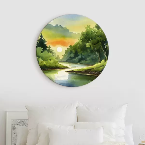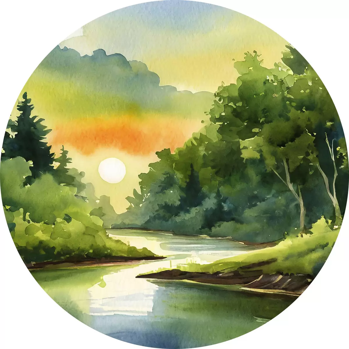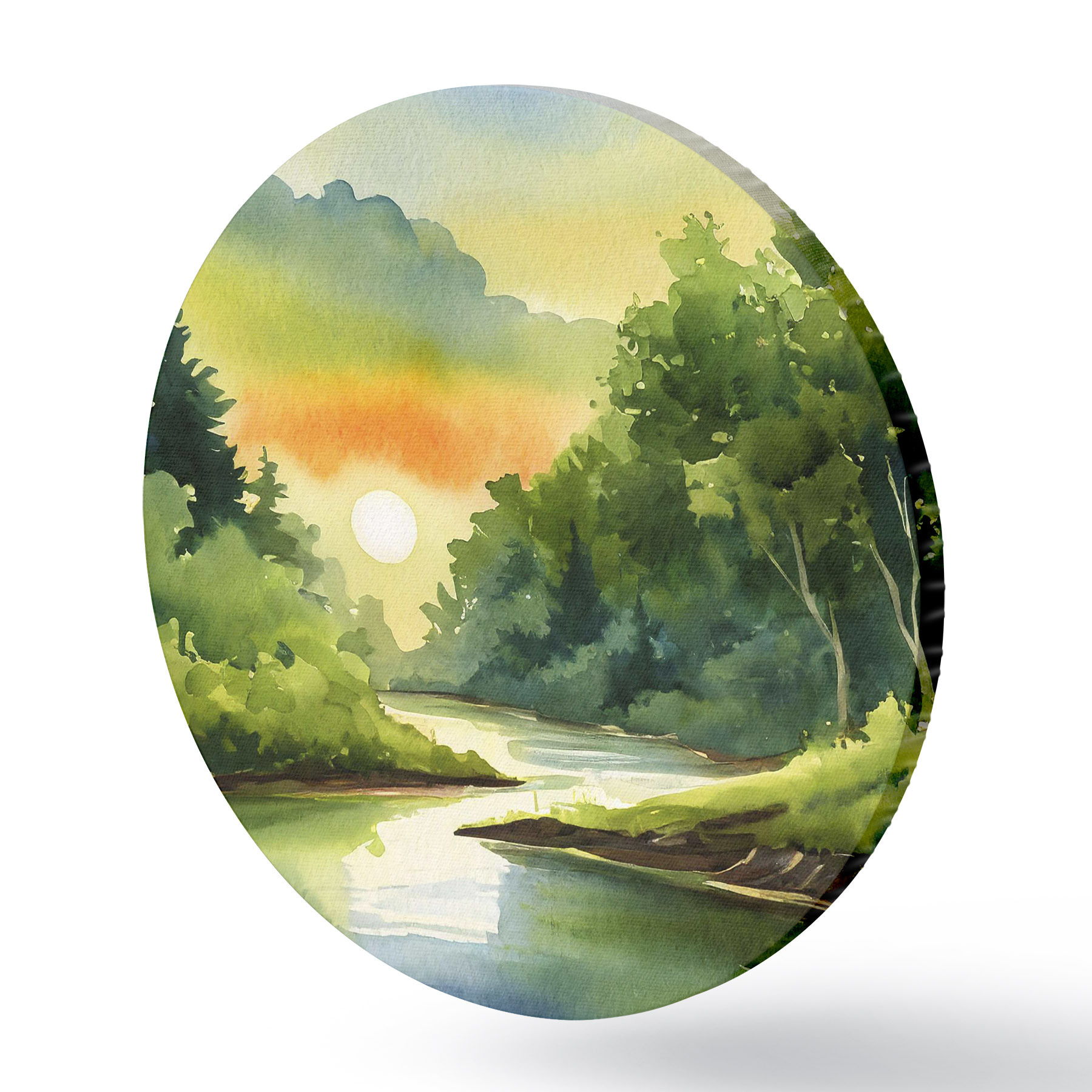 Runde Gemälde Sonnenuntergang am Fluss, Wald, Aquarell, Sonnenuntergang, grün, Natur r37949