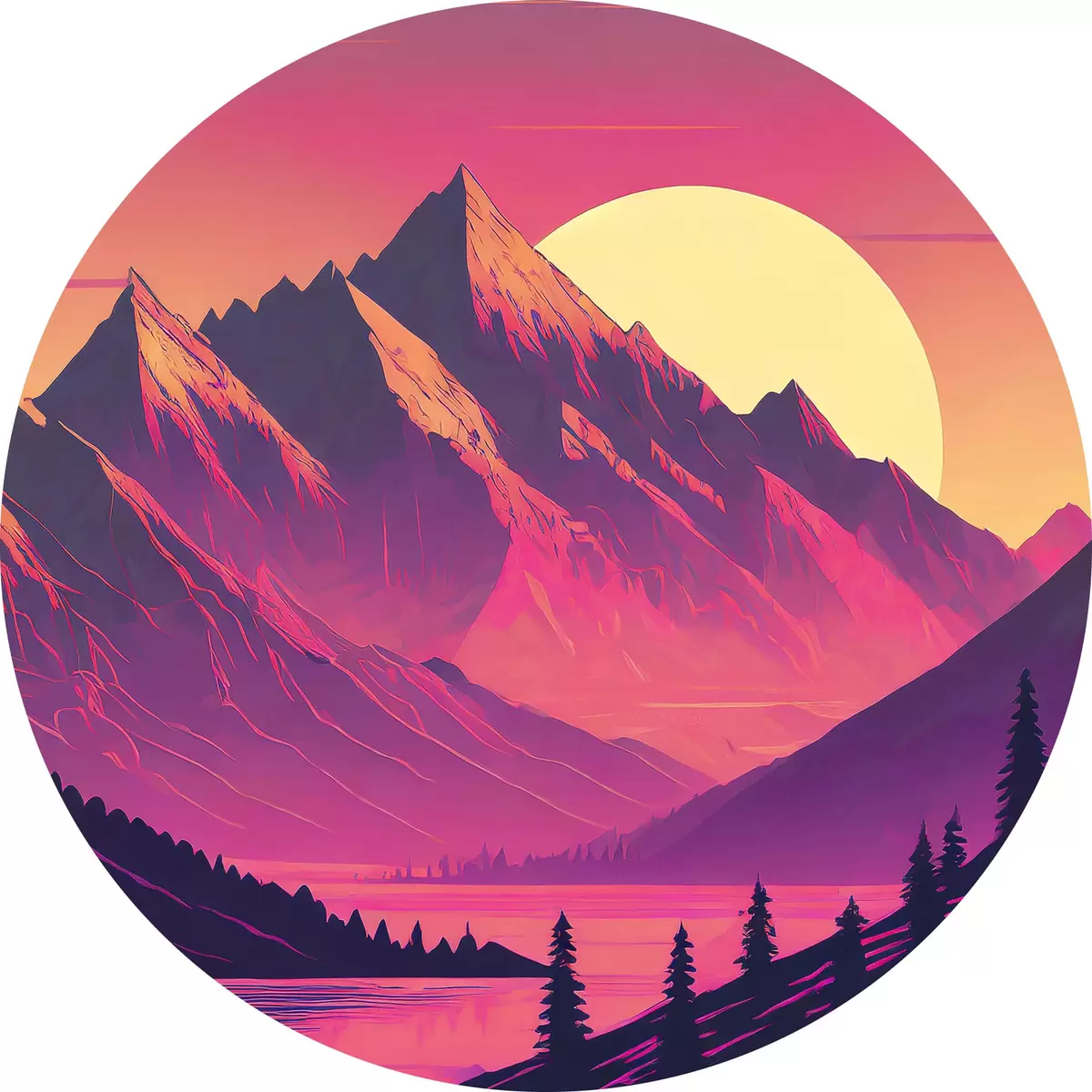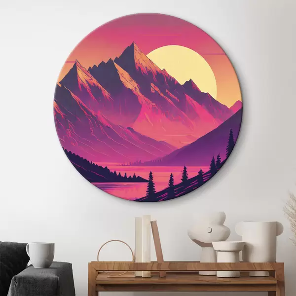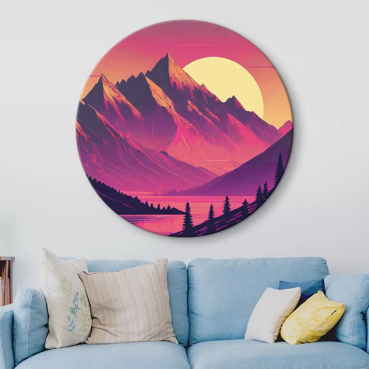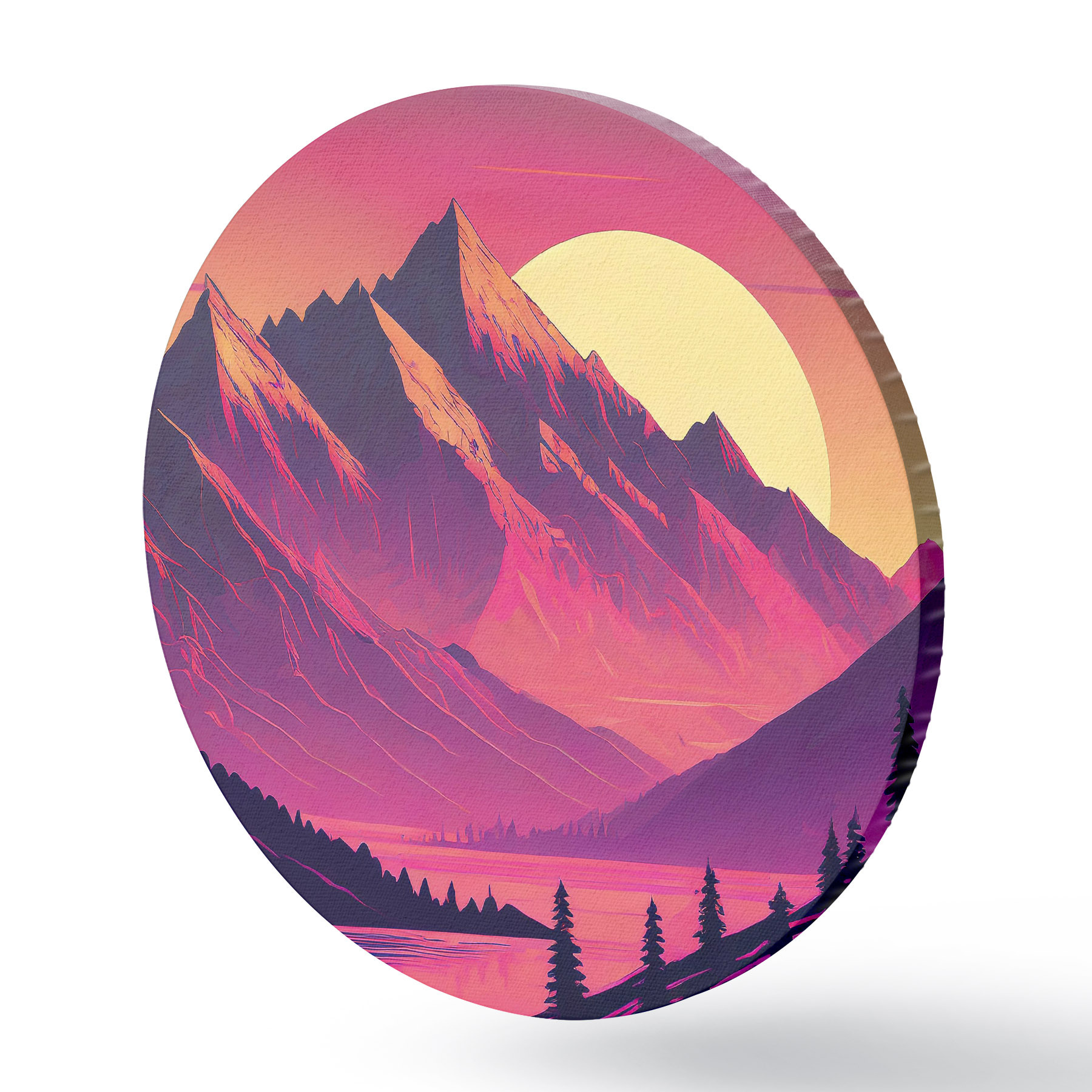 Runde Gemälde Abstrakte Berglandschaft, leuchtende Farben, rosa, Sonnenuntergang Himmel, futuristisch, Sonne, Wald r38000