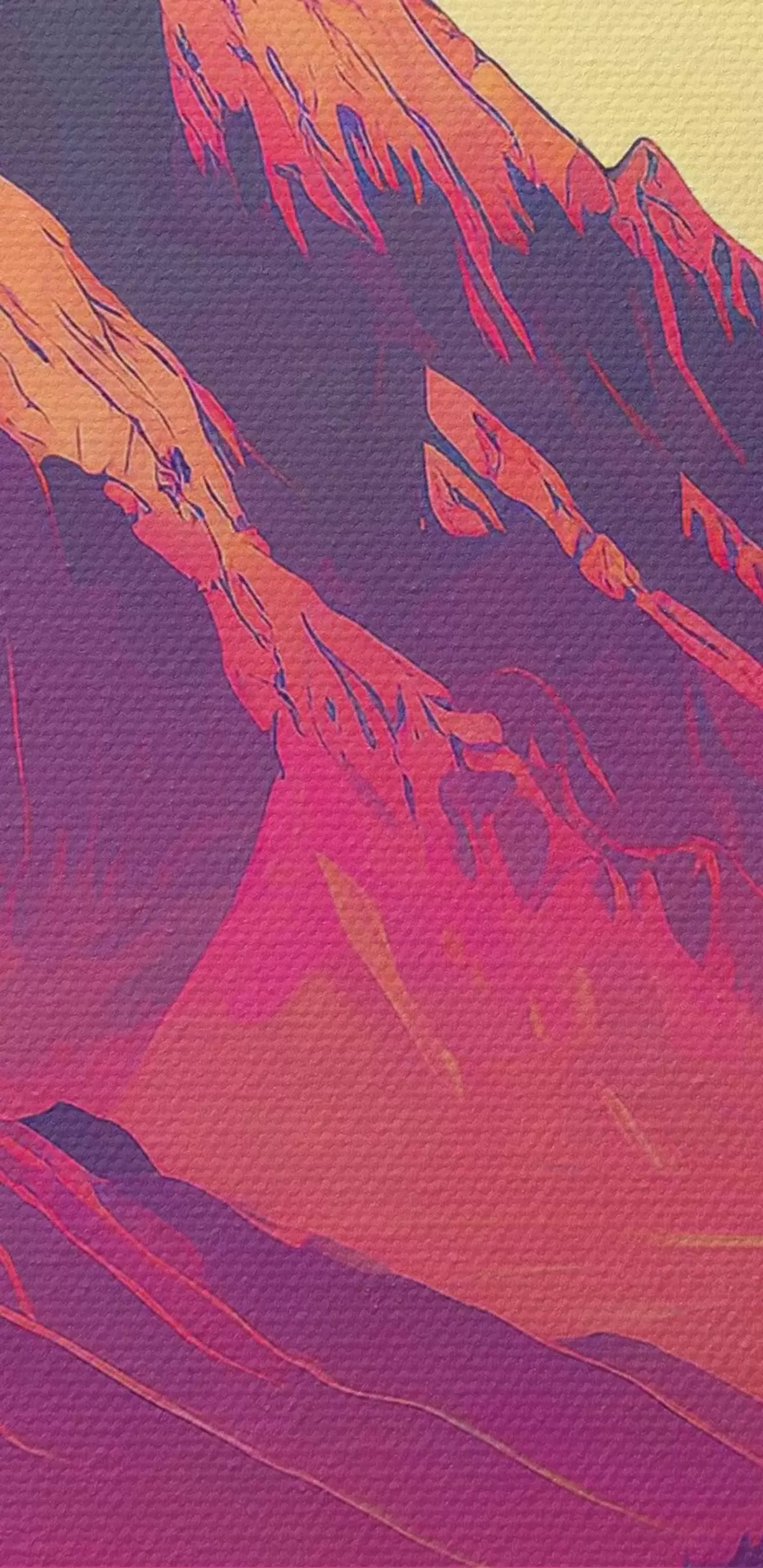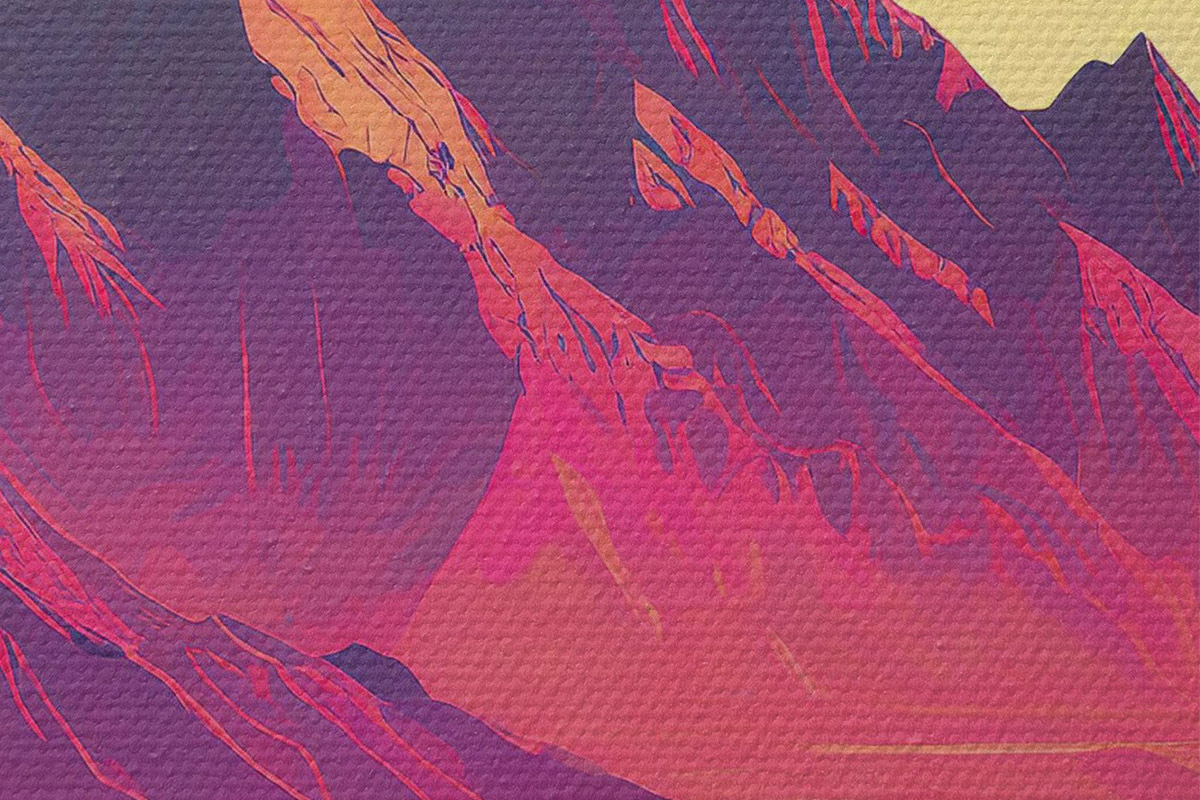 Bild Abstrakte Berglandschaft, leuchtende Farben, rosa, Sonnenuntergang Himmel, futuristisch, Sonne, Wald Nr r38000