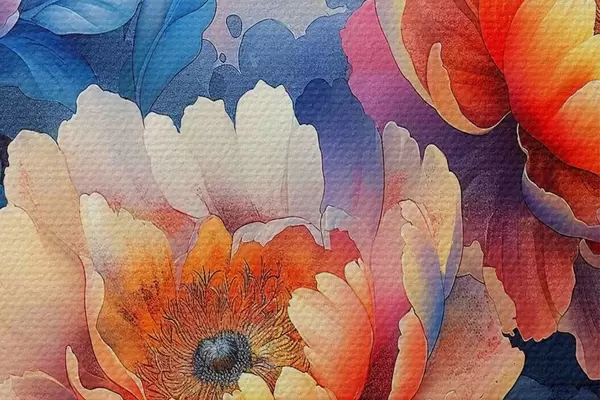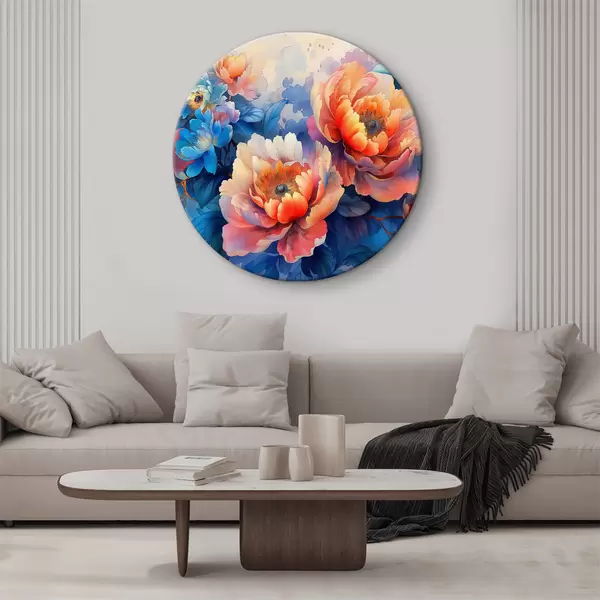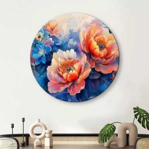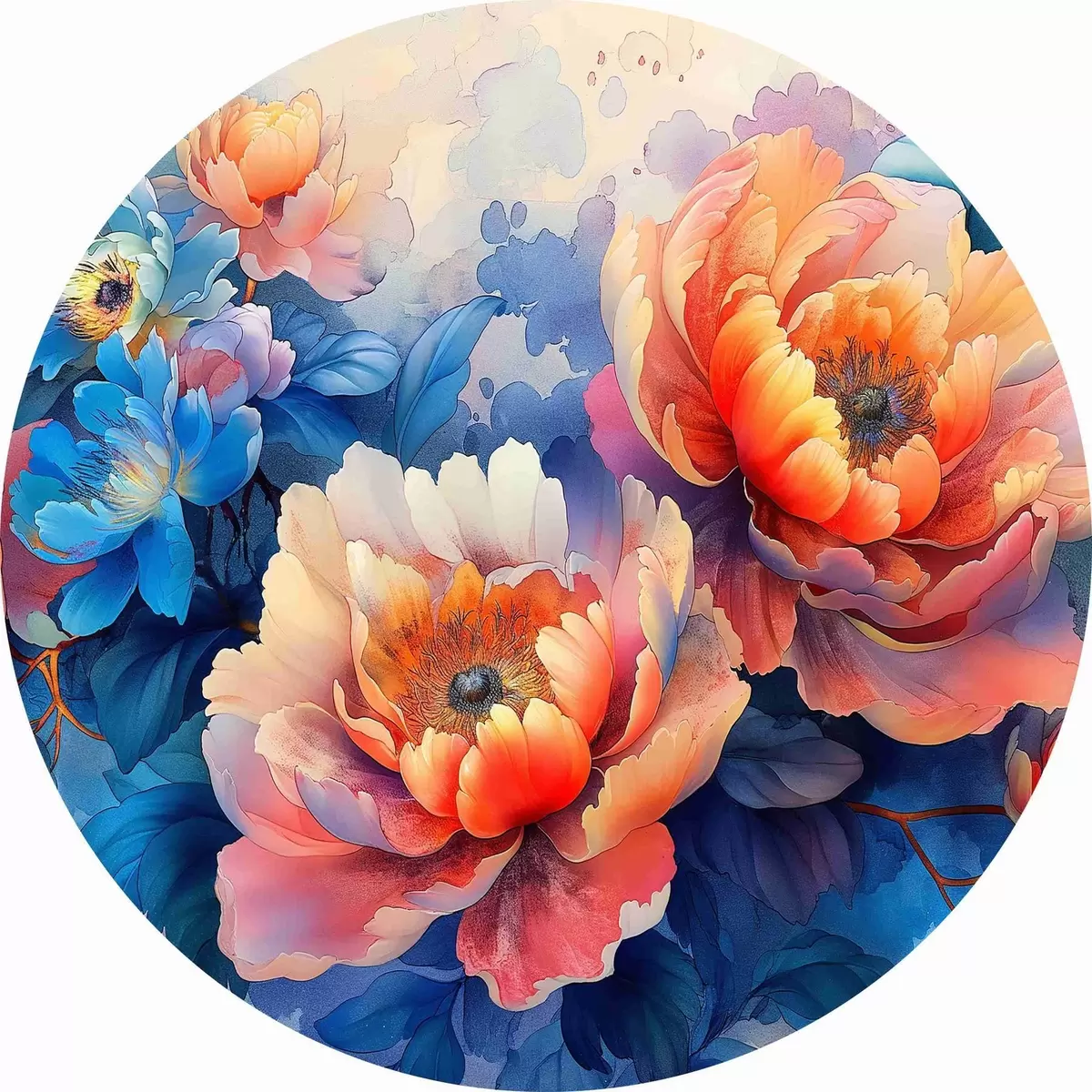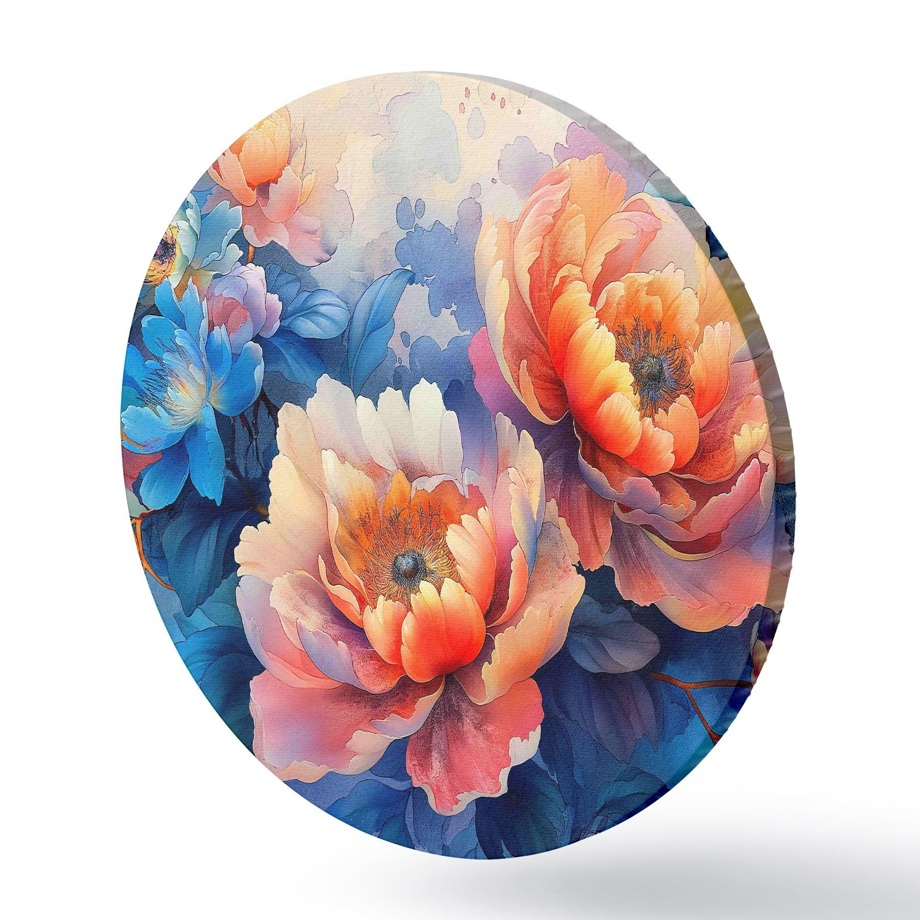 Runde Gemälde Bild von Blumen auf einem blauen Hintergrund r38088