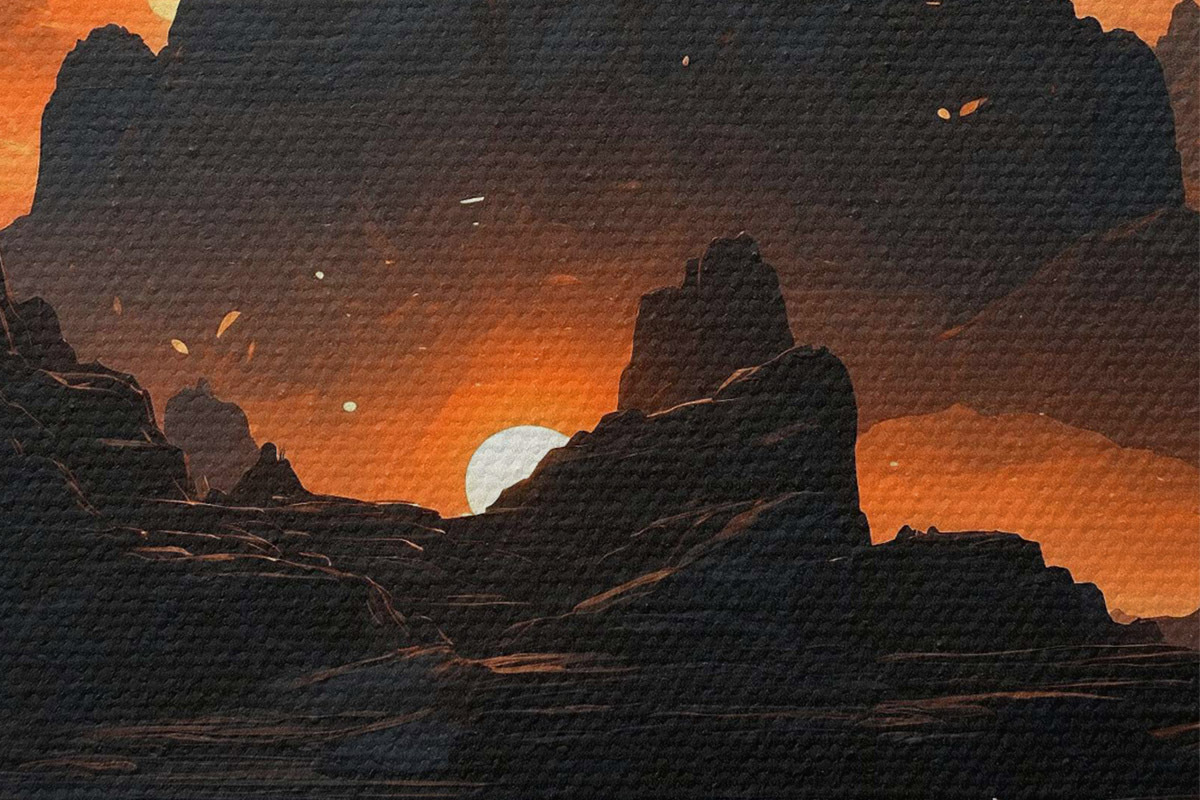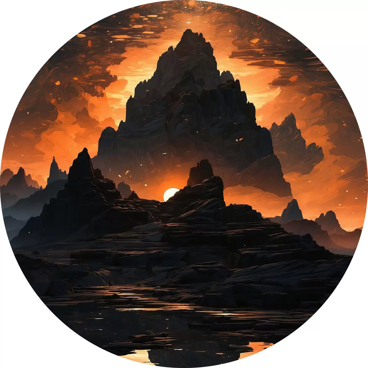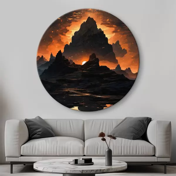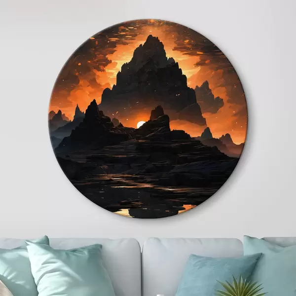 Runde Gemälde Gebirge mit untergehender Sonne im Hintergrund r38120
